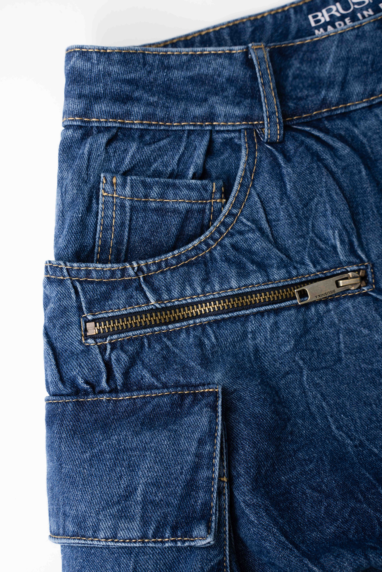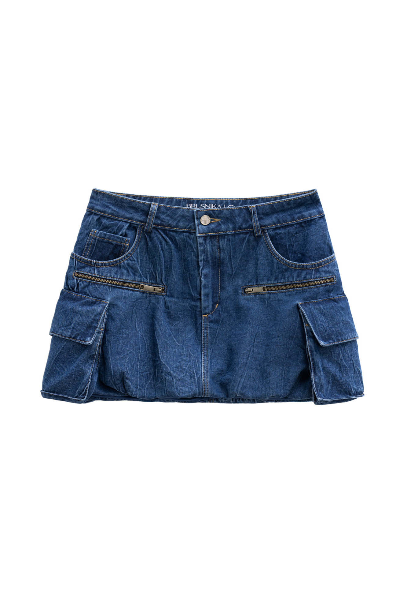 Джинсовая мини-юбка баллон из 100% хлопка. Модель с большими накладными карманами с клапанами по бокам, врезными карманами, шлевками на поясе для ремня и застежкой на молнию и пуговицу.