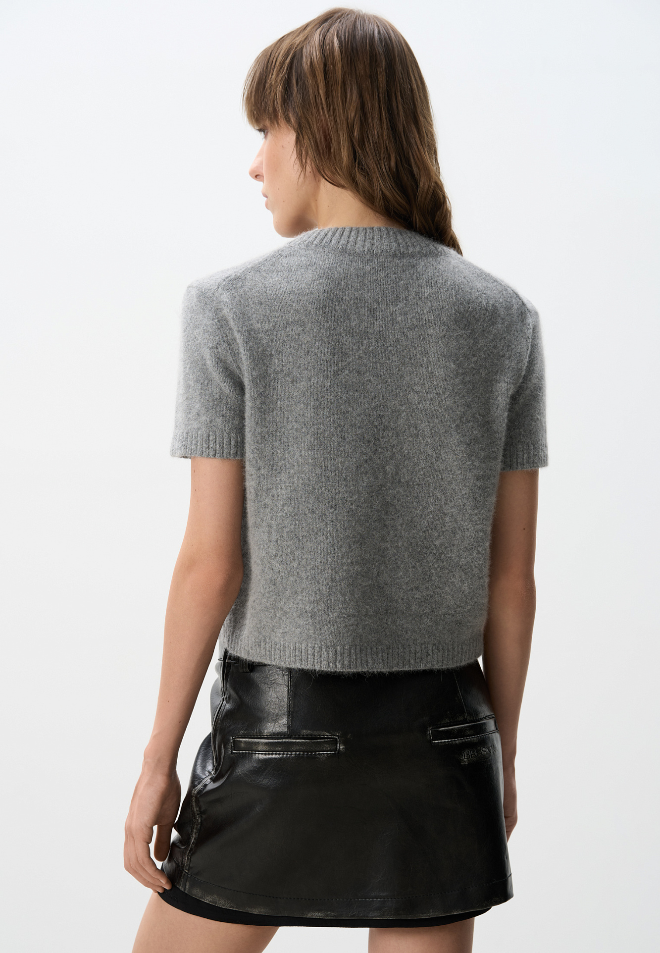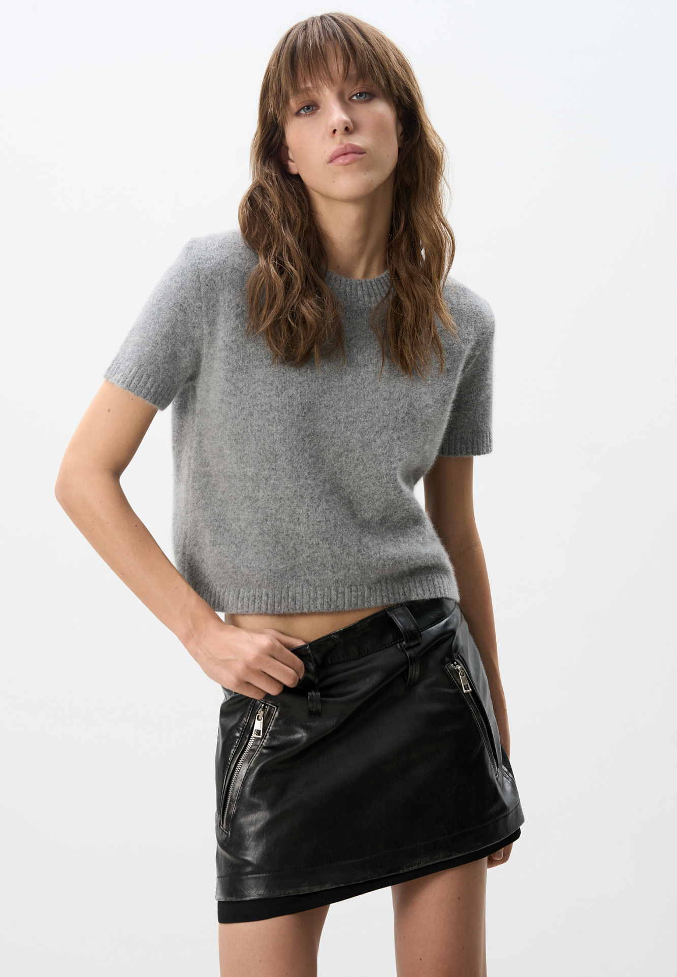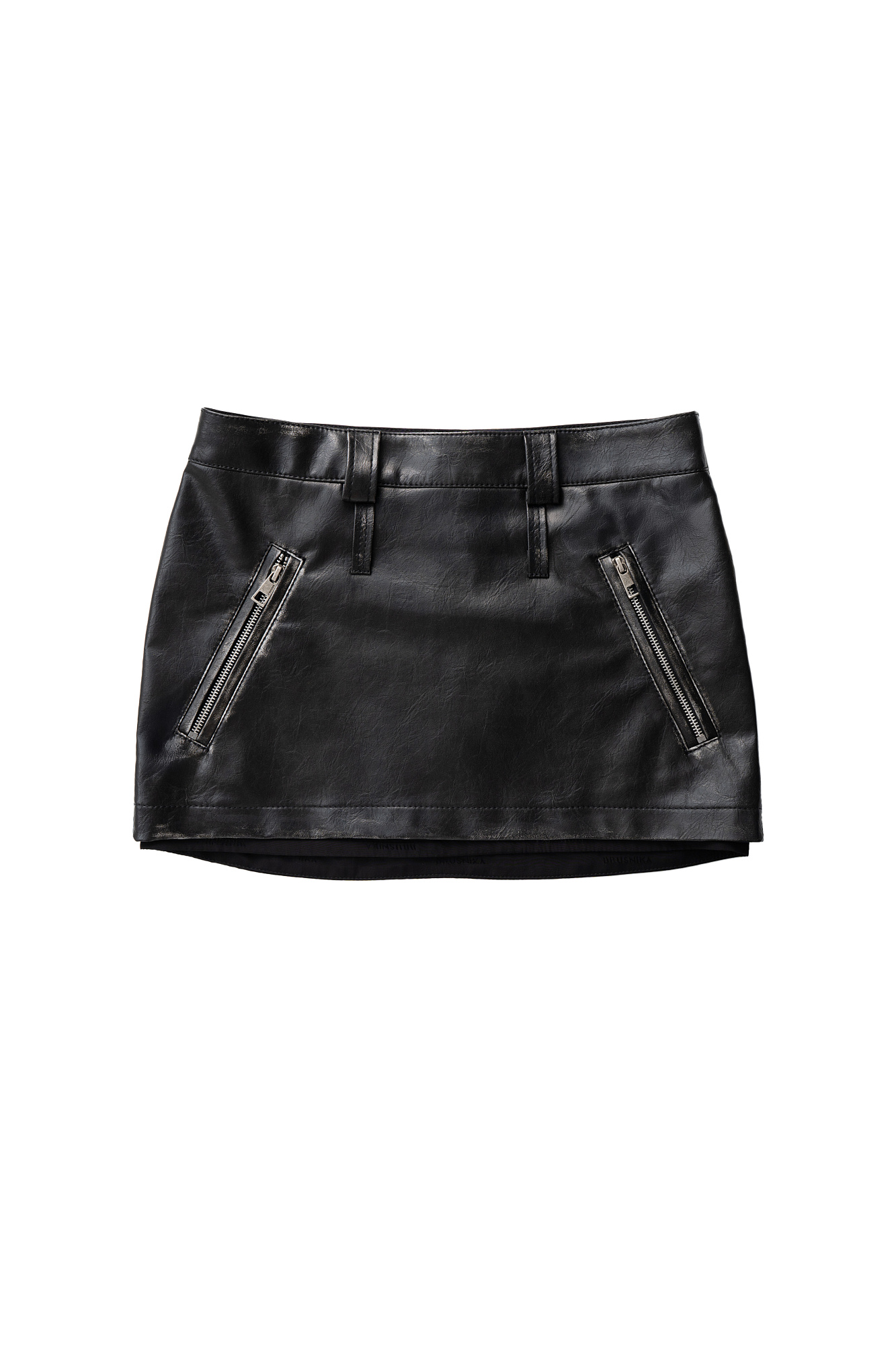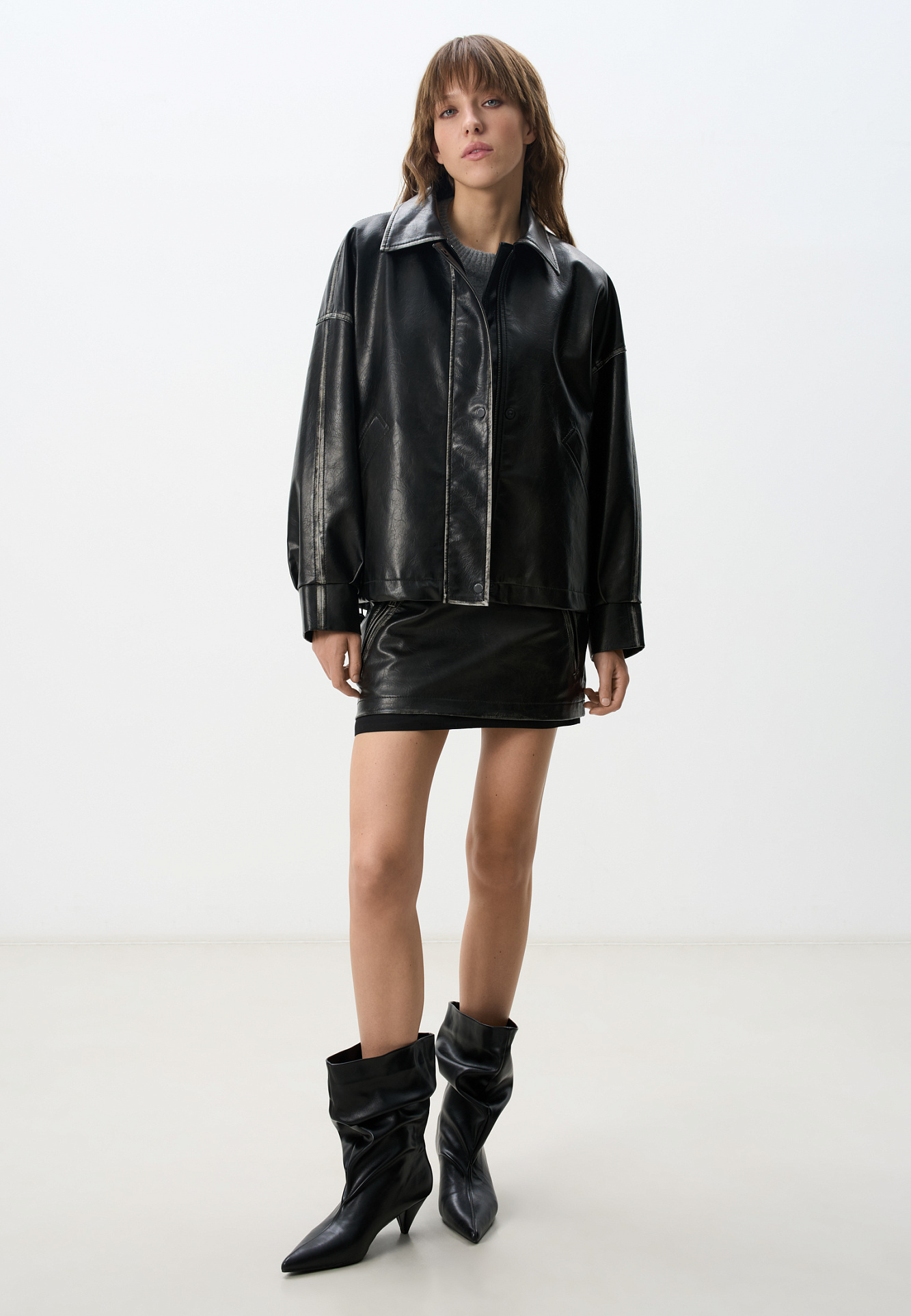 Юбка длины мини из экокожи. Модель по фигуре, со шлевками на поясе для ремня и карманами сзади. Изделие декорировано имитацией потертостей по швам и логотипом бренда. На подкладке. Застежка на молнию сбоку.