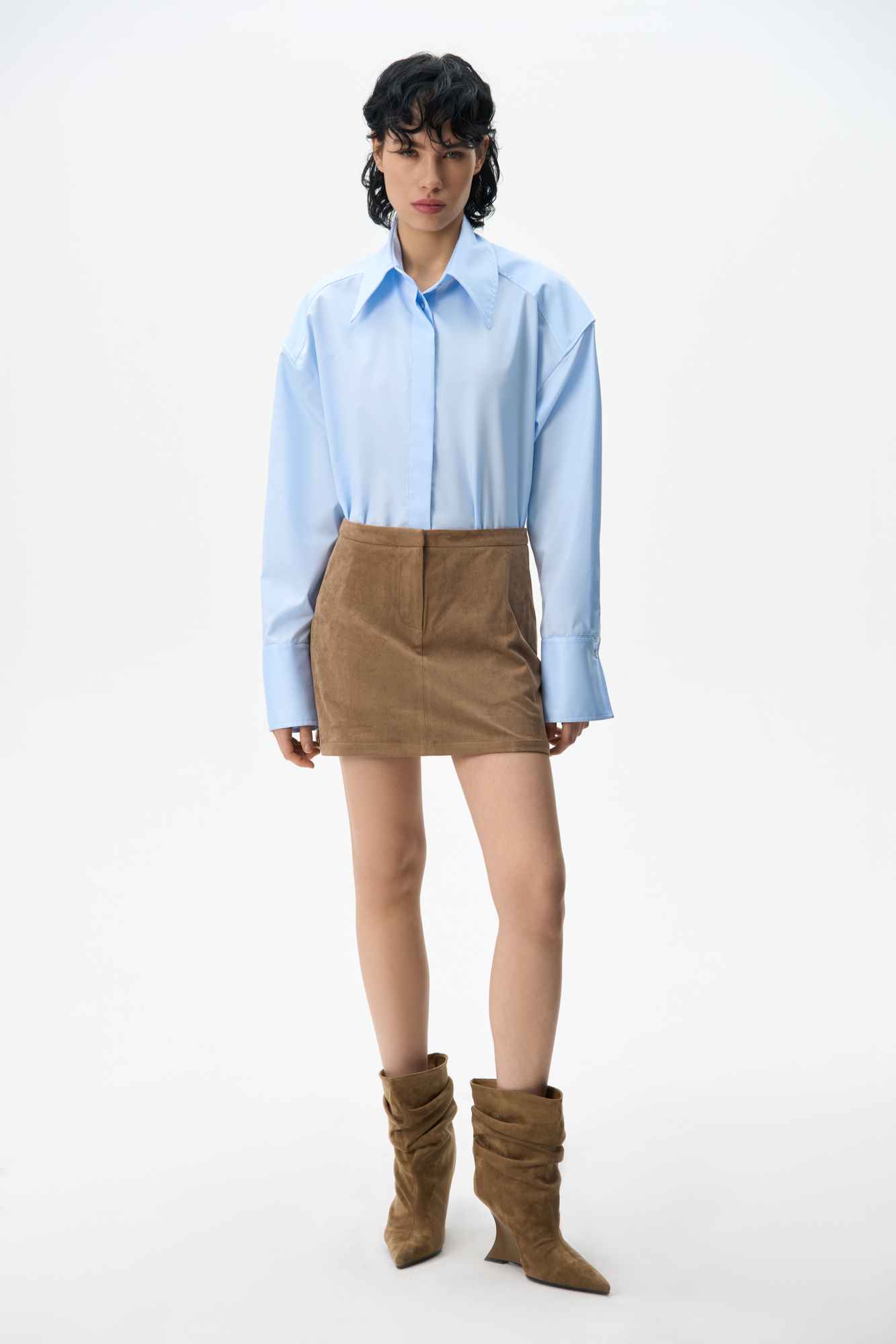 Юбка длины мини из ткани с имитацией внешнего вида и свойств натуральной замши. Застежка на скрытую пуговицу и молнию спереди.