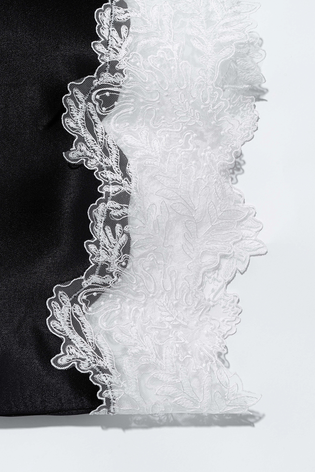Атласная юбка длины миди с контрастным кружевом. Застежка на потайную молнию.