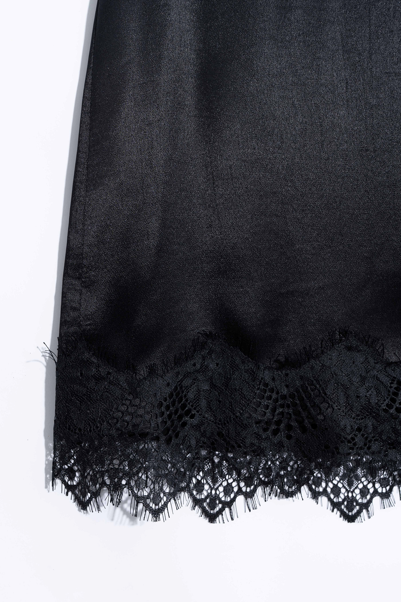 Атласная юбка длины мини. Модель с асимметричным низом, декорированным кружевом. Застежка на потайную молнию.