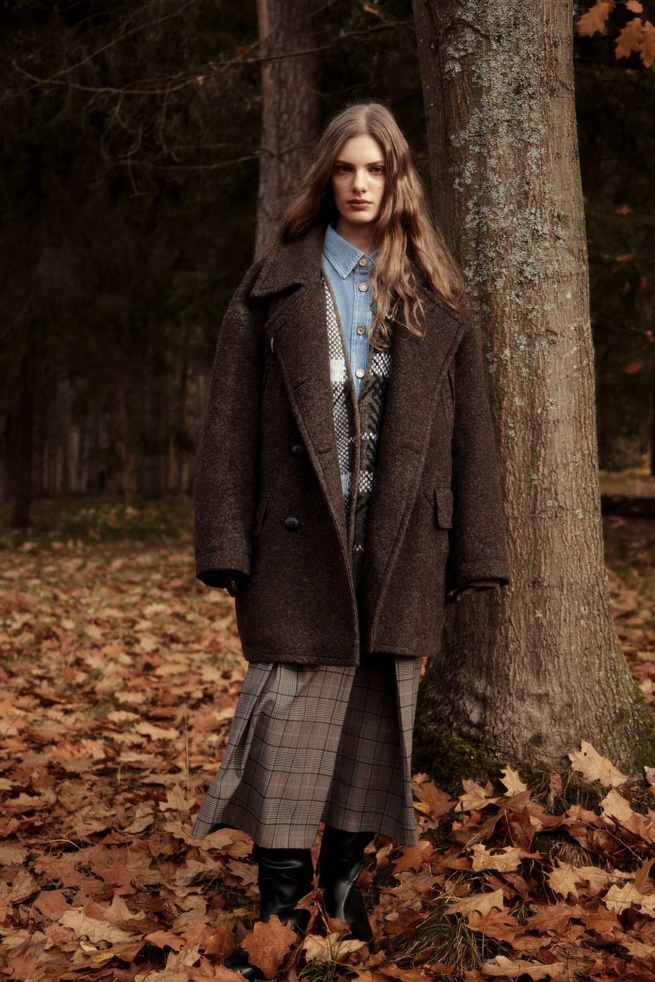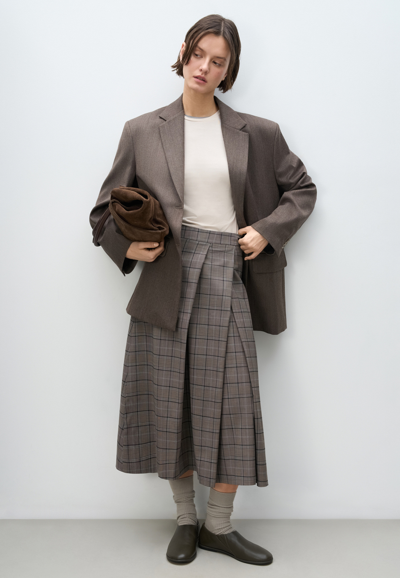 Юбка длины миди из шерсти в клетку. Модель А-силуэта с крупными косыми складками спереди. Застежка на молнию сзади. Изделие без подкладки.