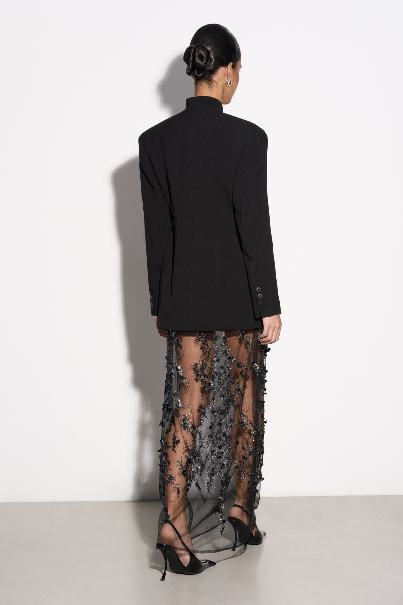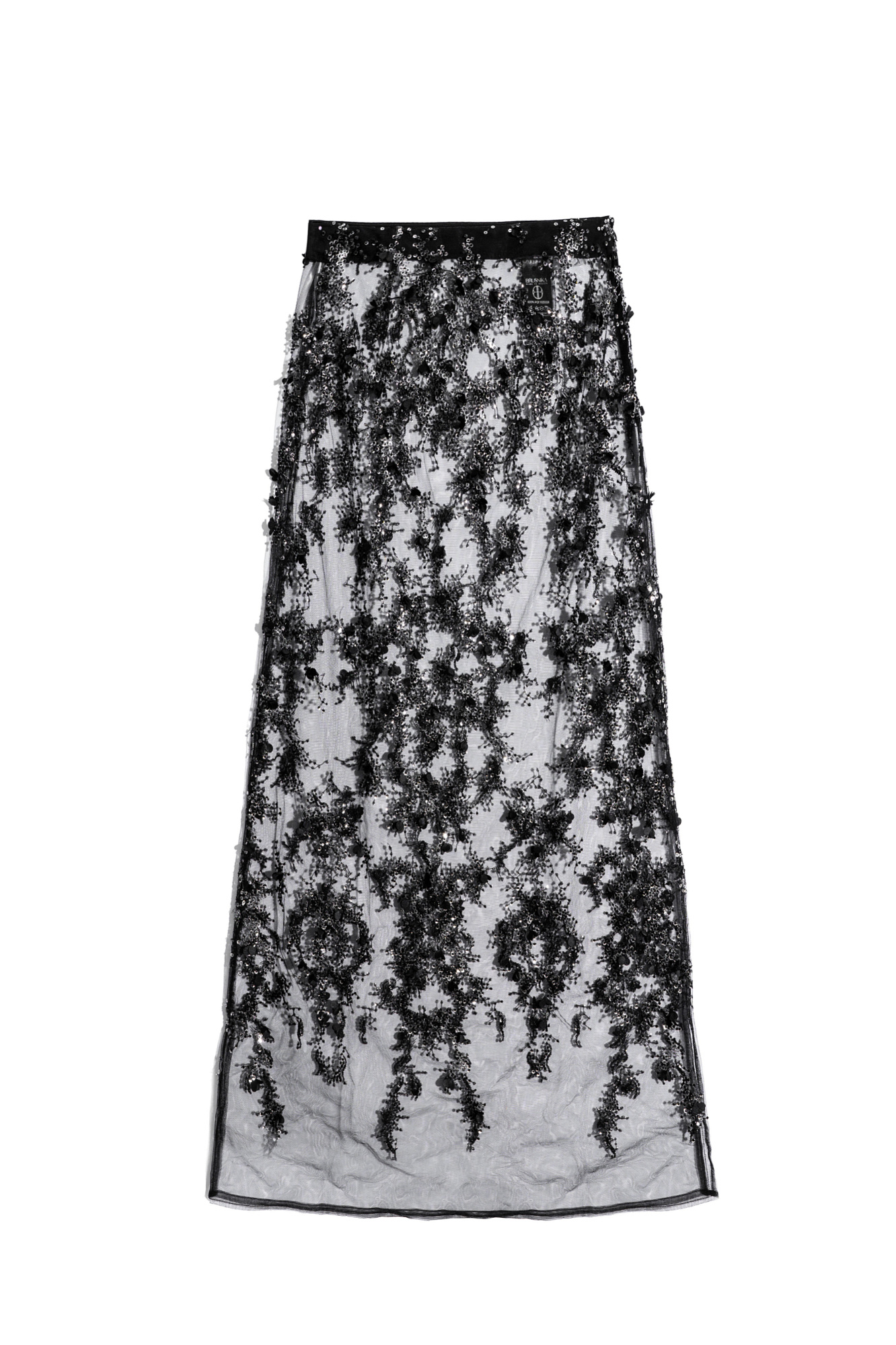 Юбка длины макси с цветочным орнаментом, вышитым пайетками. Застежка на потайную молнию. Изделие без подкладки.