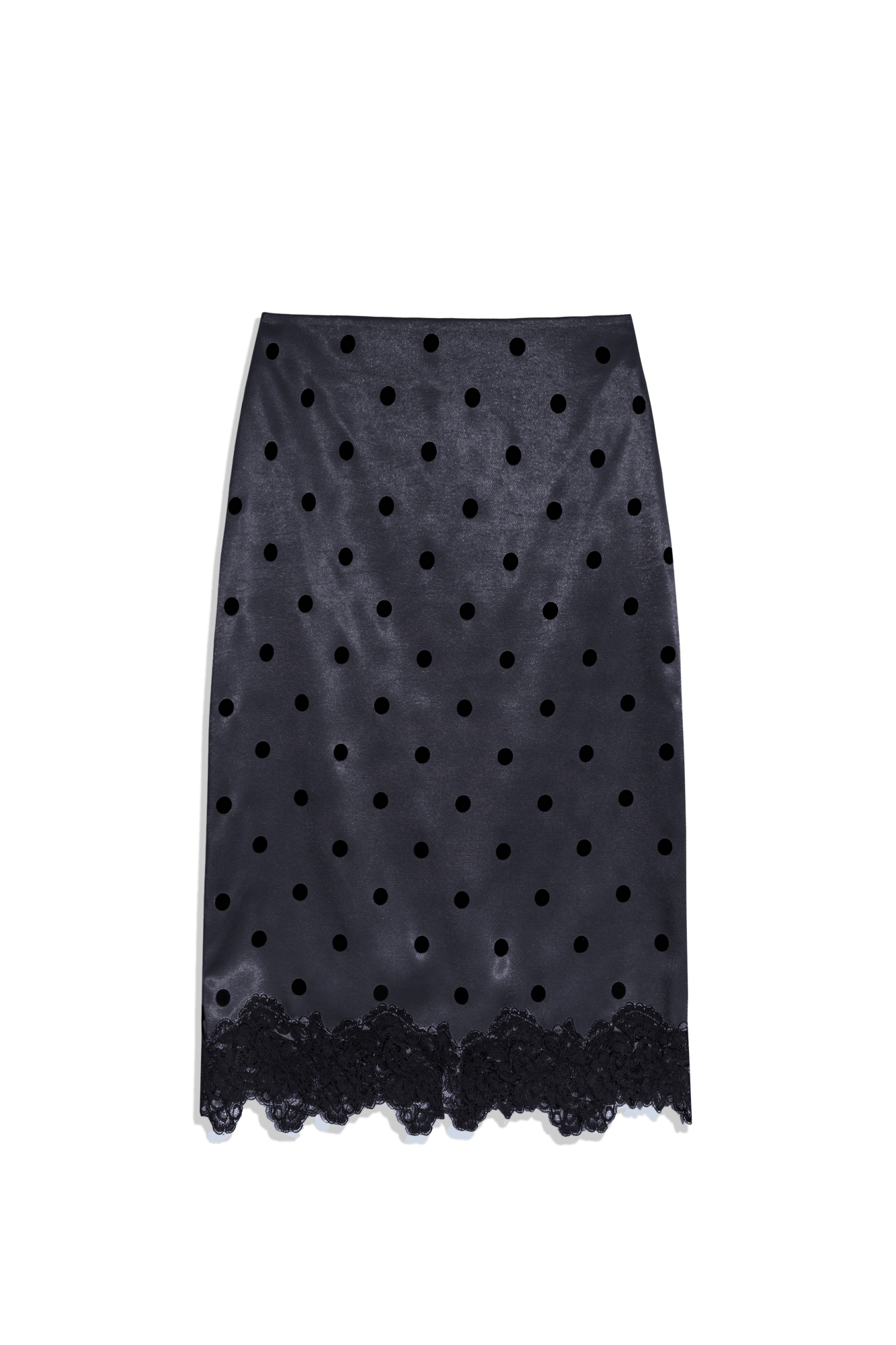 Атласная юбка в горох длины миди. Модель по фигуре с застежкой на потайную молнию. Подол изделия декорирован кружевом.