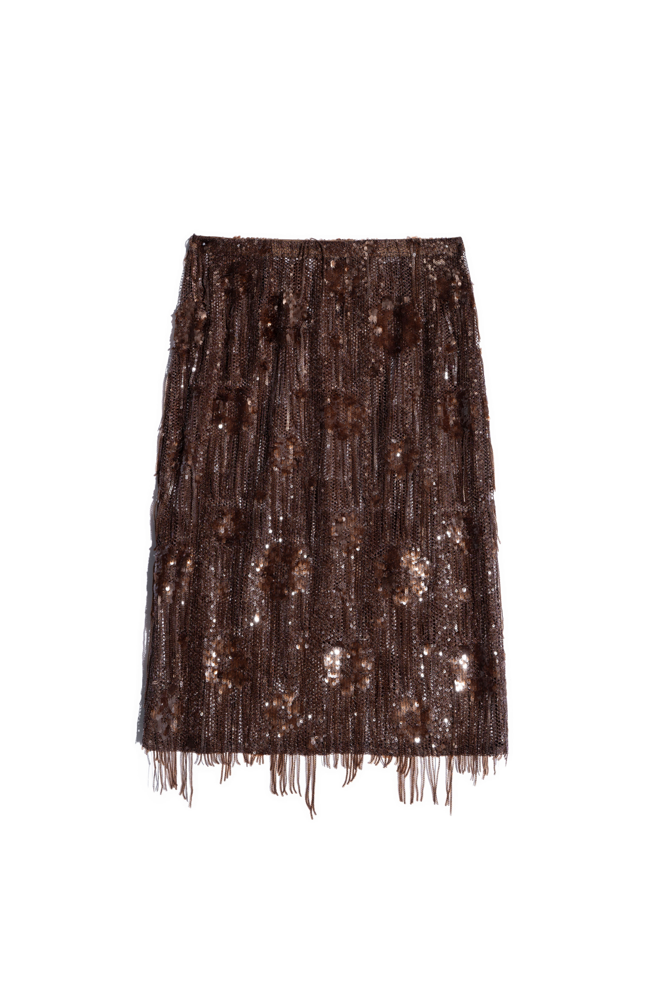 Юбка длины миди с геометрическим орнаментом, вышитым прозрачными пайетками. Модель декорирована россыпью пайеток и бахромой на подоле. Изделие выполнено без подкладки.