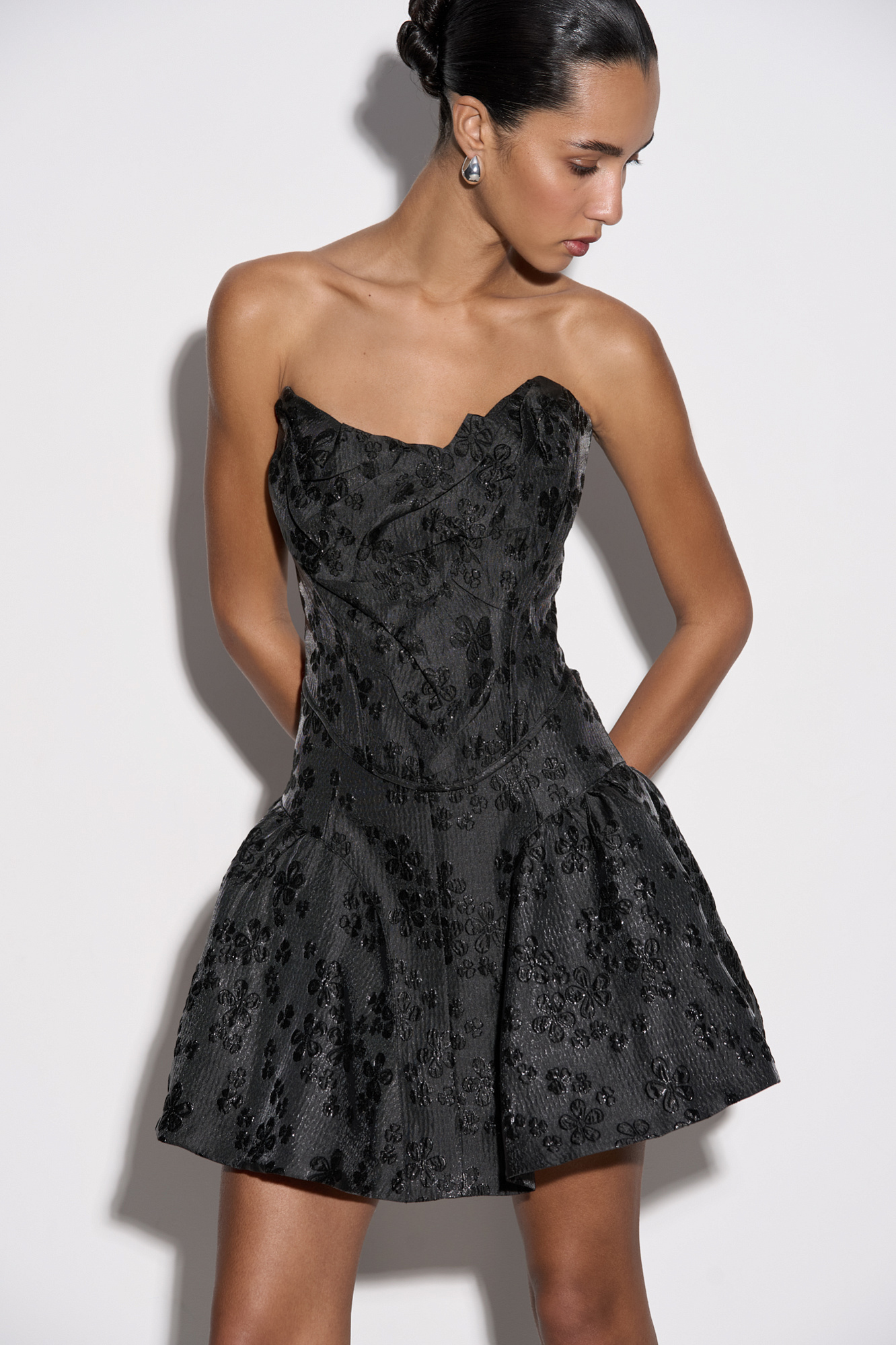 Юбка-баллон длины мини, выполненная из жатого жаккарда с растительным орнаментом. Модель с высокой талией и застежкой на скрытую молнию сзади. Изделие на подкладке.
