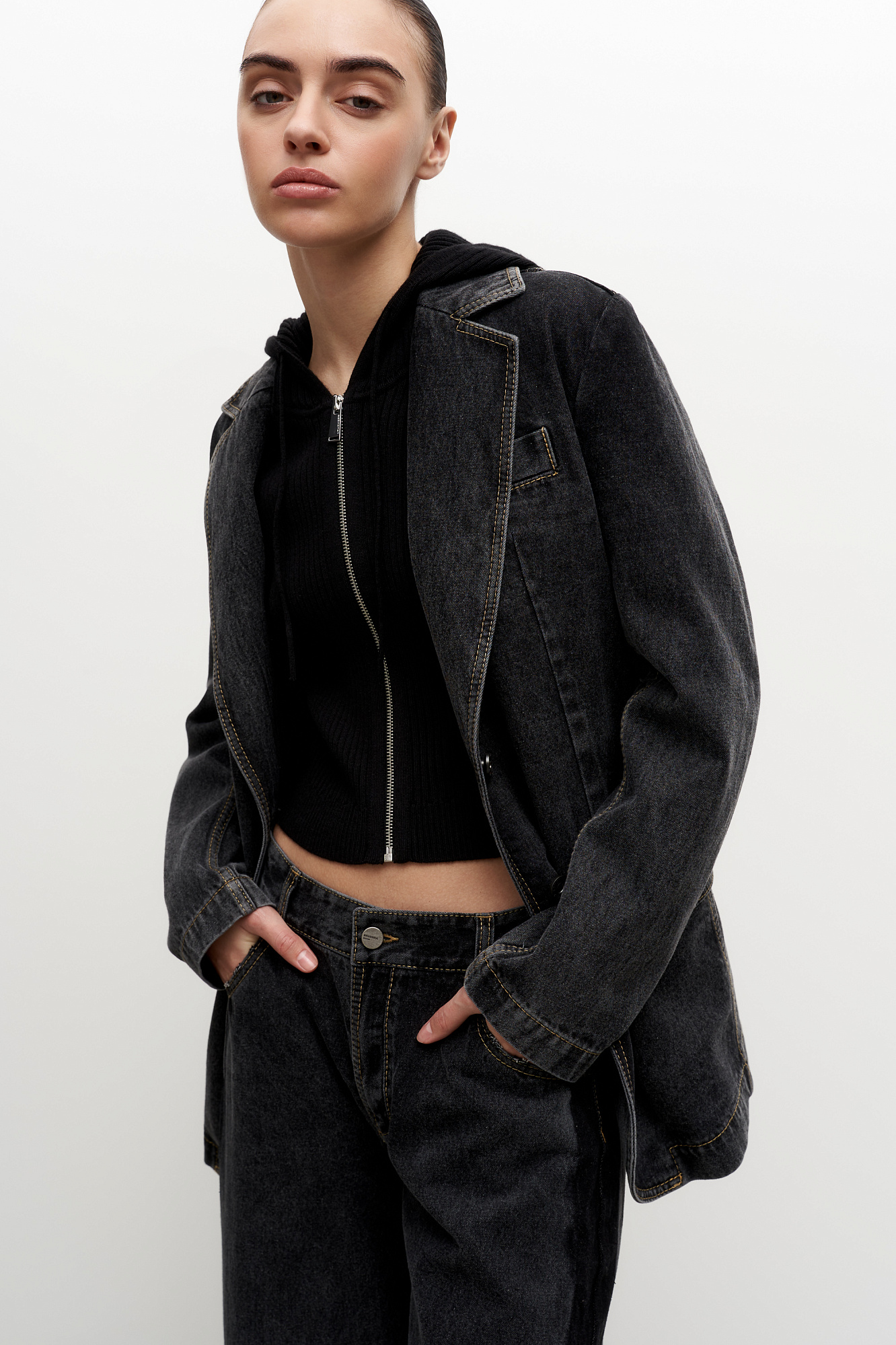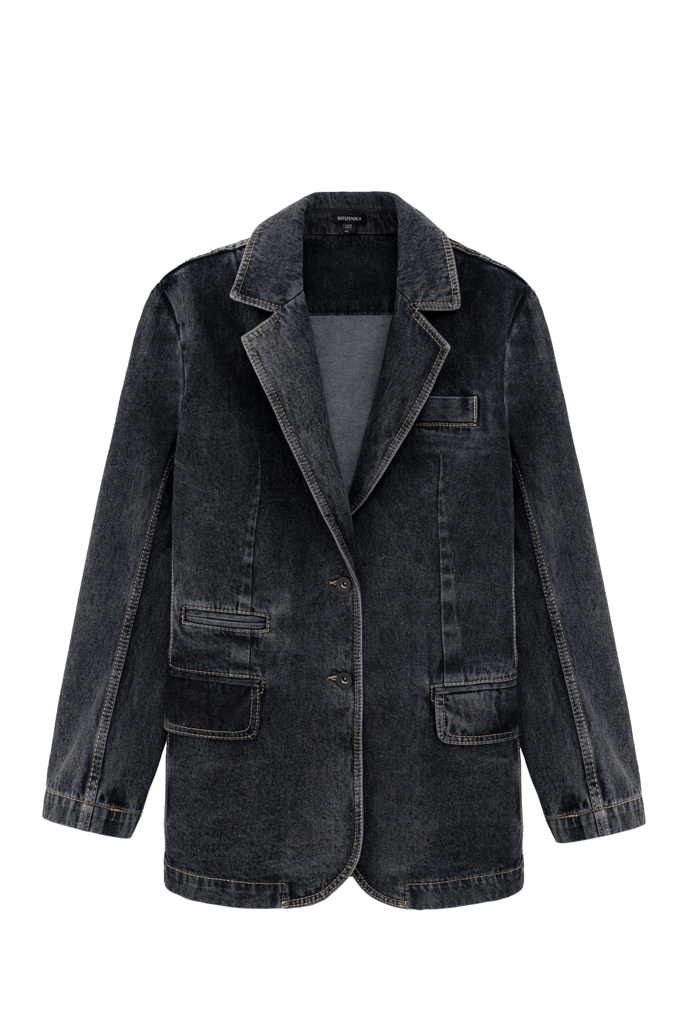 Джинсовый жакет из 100% хлопка. Модель прямого силуэта с английским воротником, прорезными карманами с карманами по бокам и на груди. Застежка на две пуговицы.