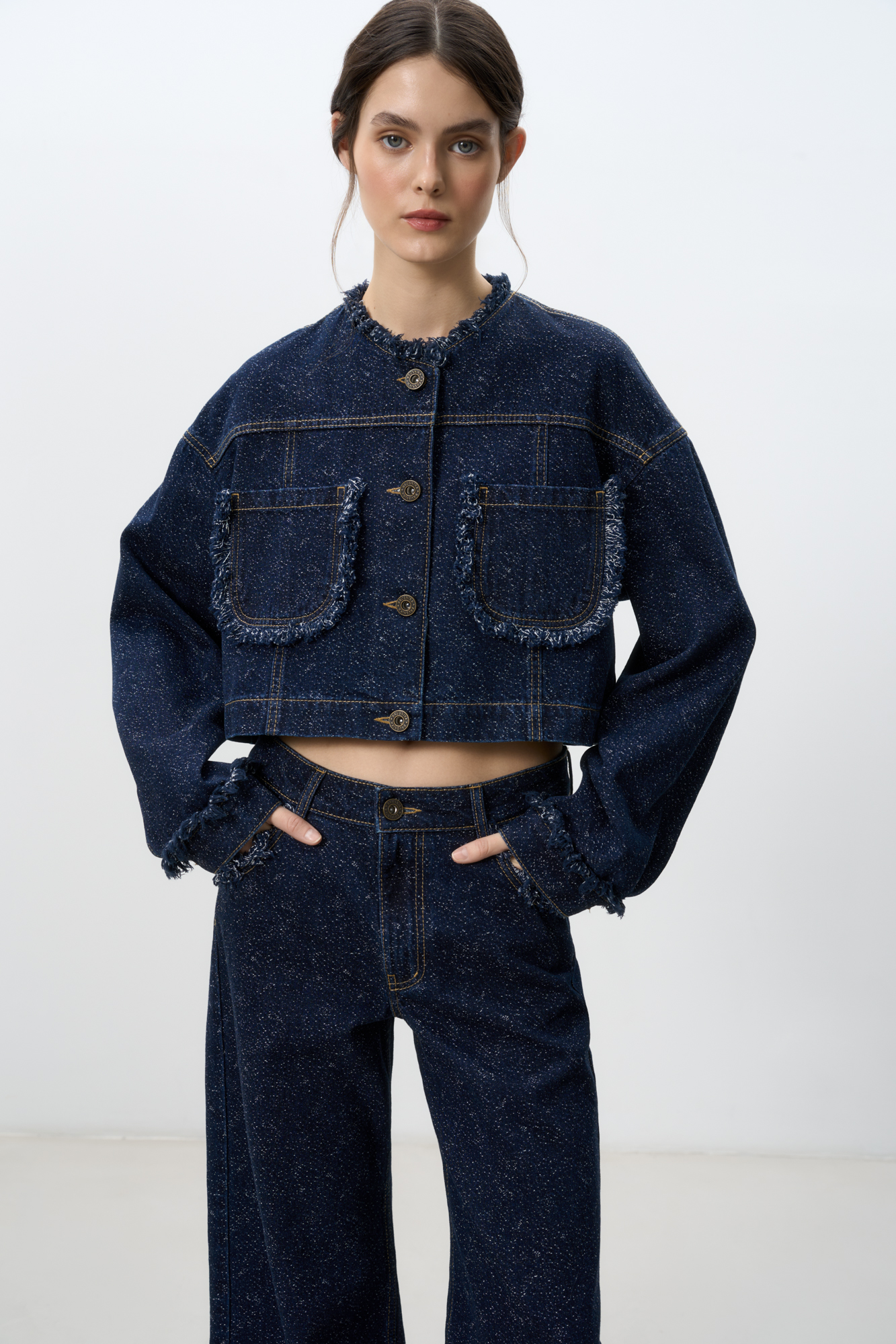 Джинсовый жакет из 100% хлопка. Модель свободного силуэта со спущенной линией плеча и накладными карманами. Застежка на металлические пуговицы. Изделие декорировано бахромой на карманах, манжетах рукавов и воротнике. Дополнить образ можно юбкой в таком же стиле.