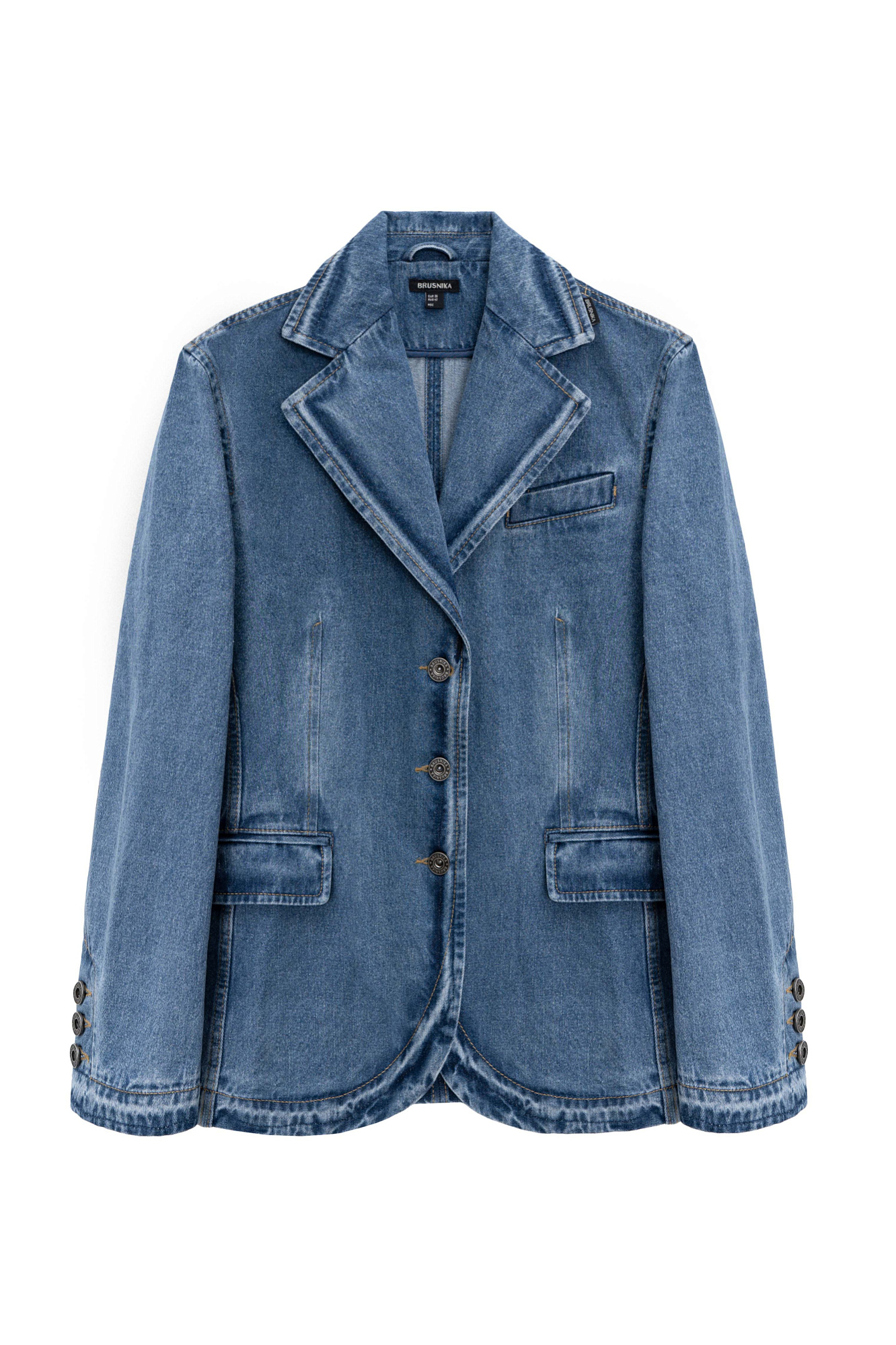Джинсовый жакет из 100% хлопка. Модель прямого кроя с классическим английским воротником, боковыми карманами с клапанами, карманом на груди и пуговицами на манжетах. Застежка на три металлические пуговицы. Изделие без подкладки.