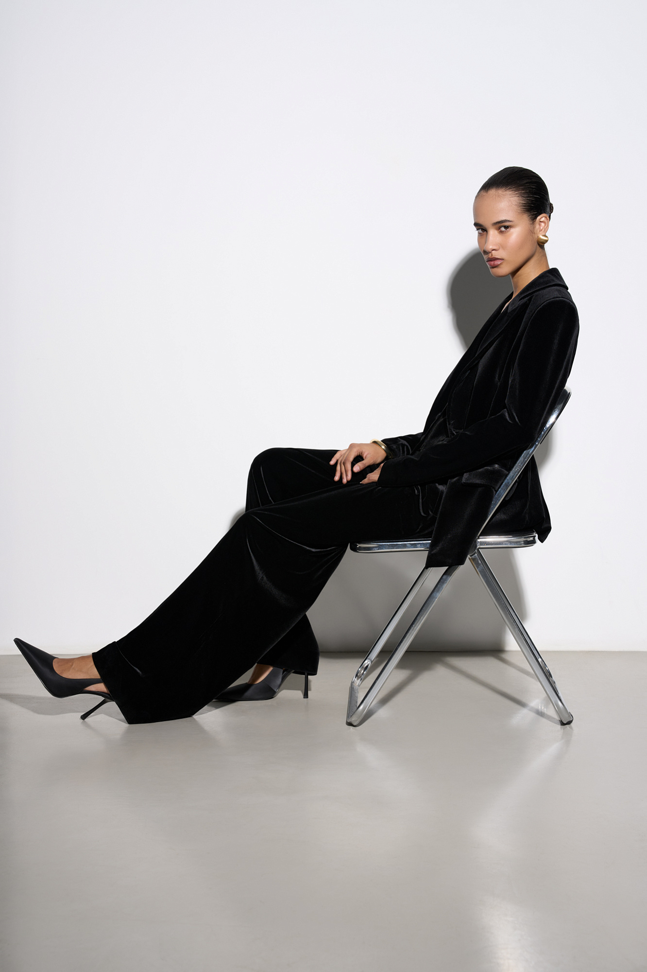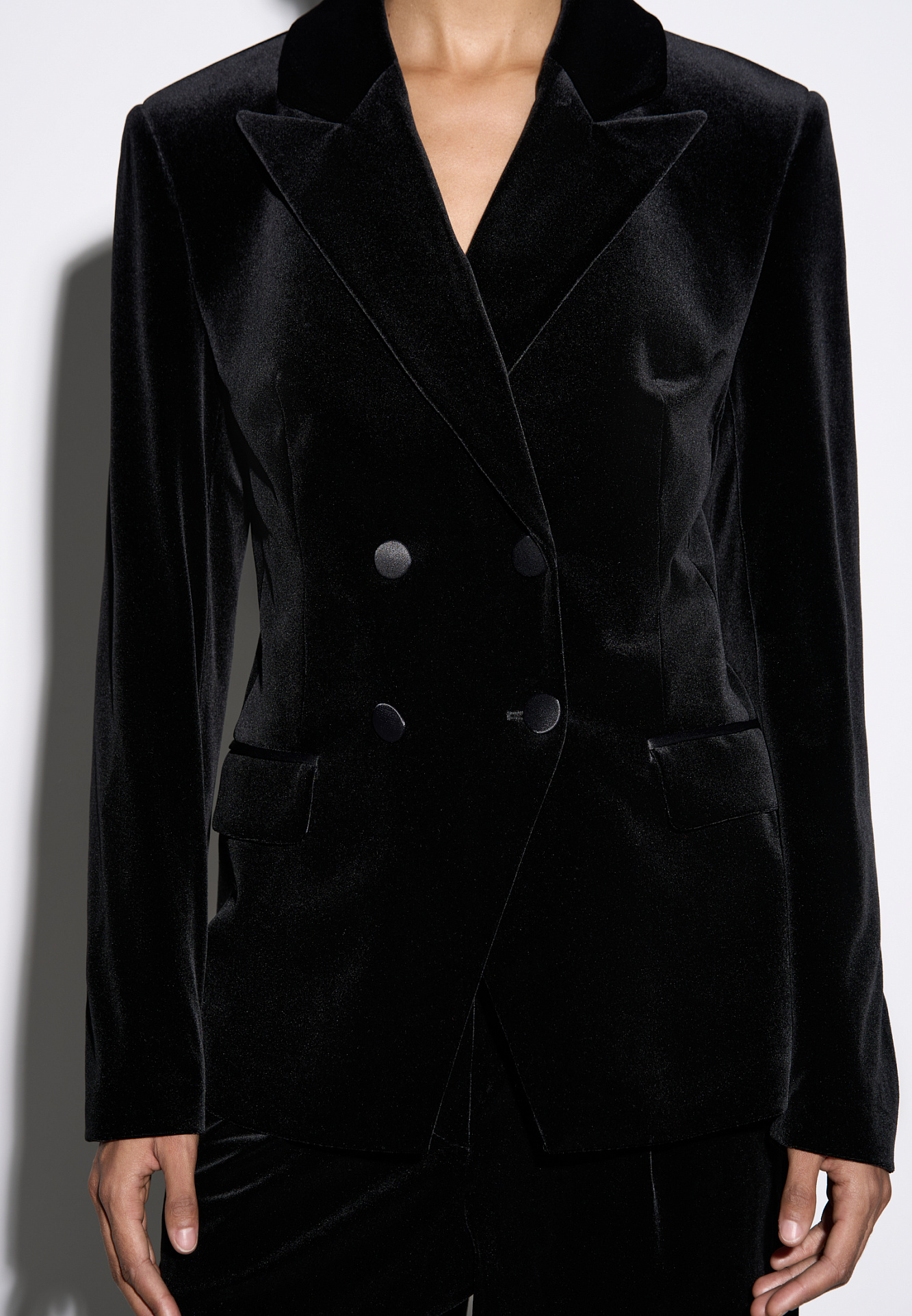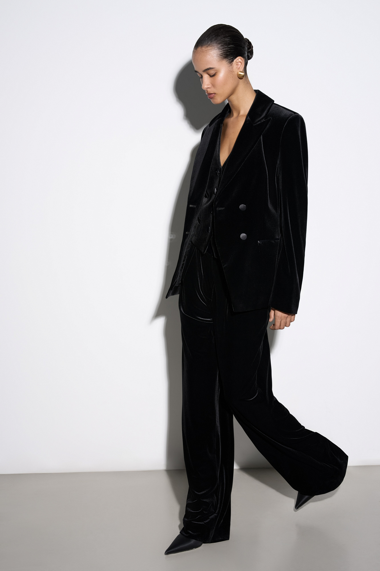 Двубортный приталенный жакет из бархата с остроконечными лацканами, накладными карманами, декорирован деталями из атласа. Застегивается на пуговицы. Дополнить образ можно жилетом и брюками в таком же стиле.
