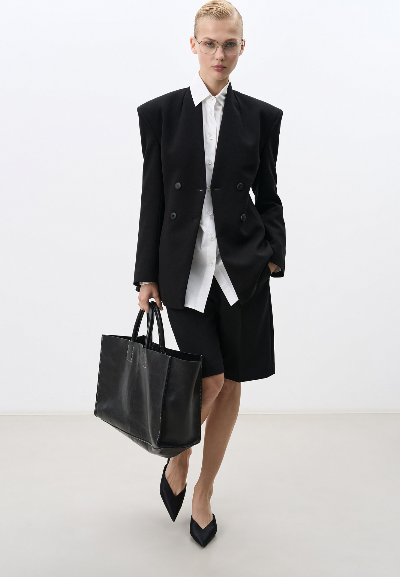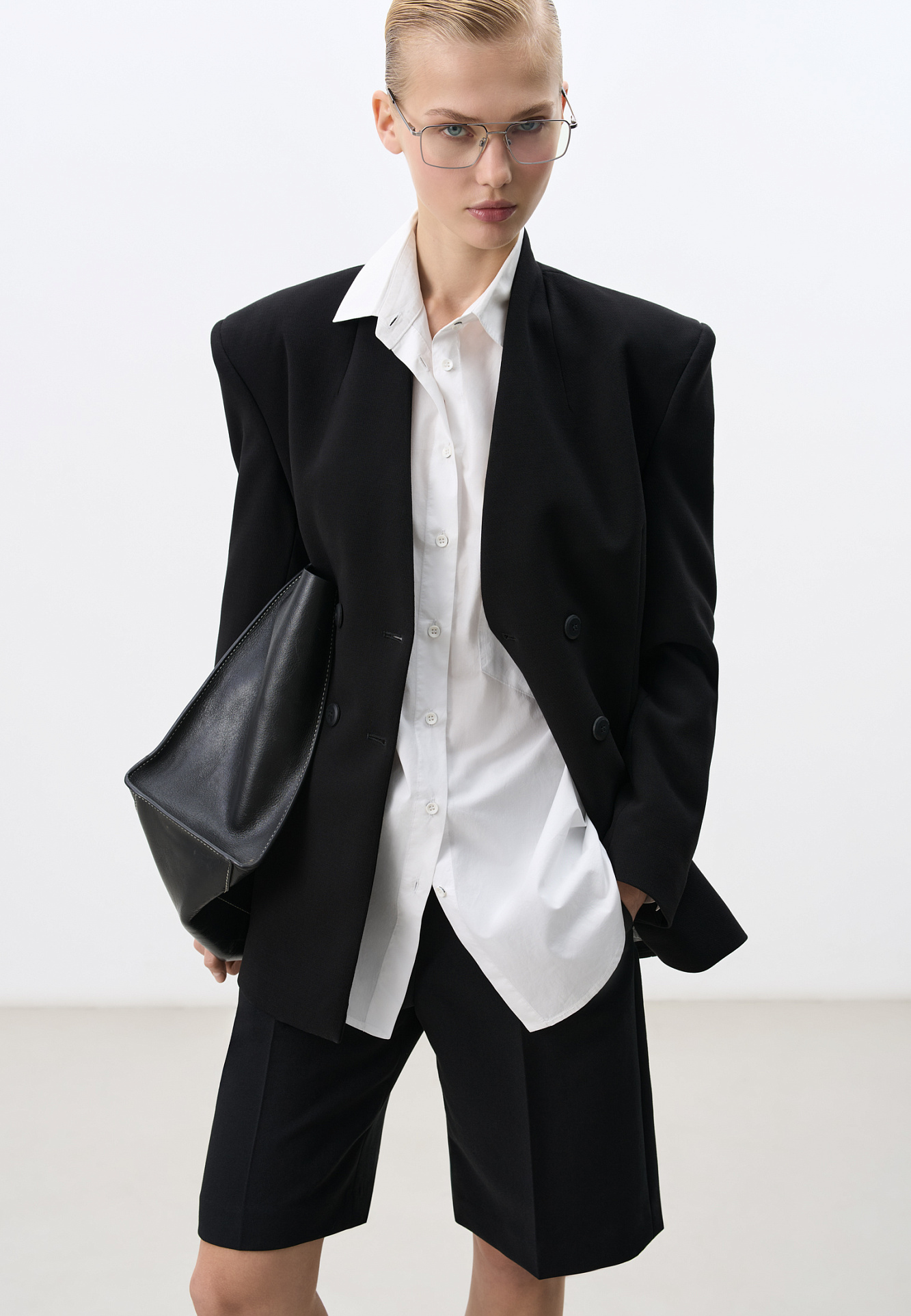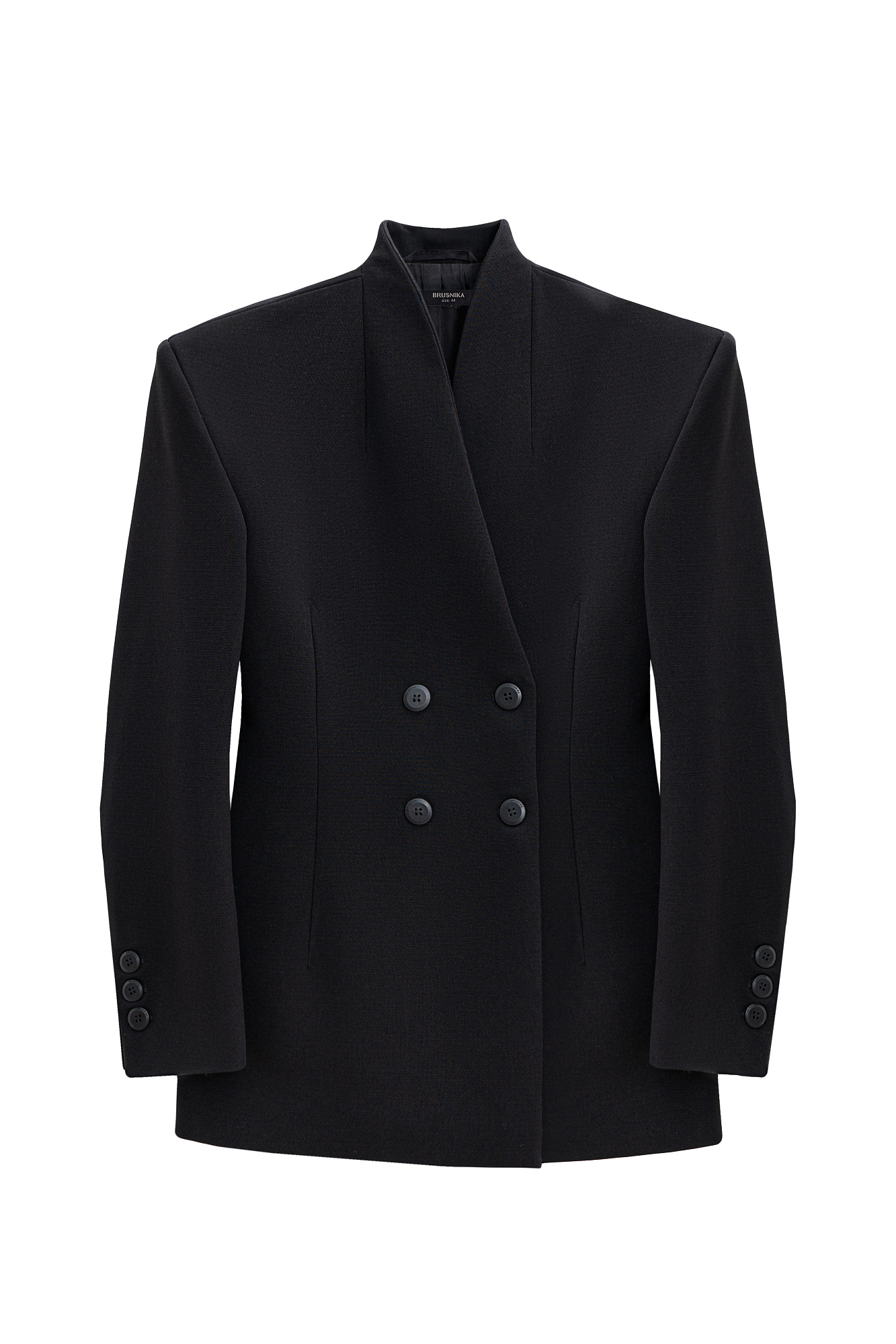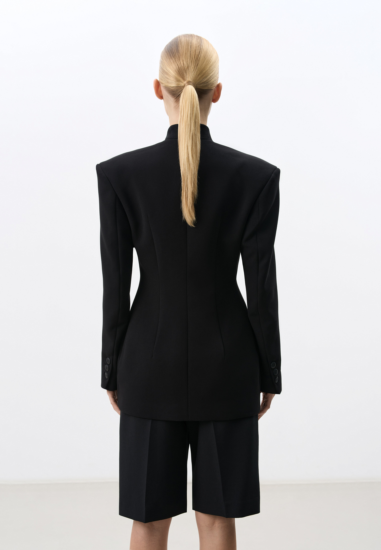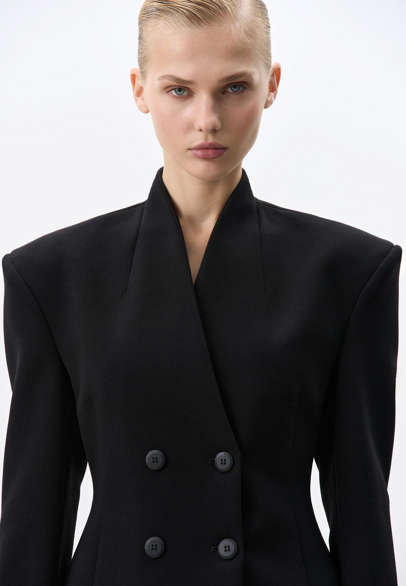 Двубортный жакет из вискозы. Модель приталенного силуэта, с широкими плечами и невысоким воротником без лацканов. Изделие выполнено на подкладке.