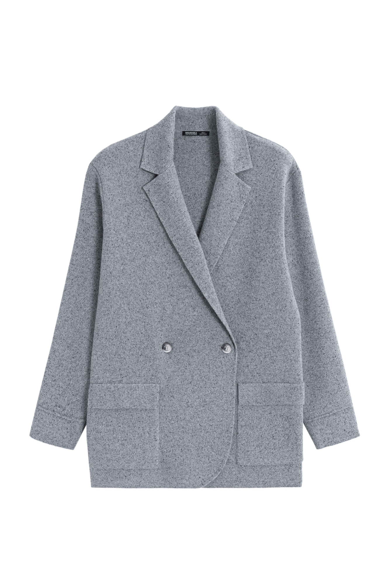 Трикотажный двубортный жакет из шерсти с добавлением вискозы и шелка. Модель прямого кроя, с лацканами, двумя накладными карманами и валиками на манжетах. Застежка на пуговицы. Без подкладки.