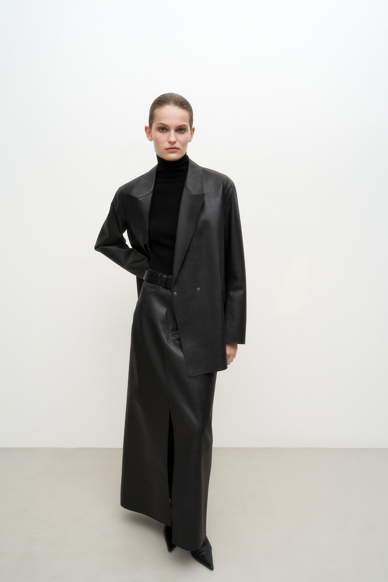 Классический жакет из двусторонней экокожи без подкладки. Английский воротник, накладные карманы. Застежка на кнопки.