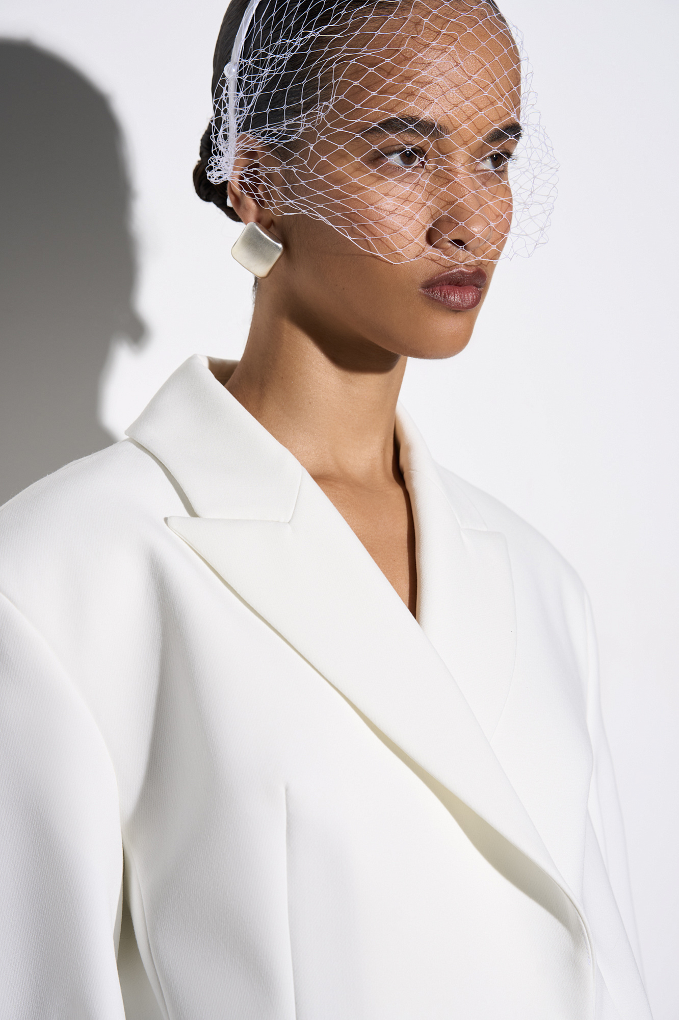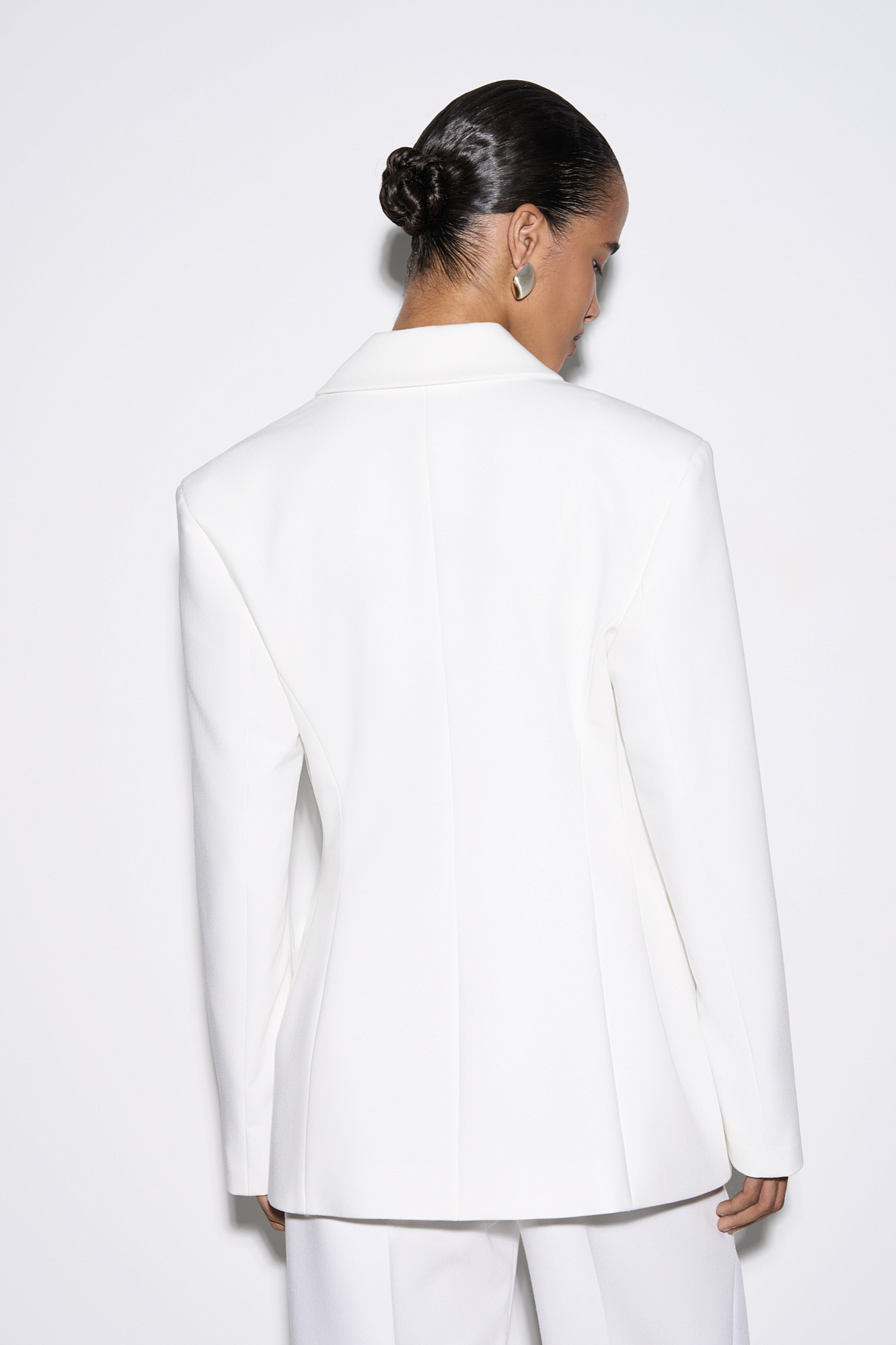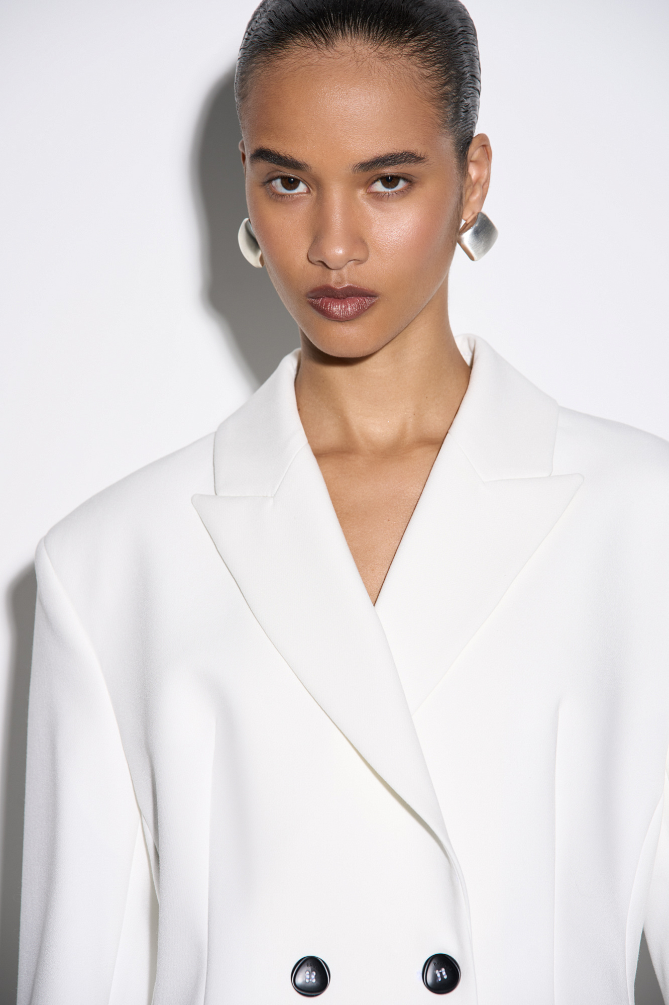 Классический двубортный жакет из поливискозы. модель приталенного силуэта с вытачками, двумя накладными карманами с клапанами и широкими лацканами. Застежка на пуговицы. Изделие на подкладке.