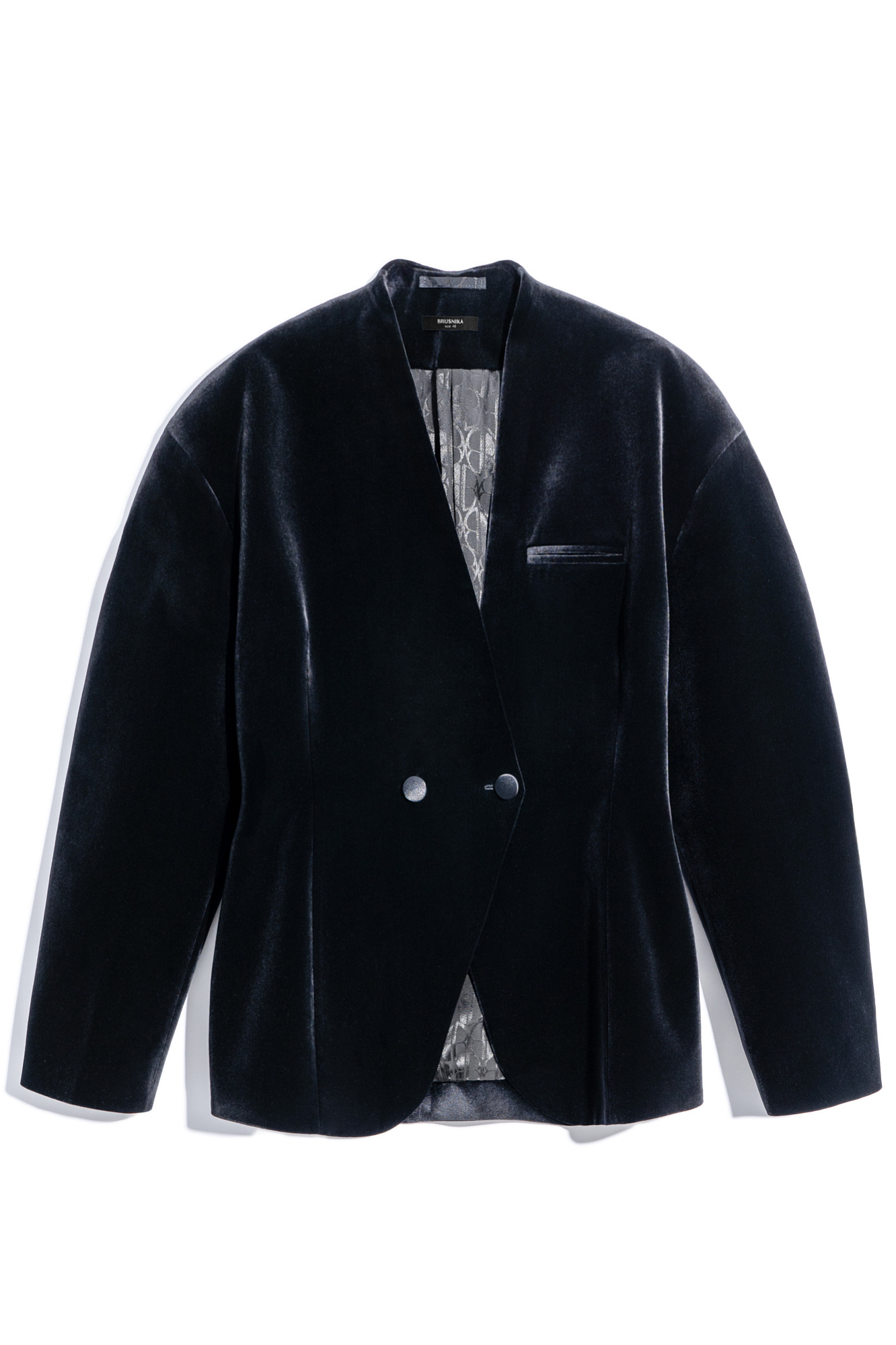 Бархатный жакет с объемными рукавами. Модель приталенного силуэта, с нагрудным карманом, невысоким воротником без лацканов. Плечи с подплечниками. Изделие выполнено на подкладке.