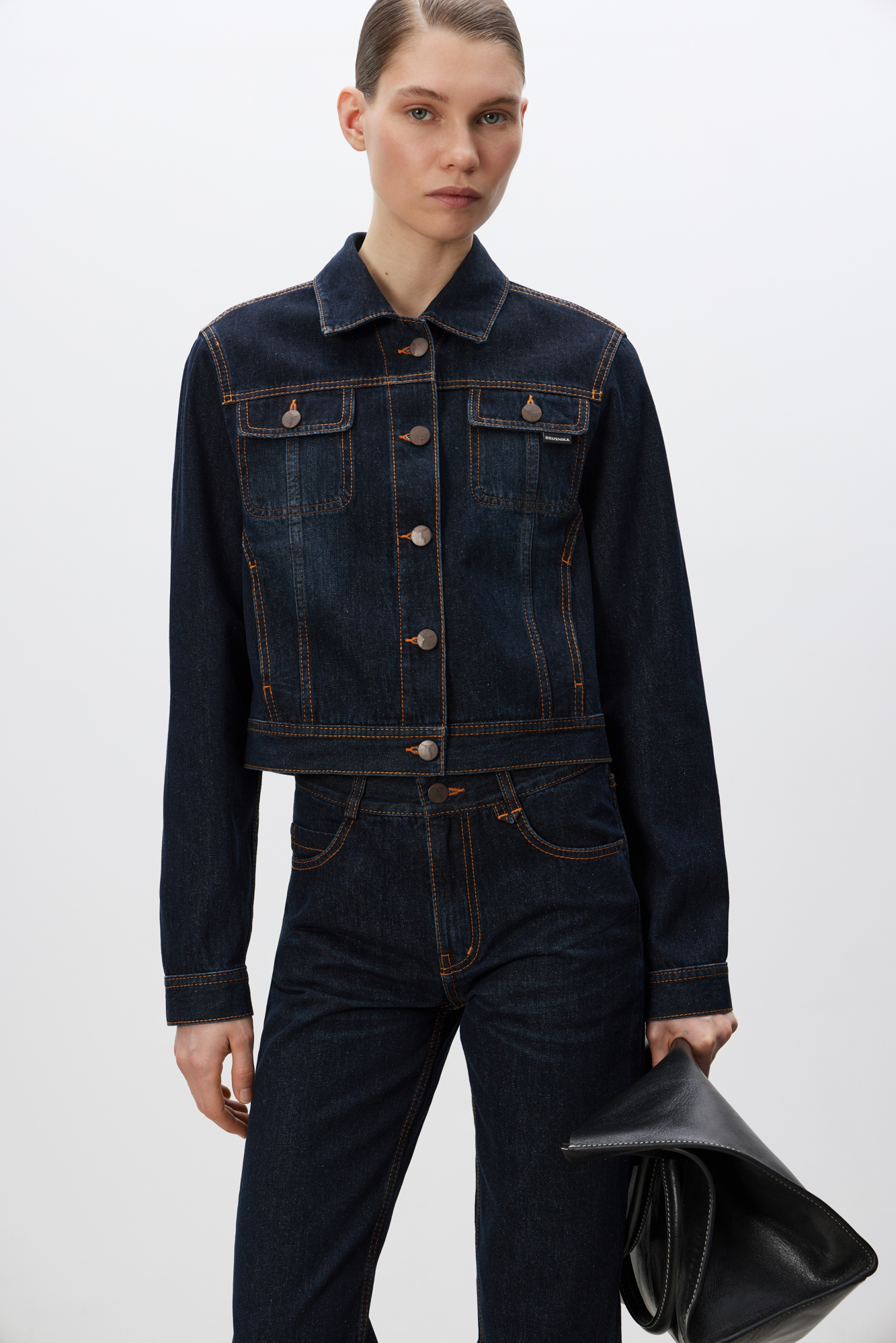 Джинсовая куртка из 100% хлопкового денима. Отложной воротник. Длинные рукава с манжетами на пуговицах. Передние прорезные карманы, нагрудные карманы с клапанами. Контрастная строчка терракотового цвета. Застежка на металлические пуговицы.