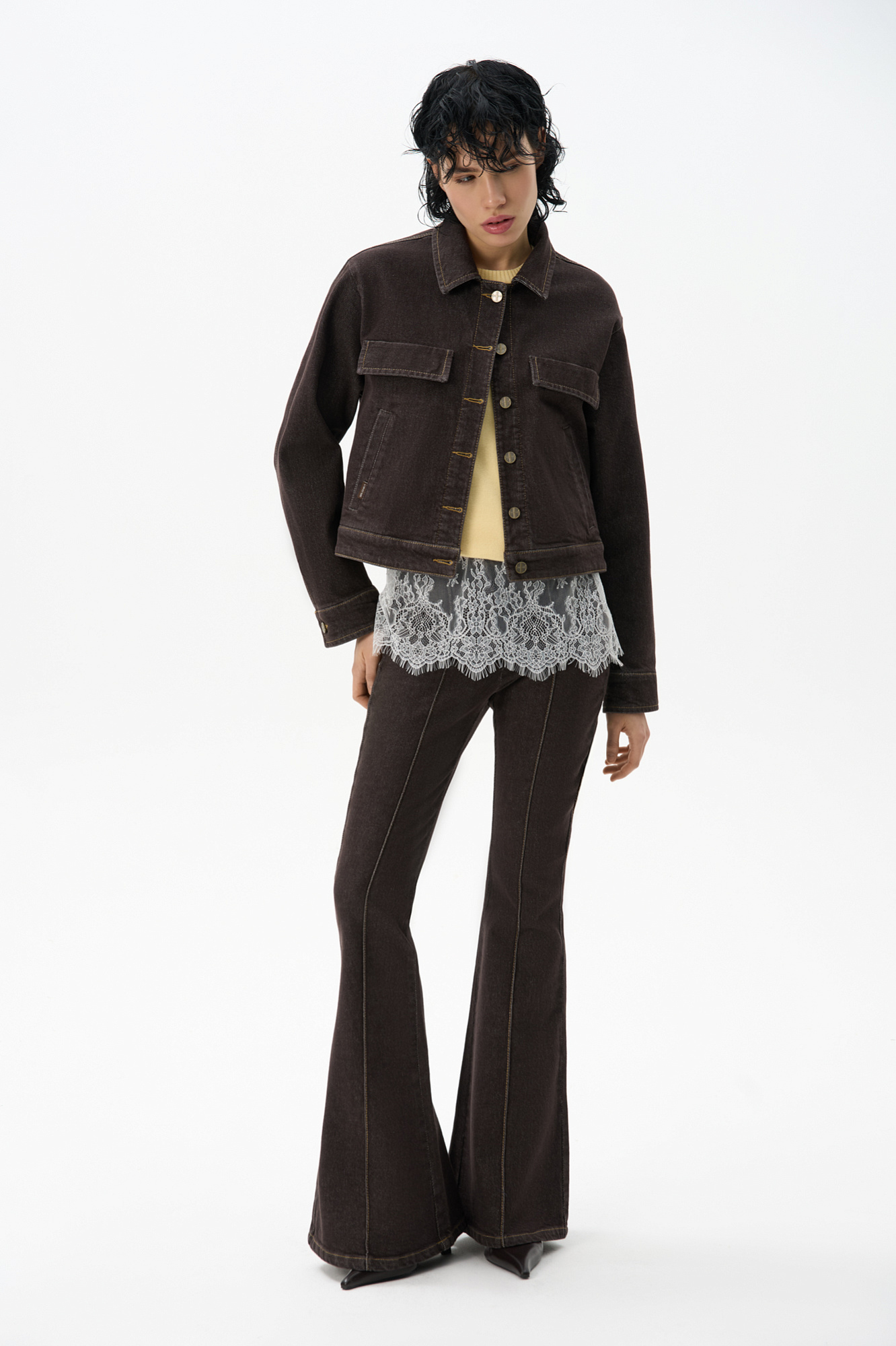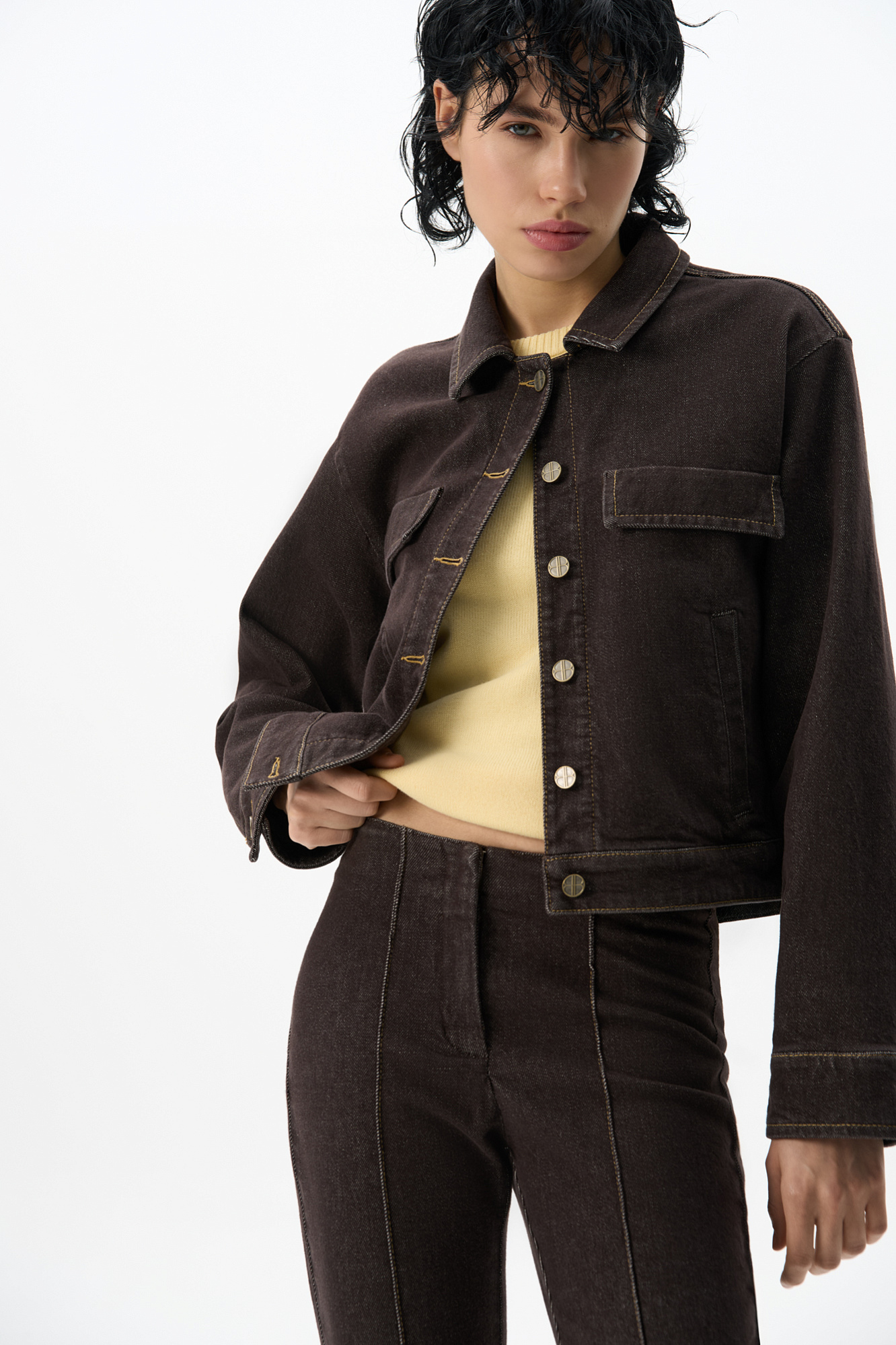 Джинсовый короткий жакет из хлопок - 98%, эластан - 2%. Модель прямого кроя с длинными рукавами на манжетах, классическим отложным воротником и карманами. Застежка на металлические брендированные пуговицы.