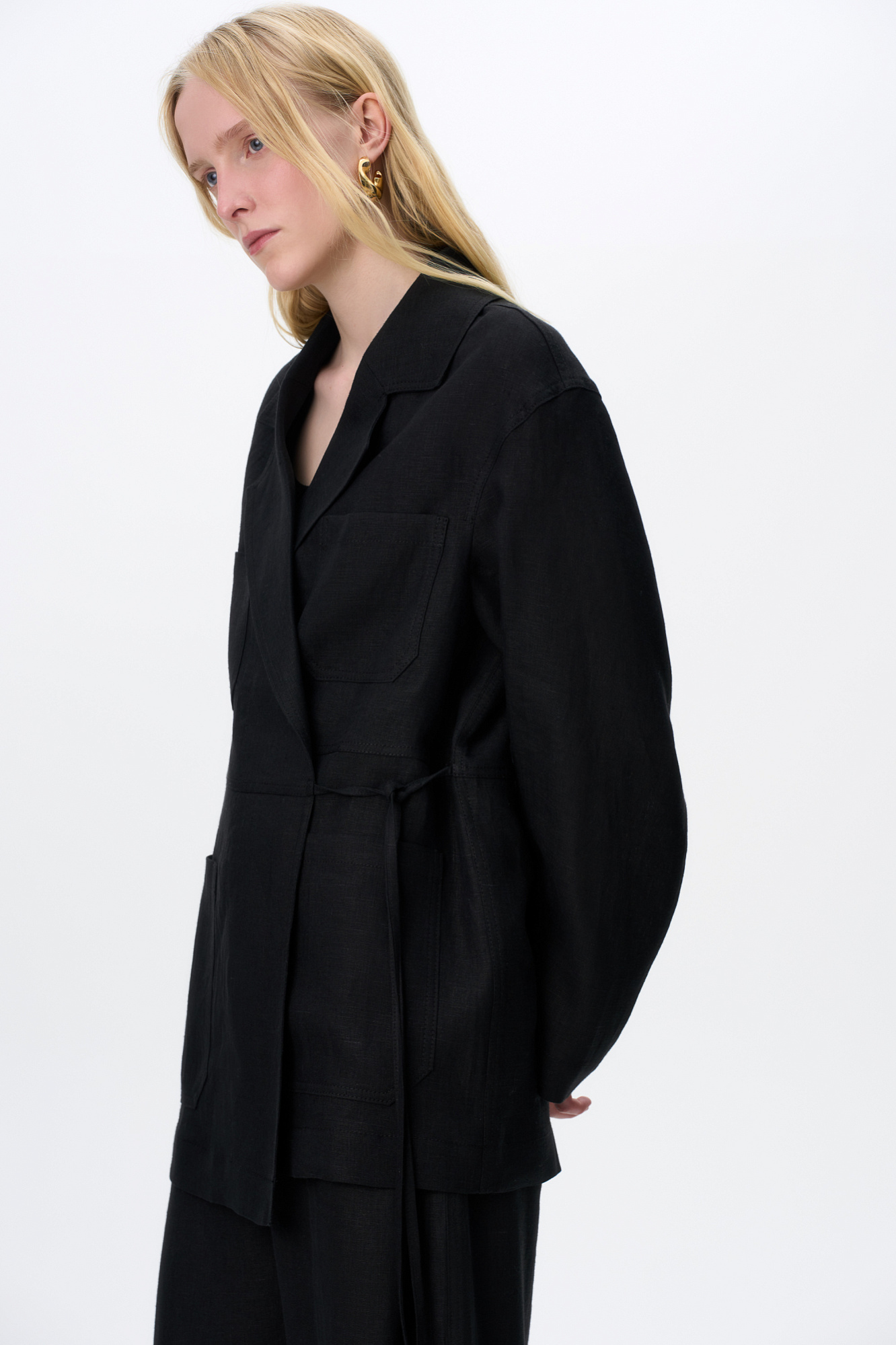 Льняной жакет на запах с поясом. Модель свободного силуэта с накладными карманами на груди.