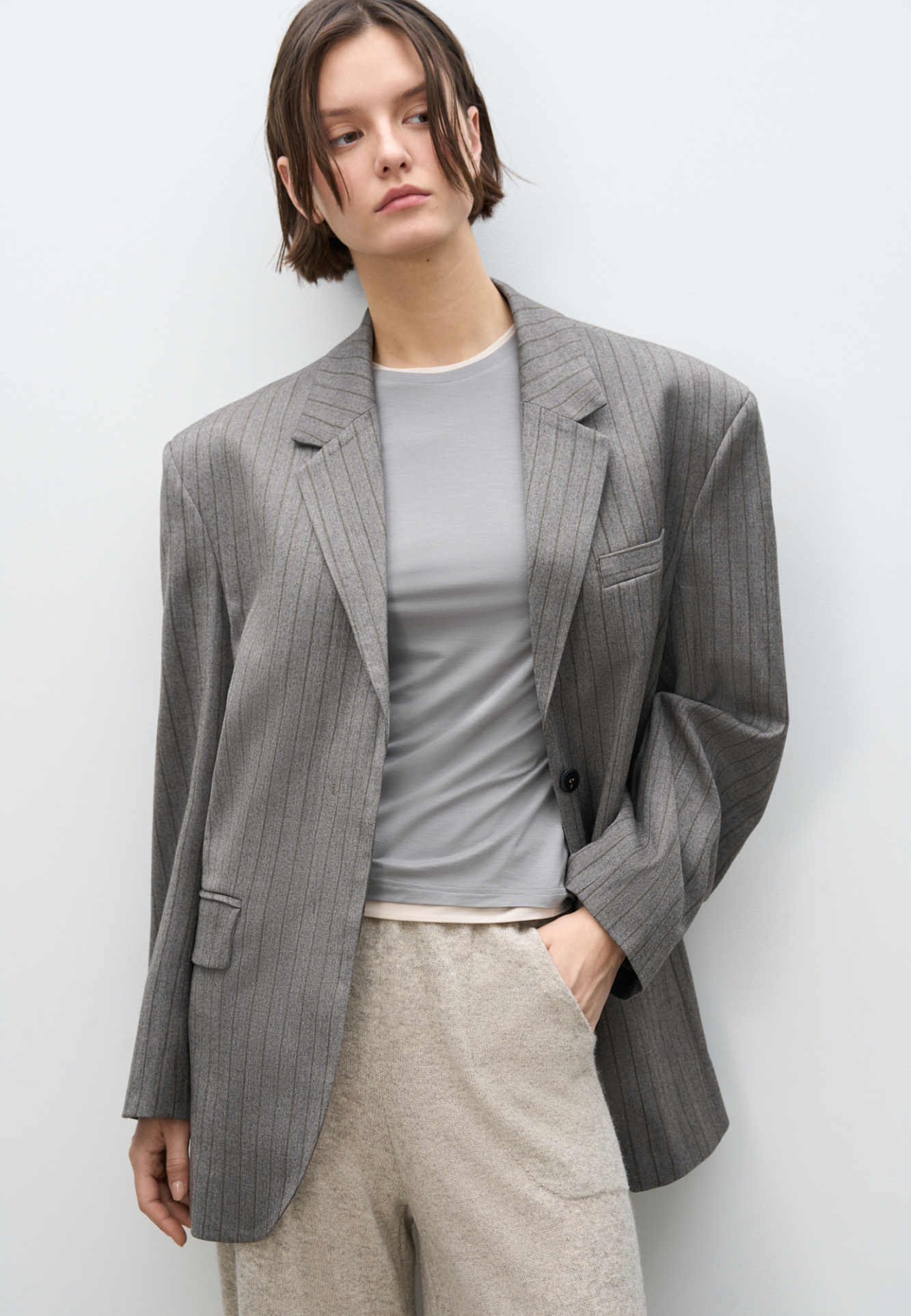 Однобортный жакет в полоску. Модель прямого кроя, с узкими лацканами, нагрудным карманом, боковыми карманами с клапанами и пуговицами на рукавах. Застежка на скрытые пуговицы под планкой. Изделие выполнено на подкладке.