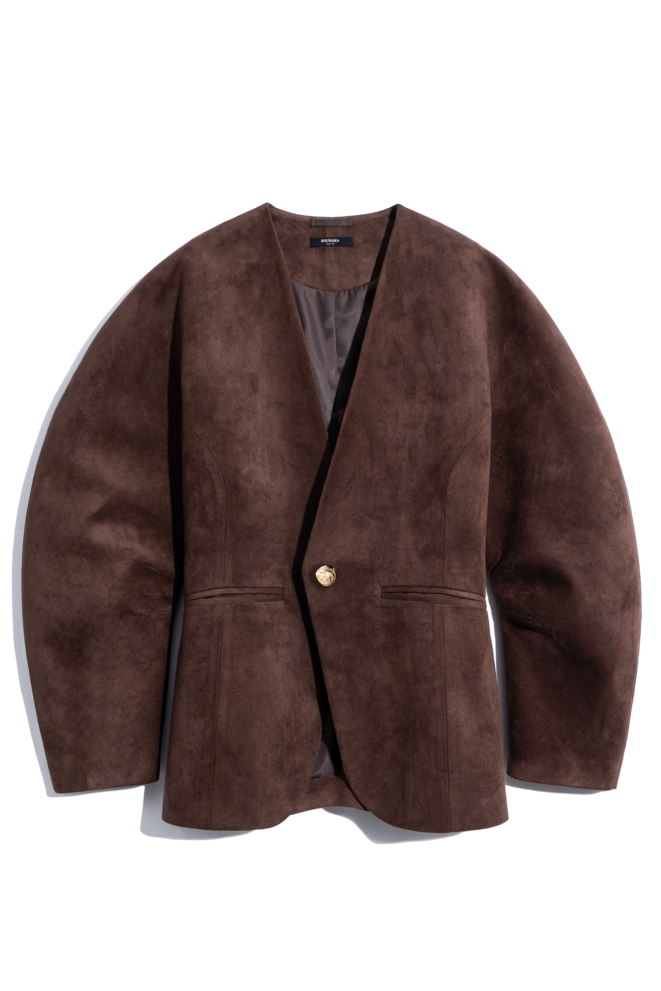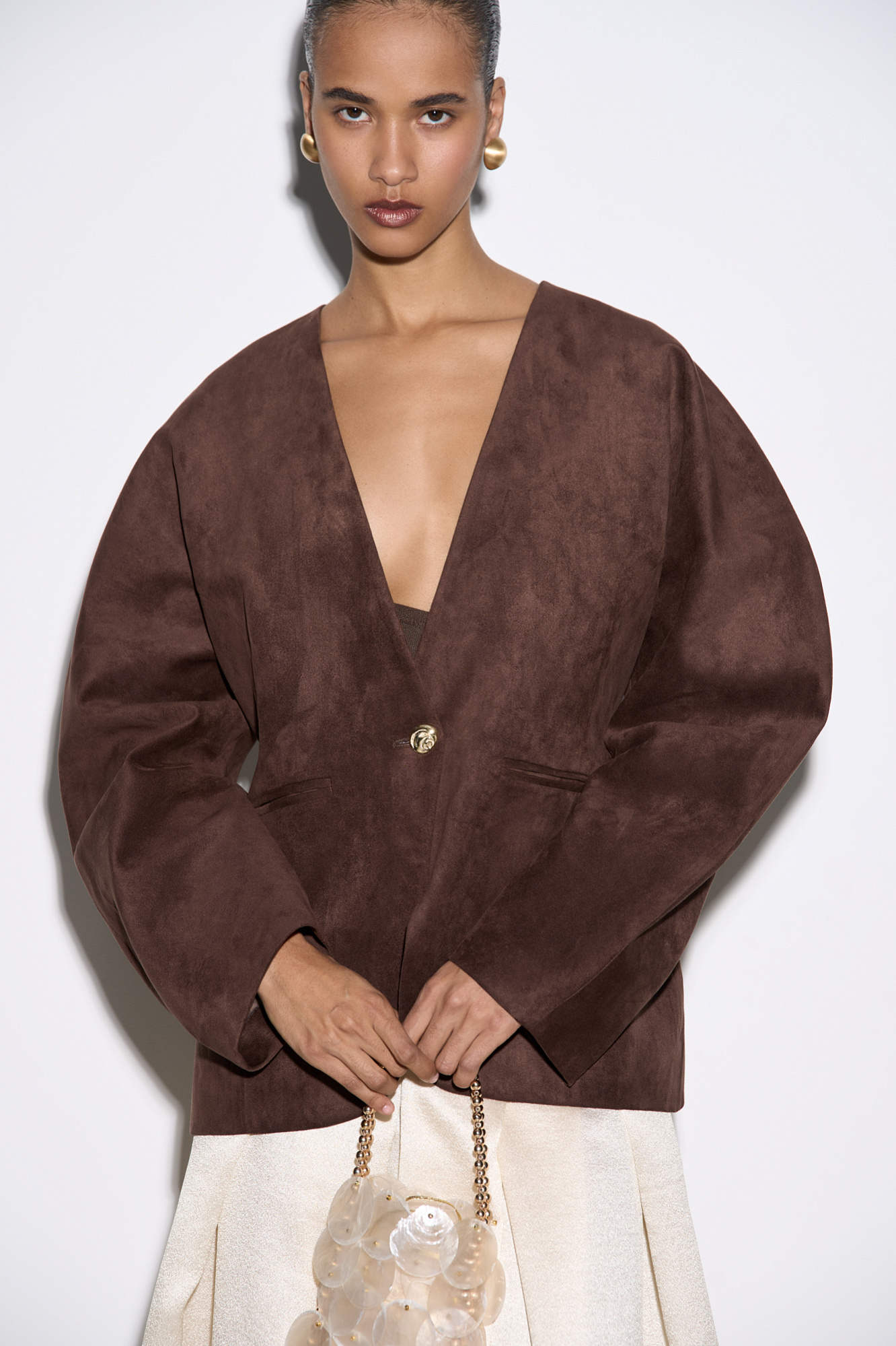 Однобортный жакет из ткани с имитацией внешнего вида и свойств натуральной замши. Модель без лацканов с большими объемными рукавами и боковыми прорезными карманами. Изделие на подкладке.