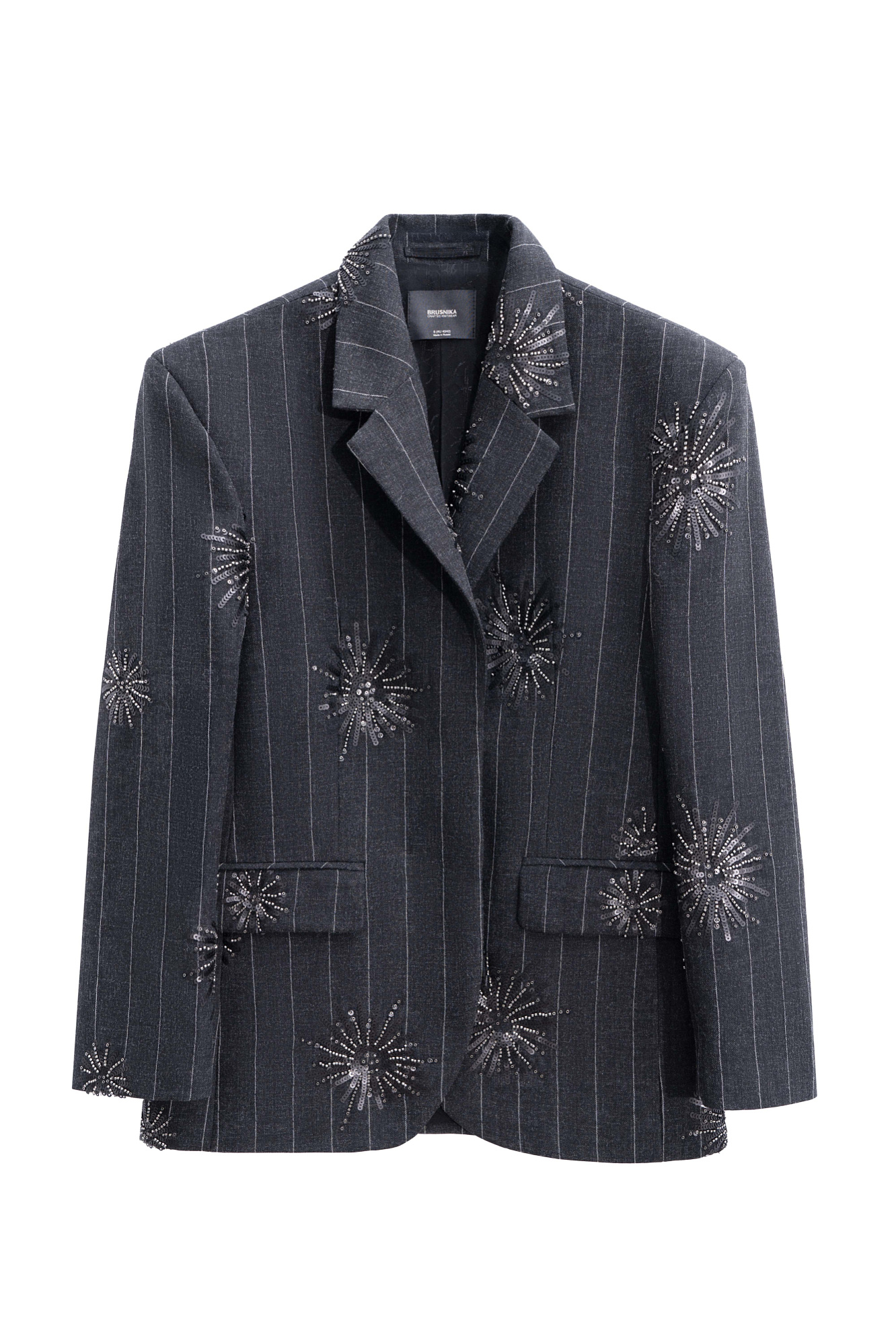 Однобортный жакет из шерсти, декорированный узором из пайеток. Модель прямого кроя с узкими лацканами, широкими плечами, боковыми карманами с клапанами и застежкой на две пуговицы. Изделие выполнено на подкладке.