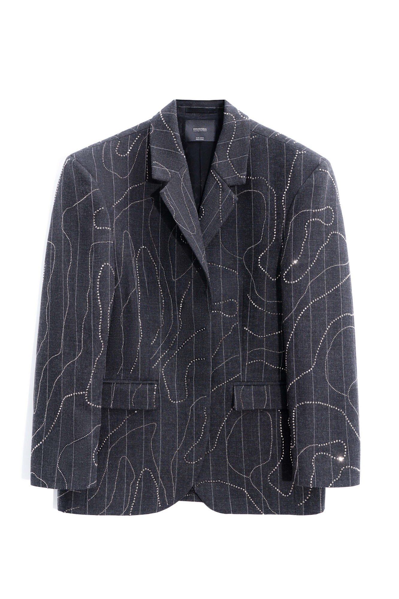 Однобортный жакет из шерсти, декорированный узором из страз. Модель прямого кроя с узкими лацканами, широкими плечами, боковыми карманами с клапанами и застежкой на две пуговицы. Изделие выполнено на подкладке.