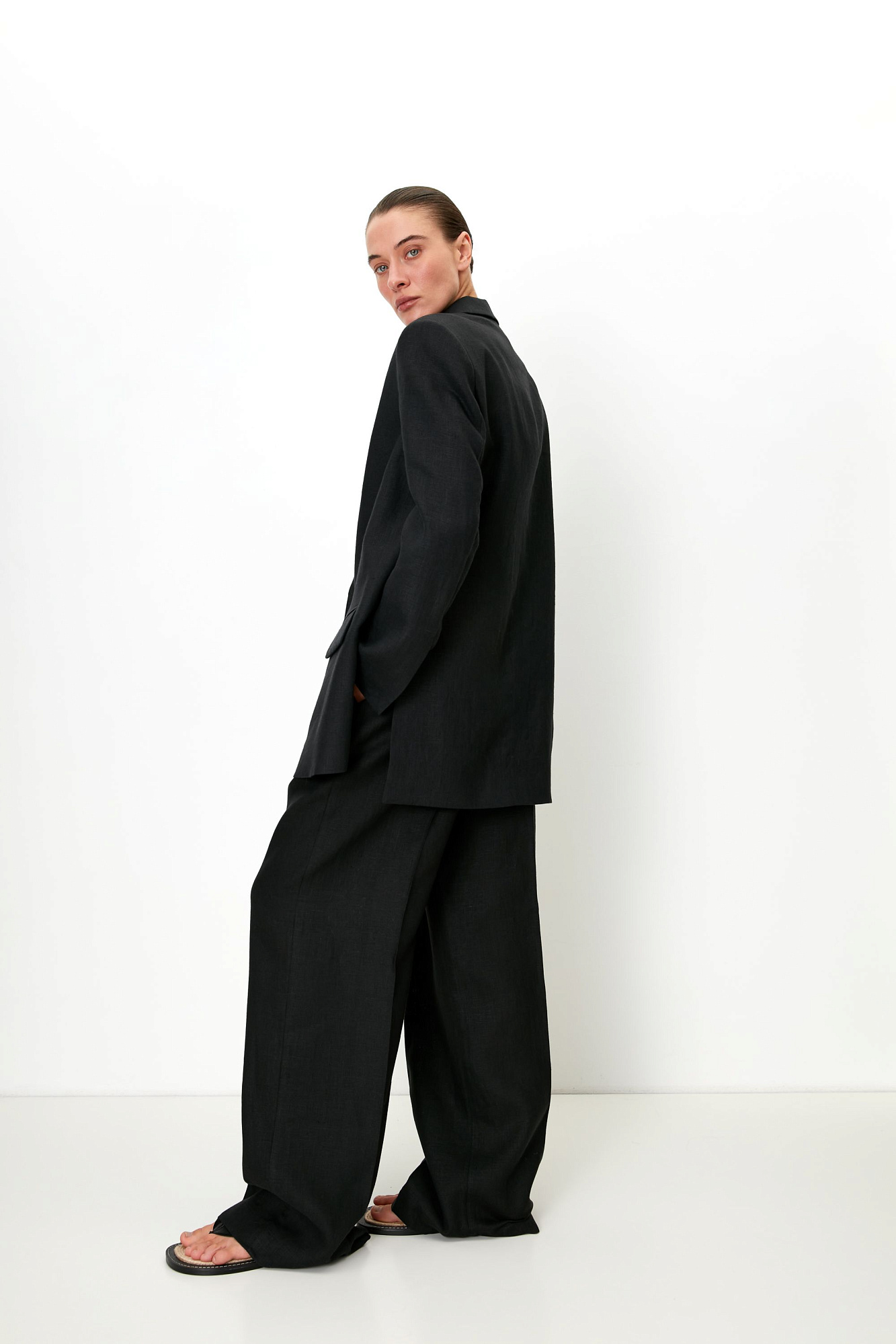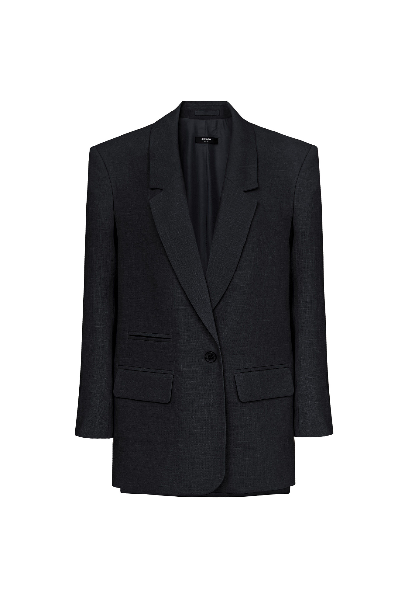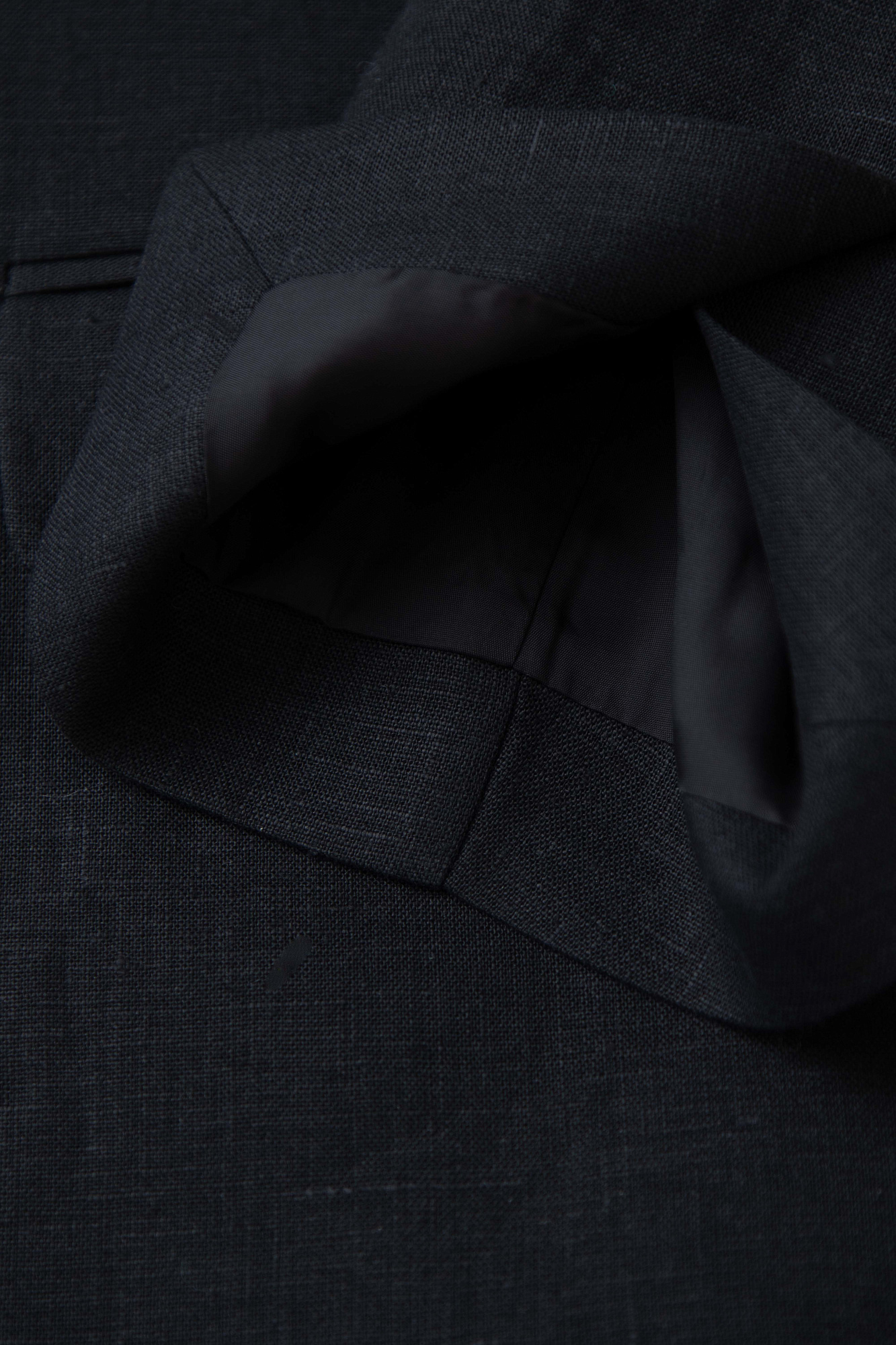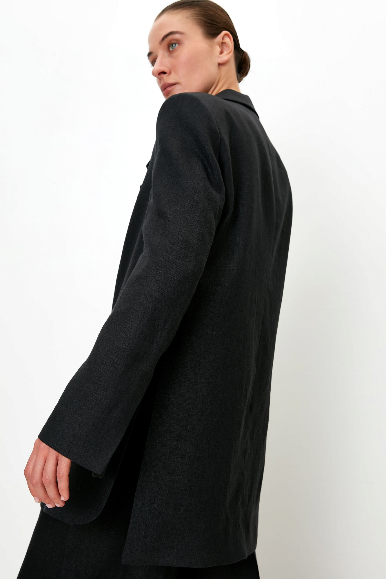Классический жакет из 100% льна с разрезами по бокам и накладными карманами. Застежка на одну пуговицу. Изделие на подкладке.