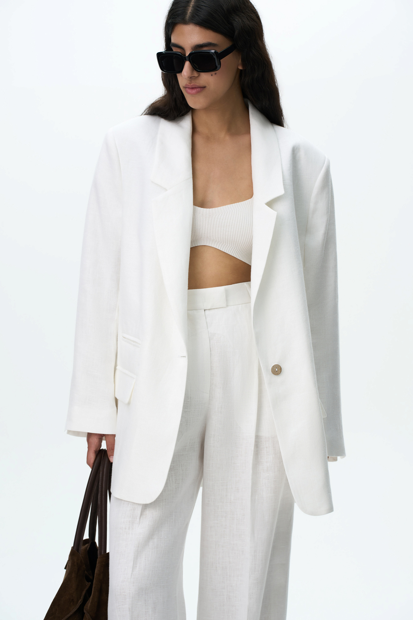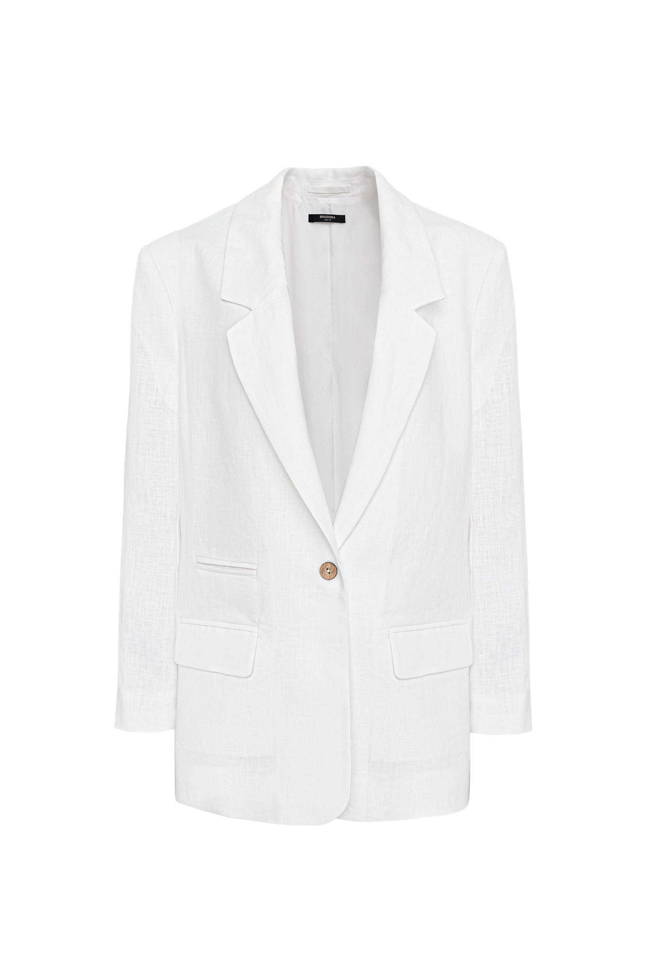 Классический жакет из 100% льна с разрезами по бокам и накладными карманами. Застежка на одну пуговицу. Изделие на подкладке.
