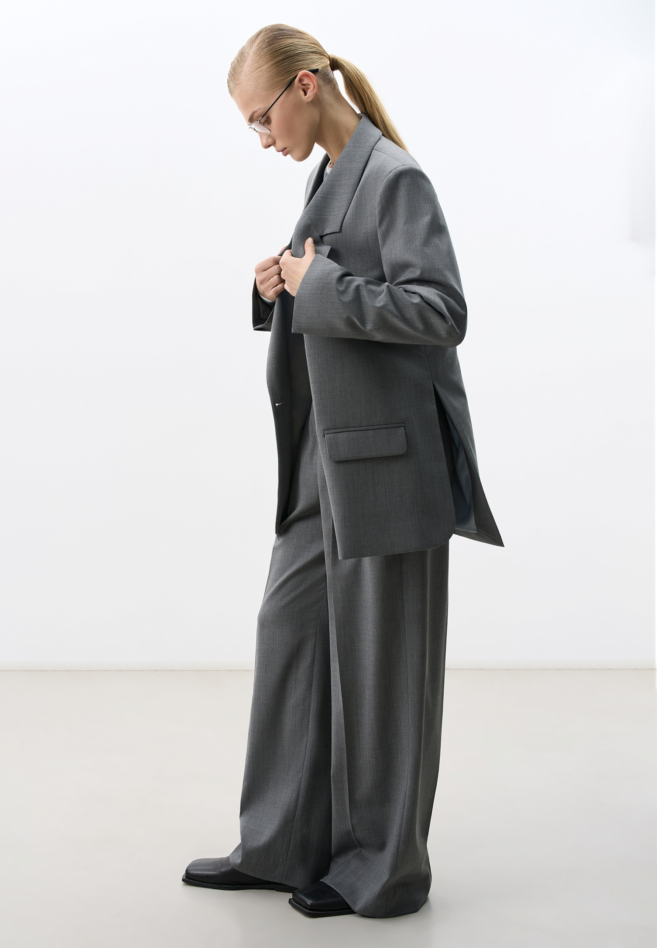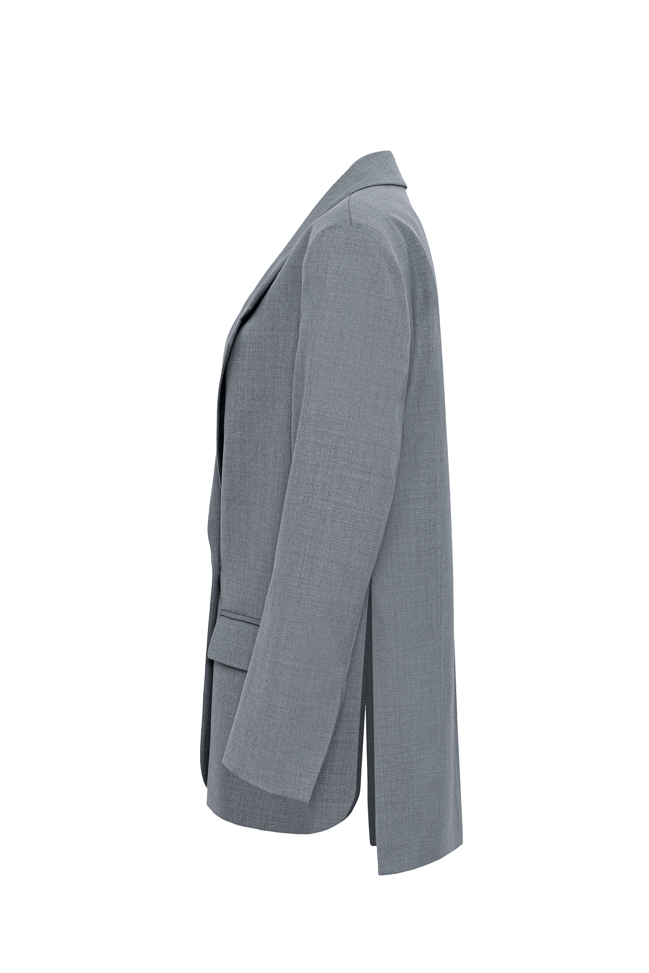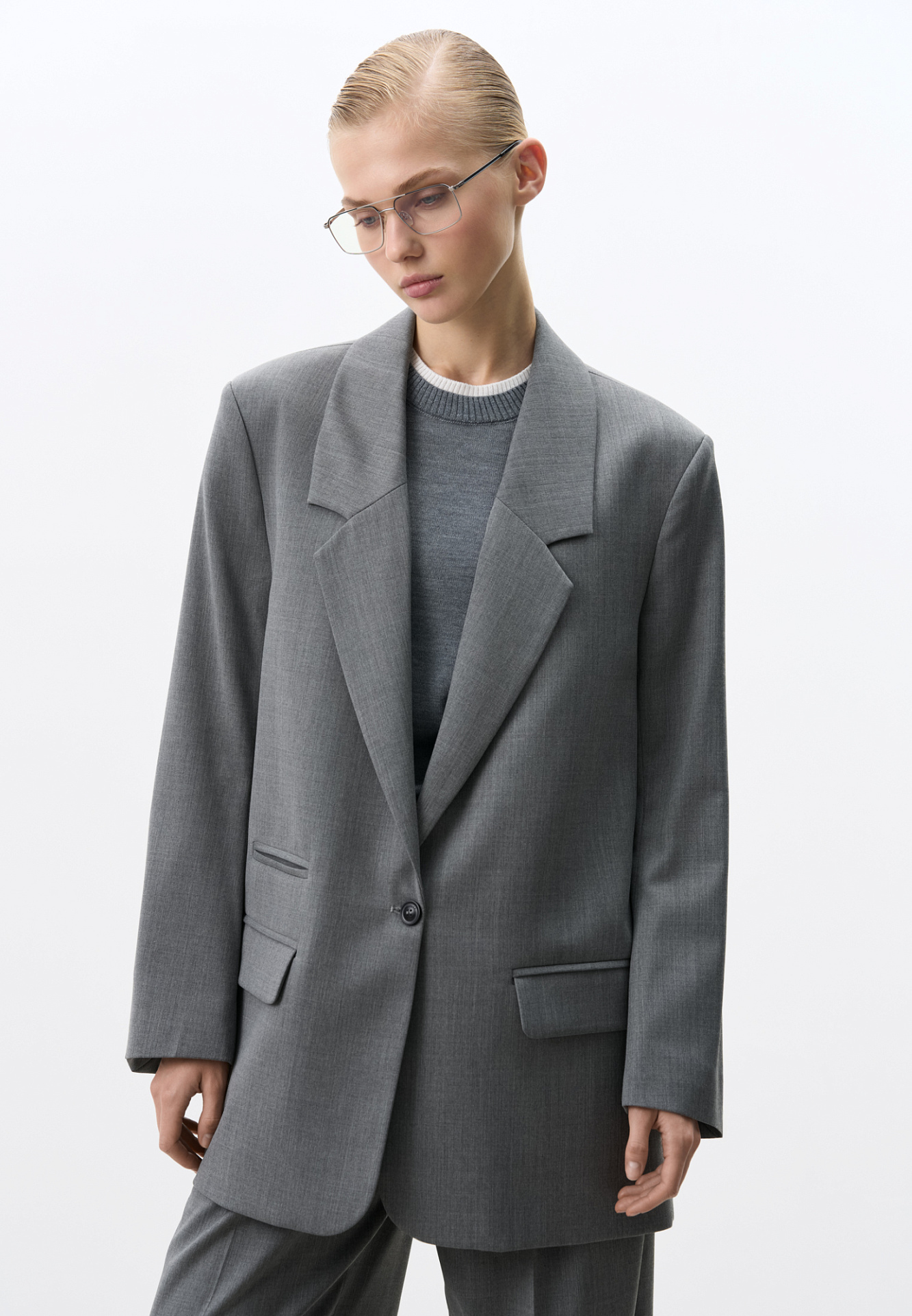 Классический жакет с накладными карманами, подплечниками, разрезами по бокам и удлиненной спинкой. Длинные рукава на манжетах без пуговиц. Застежка на пуговицу.
