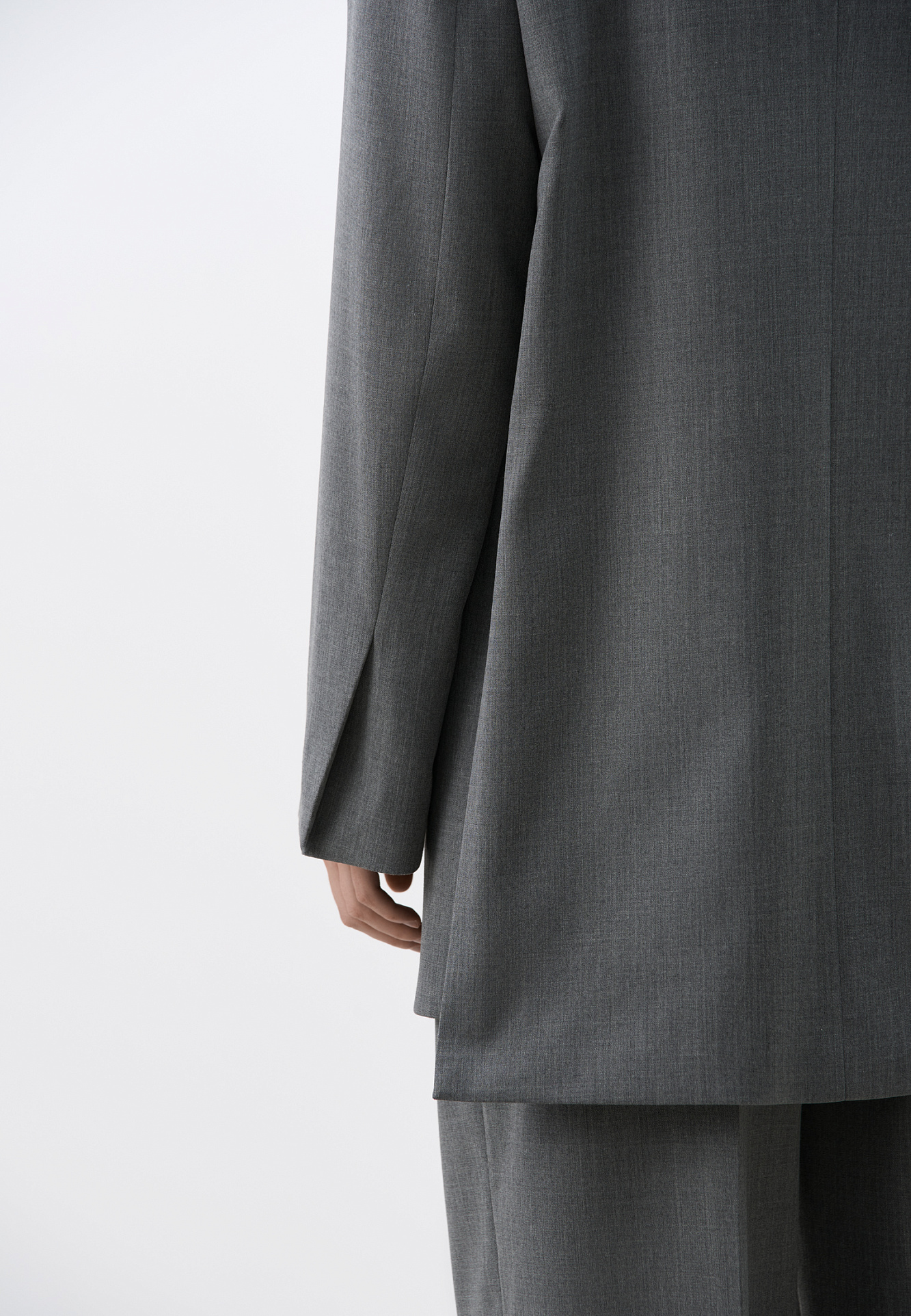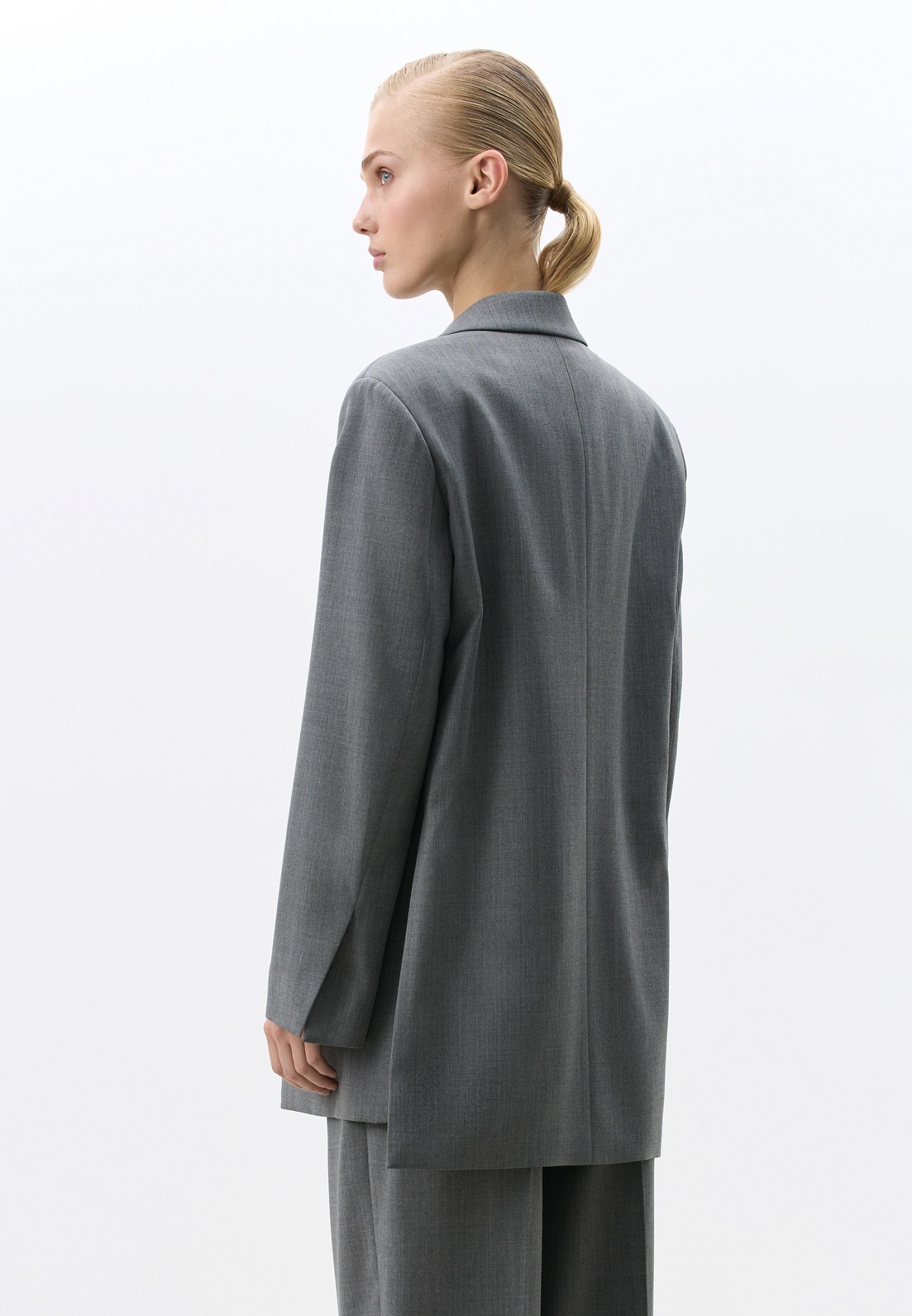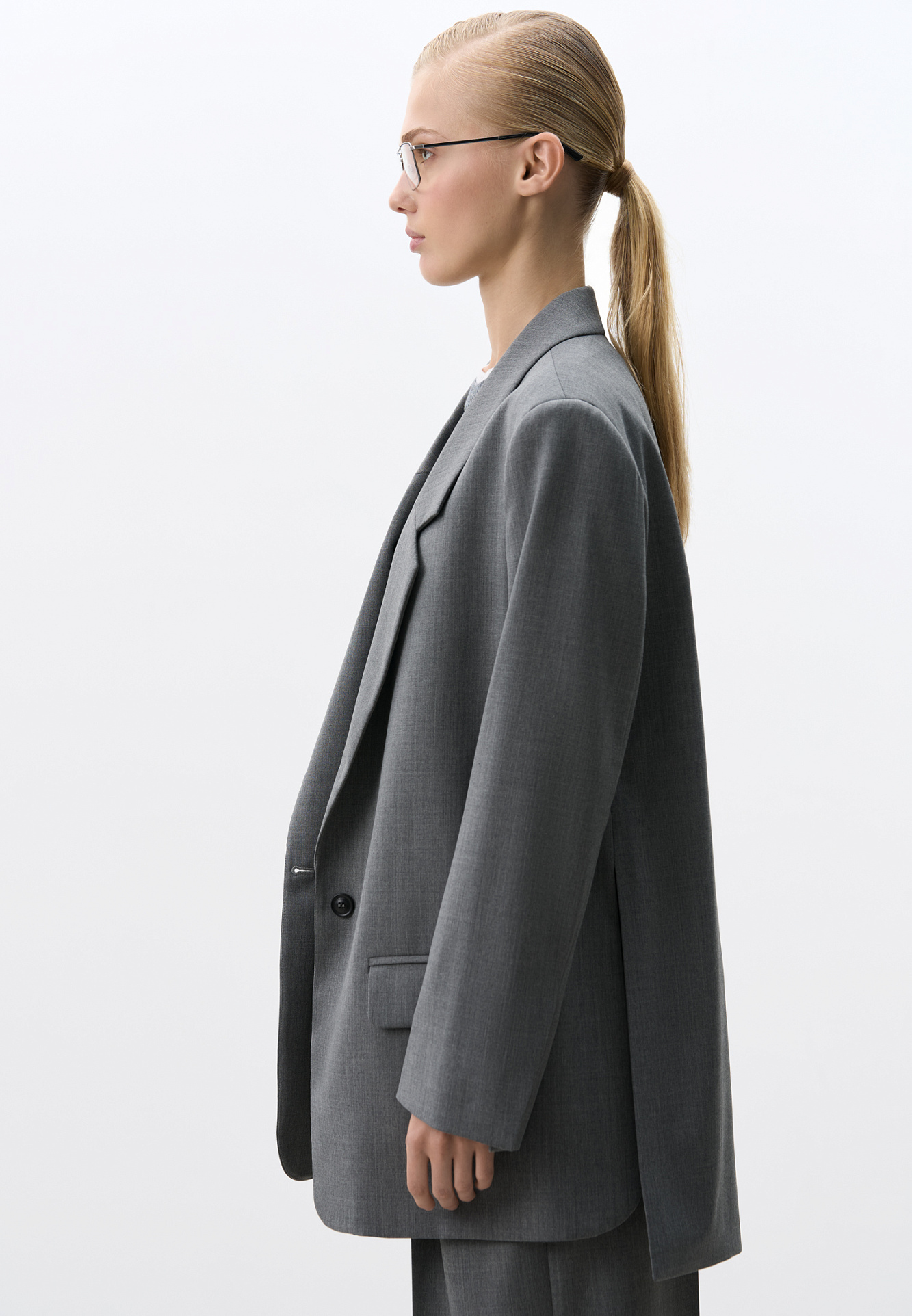 Классический жакет с накладными карманами, подплечниками, разрезами по бокам и удлиненной спинкой. Длинные рукава на манжетах без пуговиц. Застежка на пуговицу.