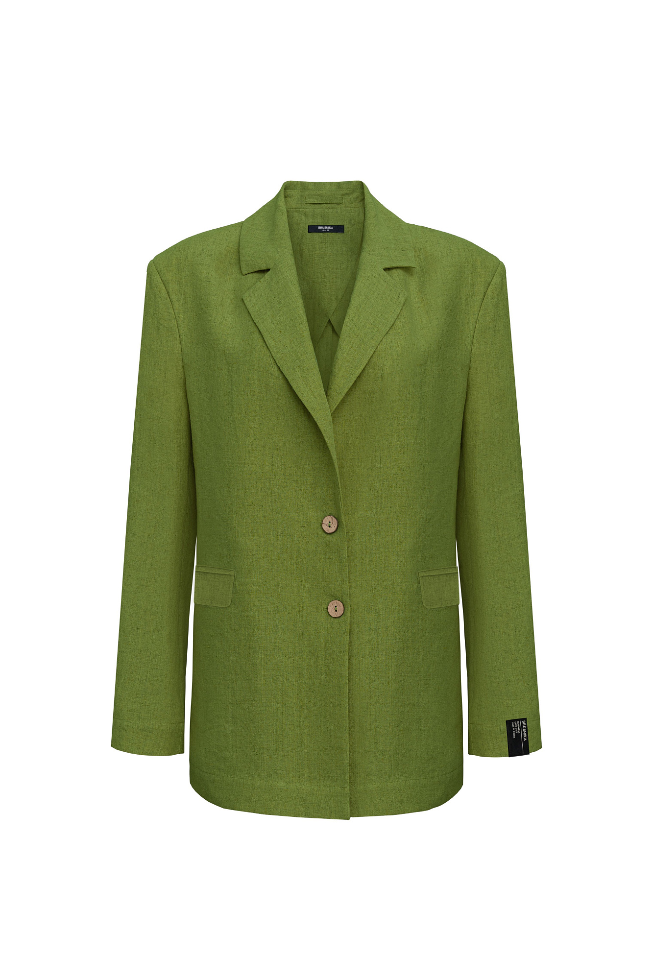 Однобортный жакет, выполненный из конопляной ткани. Модель прямого кроя, передние карманы с клапанами и брендированный ярлык на рукаве. Использование конопляной ткани придает изделию особую прочность и износостойкость, а натуральное происхождение подчеркивает экологичность данной модели.