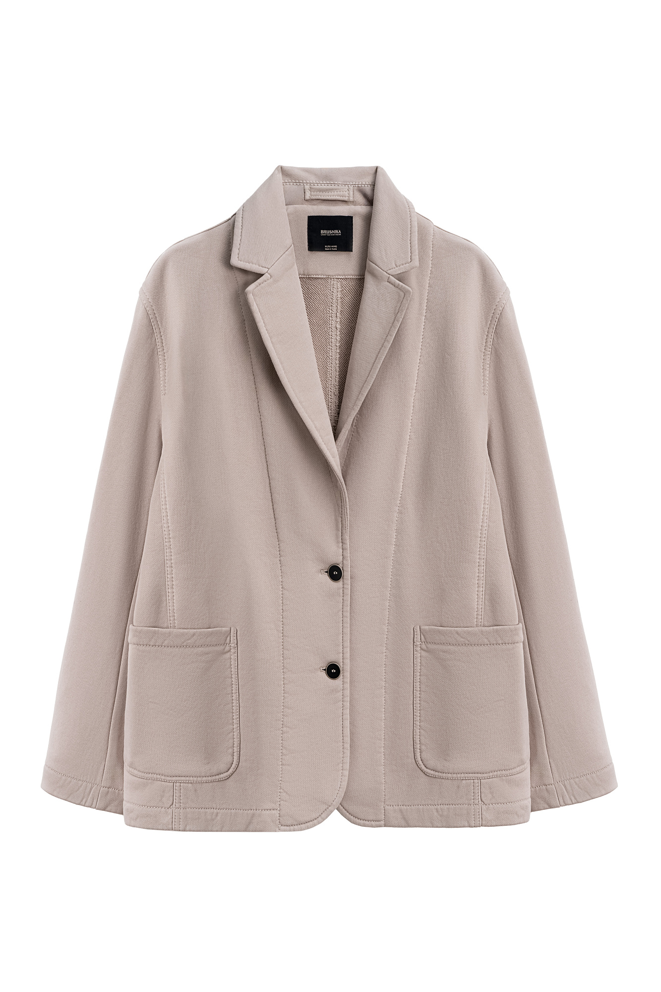 Однобортный жакет свободного силуэта. Модель с накладными карманами, спущенной линией плеча и контрастной отстрочкой. Дополнить образ можно брюками в таком же стиле.