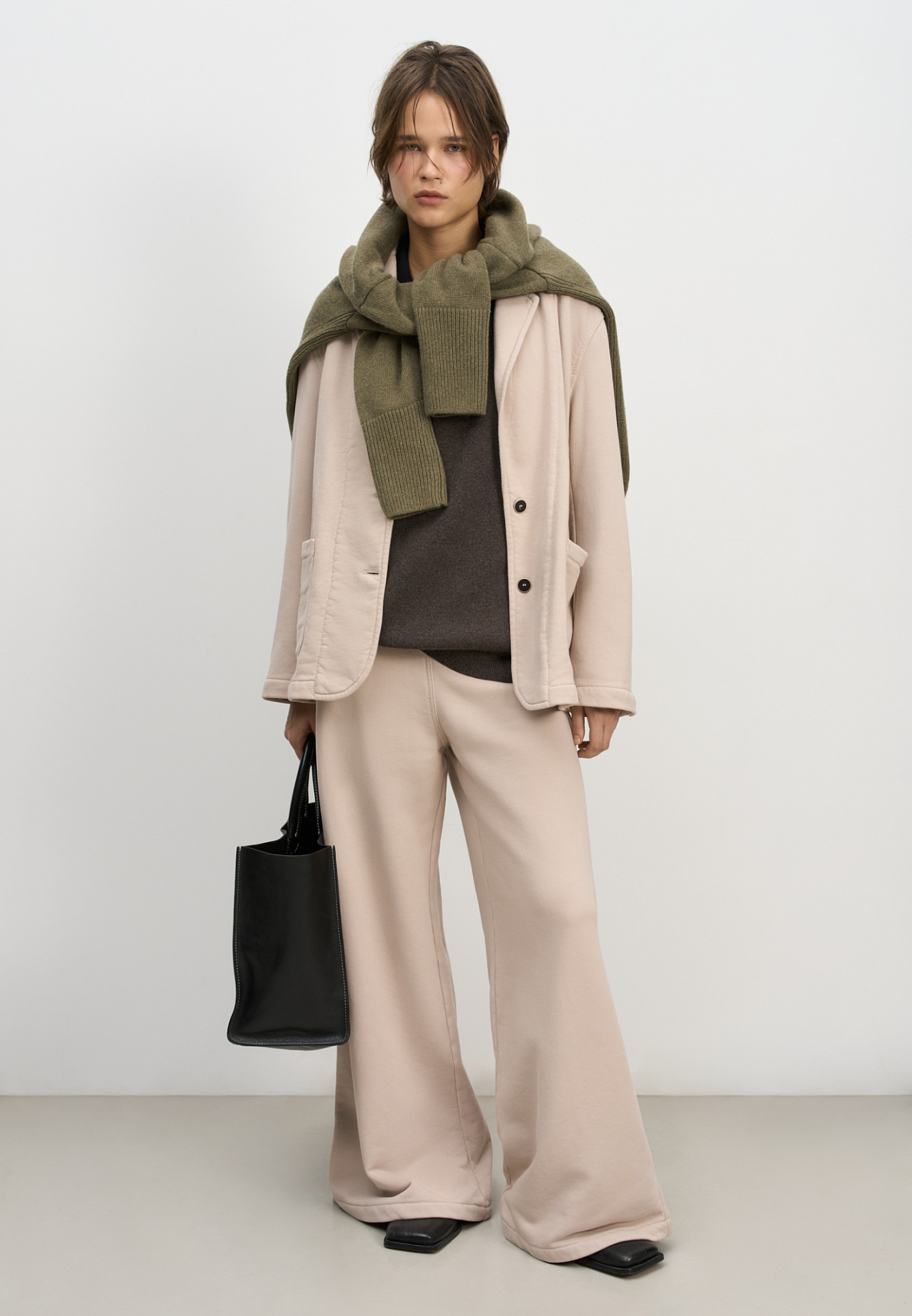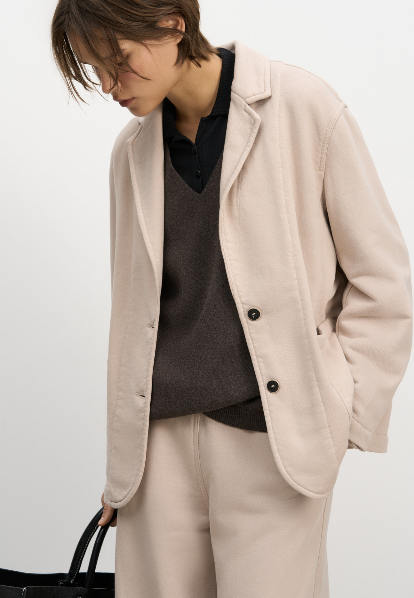 Однобортный жакет свободного силуэта. Модель с накладными карманами, спущенной линией плеча и контрастной отстрочкой. Дополнить образ можно брюками в таком же стиле.