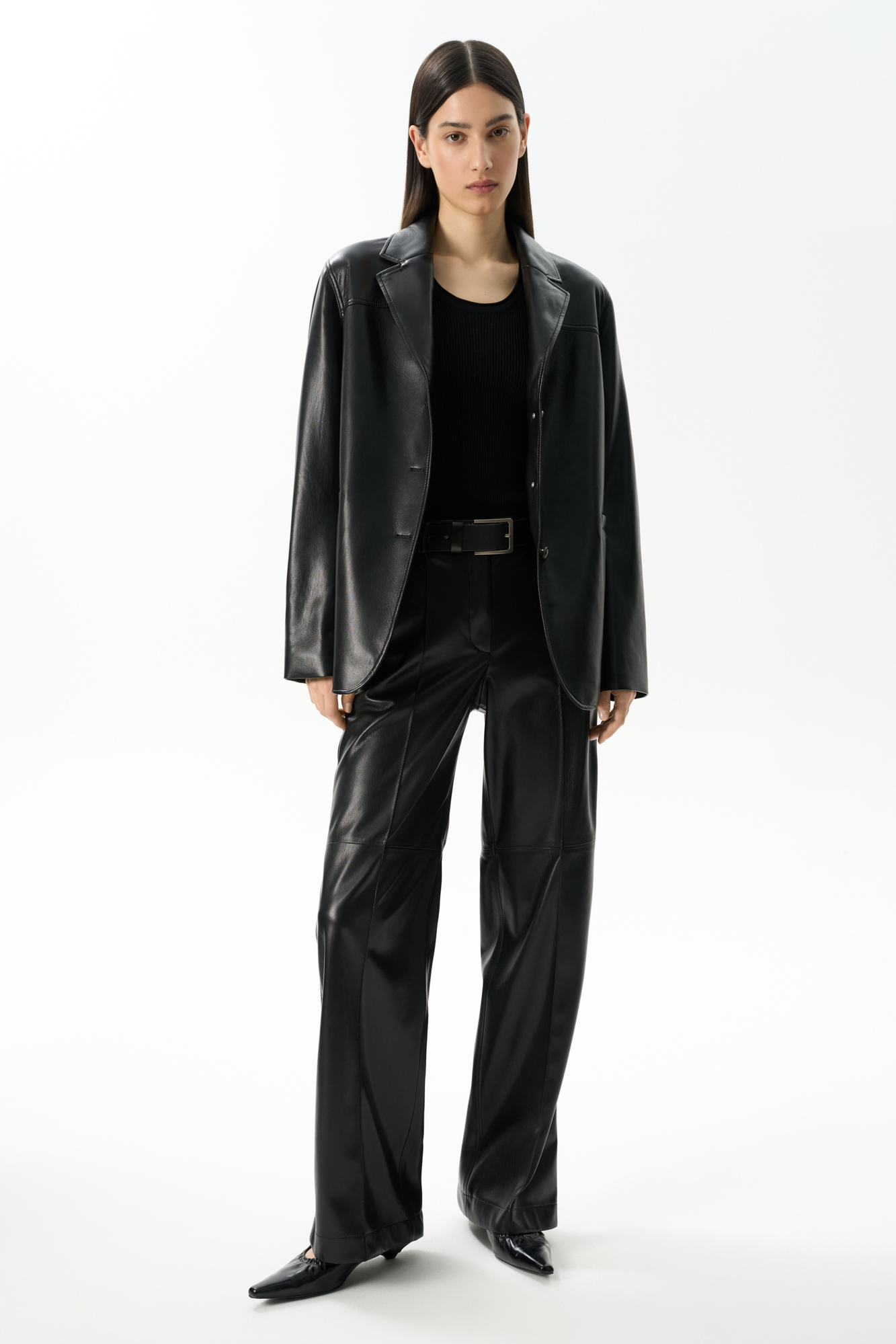Классический однобортный жакет из экокожи. Модель прямого кроя, с отложным воротником, карманам и застежкой на пуговицы. Изделие на подкладке.