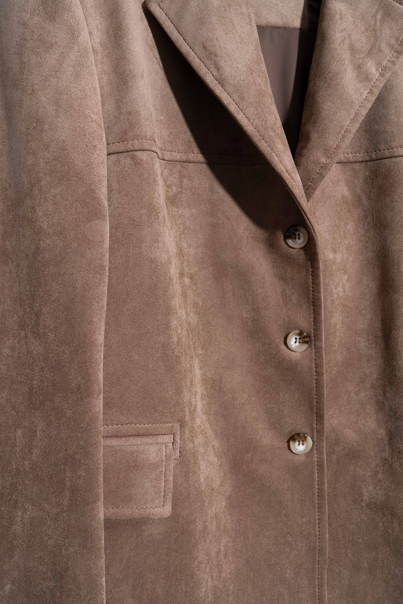 Однобортный жакет из ткани с имитацией внешнего вида и свойств натуральной замши. Модель с классическим отложным воротником и боковыми карманами с клапанами. Отделка строчкой в тон. Застежка на три пуговицы. Изделие на подкладке.
