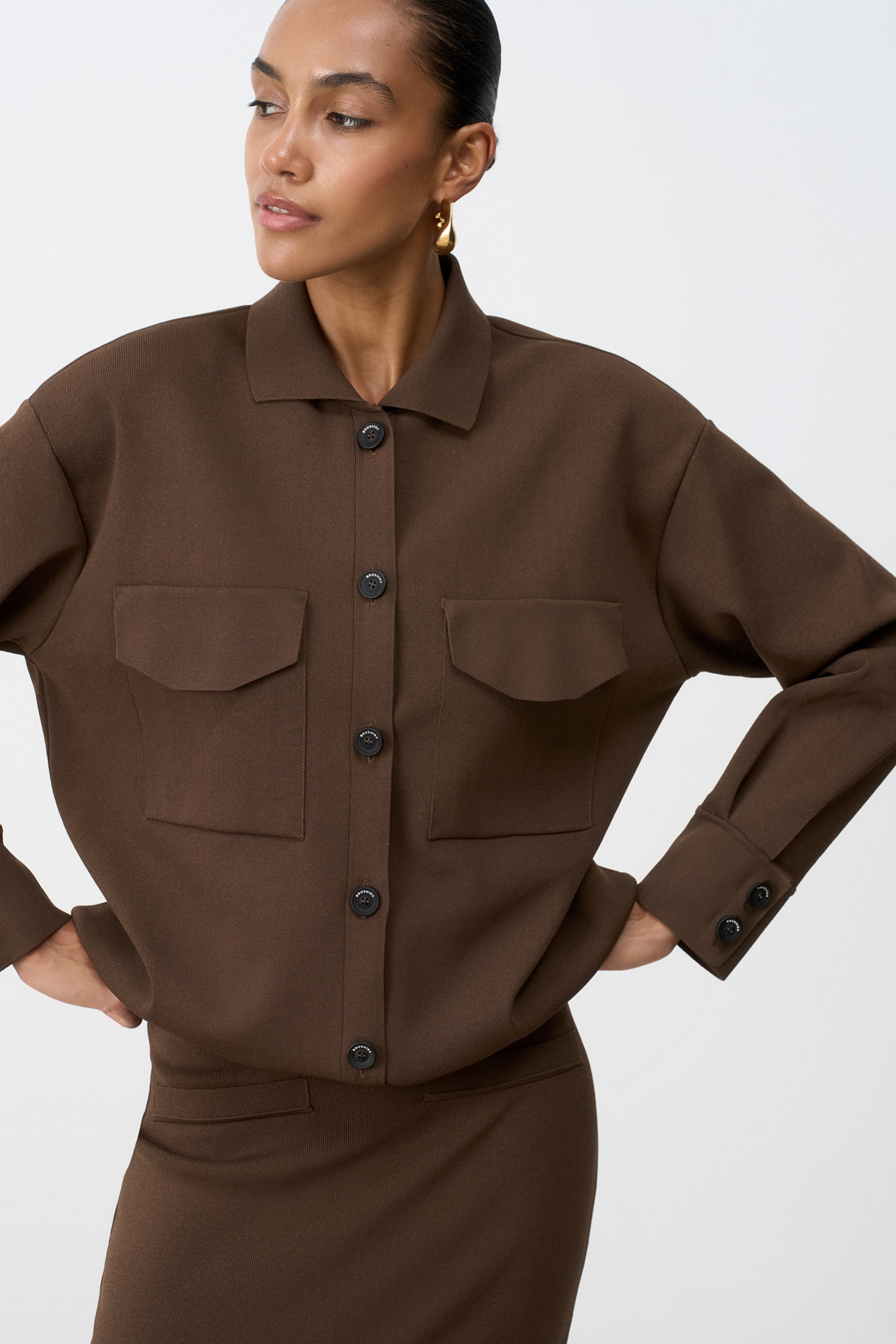 Трикотажный классический жакет из вискозы на пуговицах с накладными карманами на груди. Дополнить образ можно юбкой или брюками.