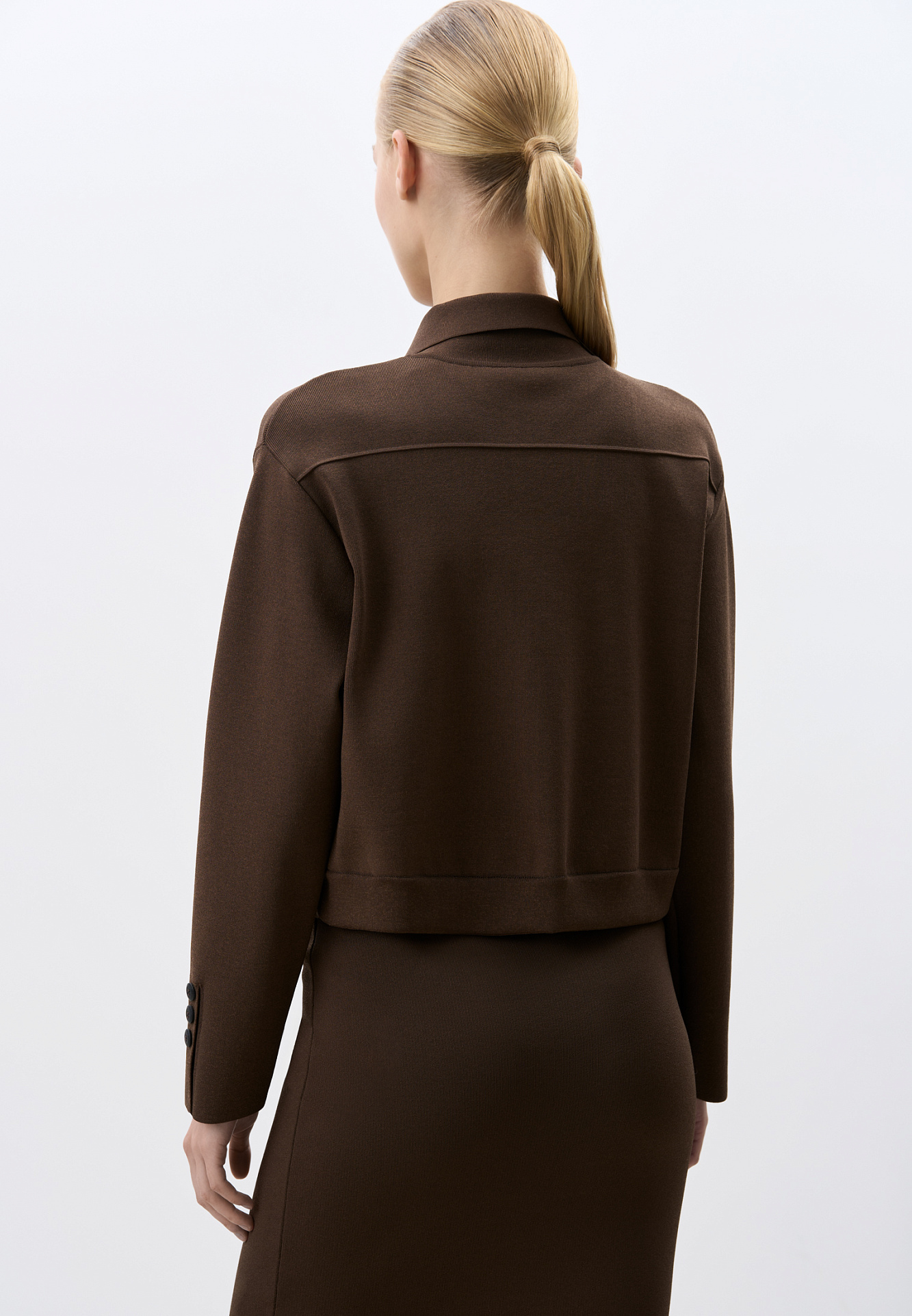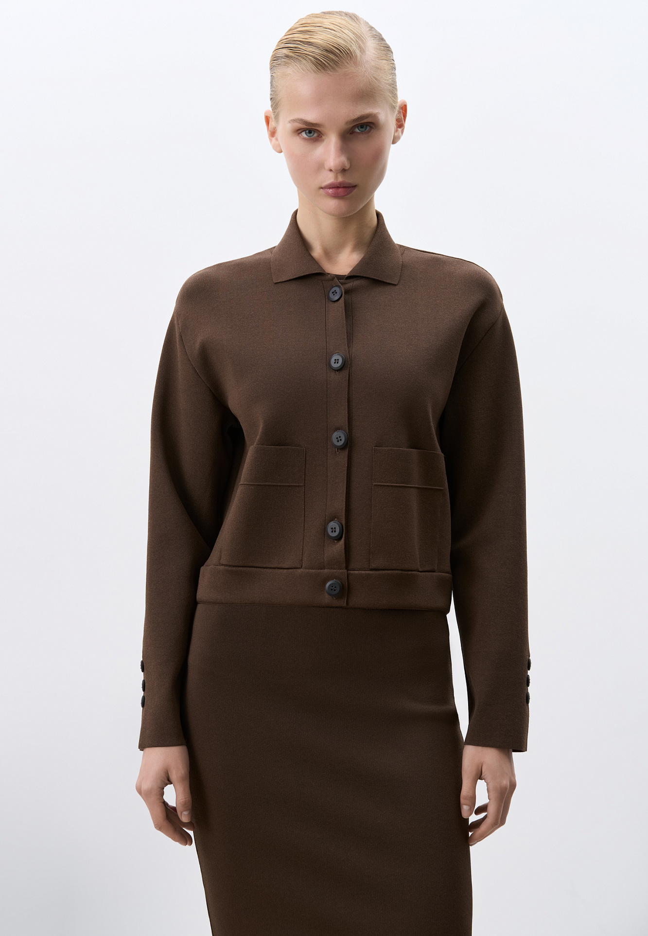 Укороченный трикотажный жакет из вискозы. Модель с отложным воротником и накладными карманам. Застежка на пуговицы. Изделие выполнено без подкладки.