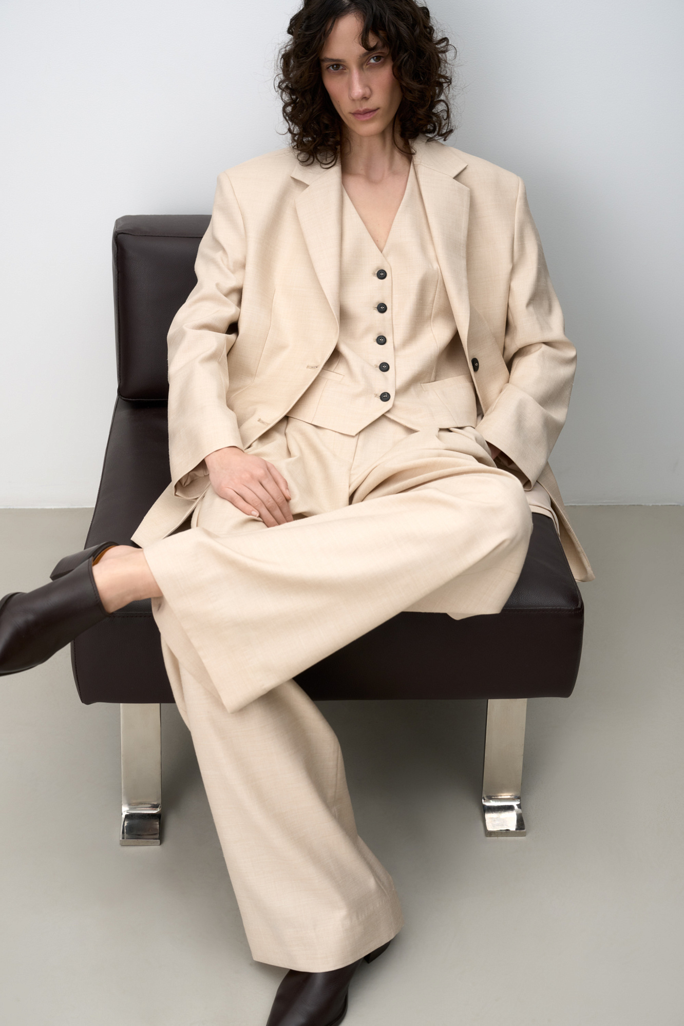 Классический однобортный жакет из шерсти с текстурой. Модель прямого кроя, с прямоугольными лацканами, карманами с клапанами и манжетами на пуговицах. Застежка на две пуговицы. Изделие выполнено на подкладке. Дополнить образ можно жилетом и брюками в таком же стиле.