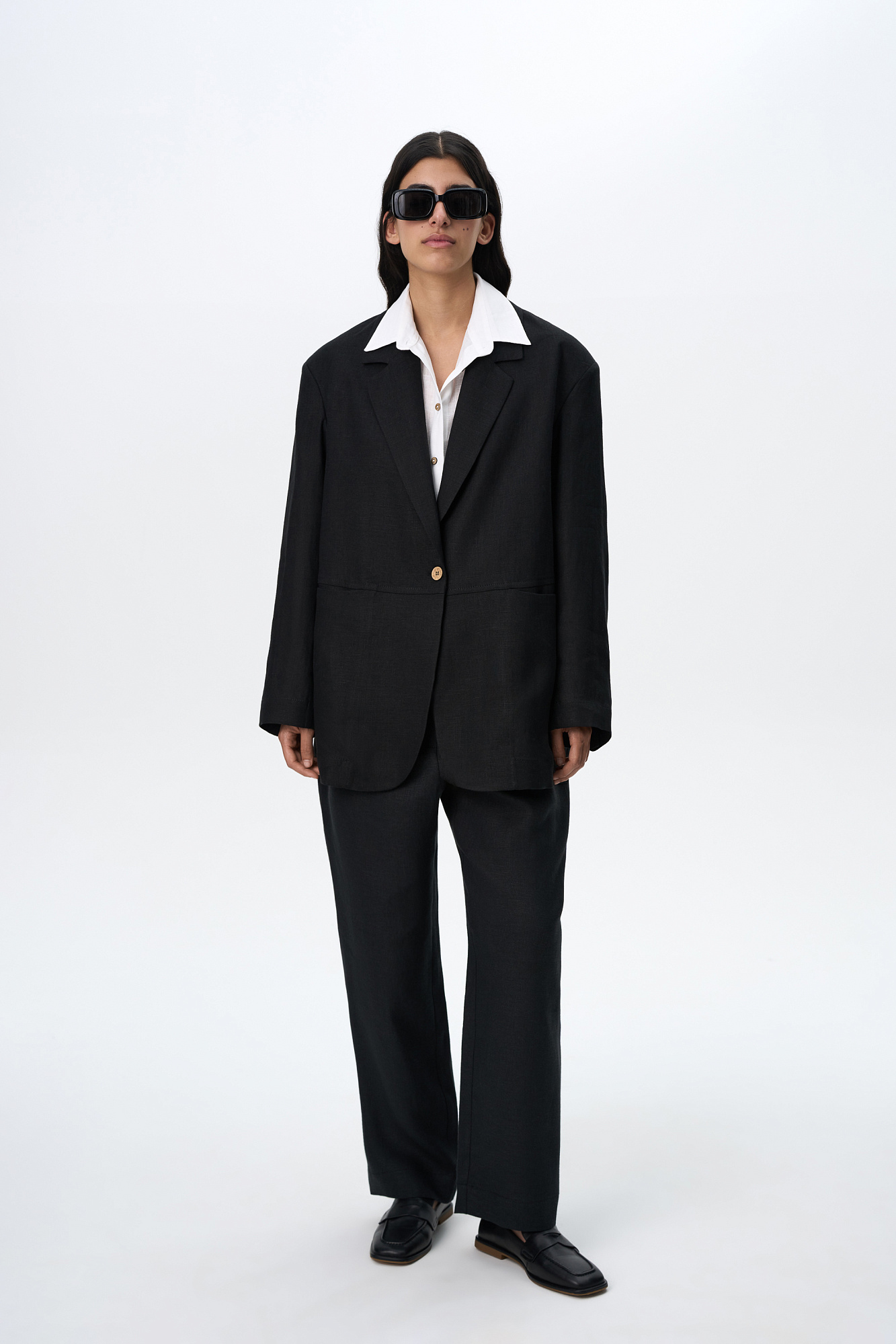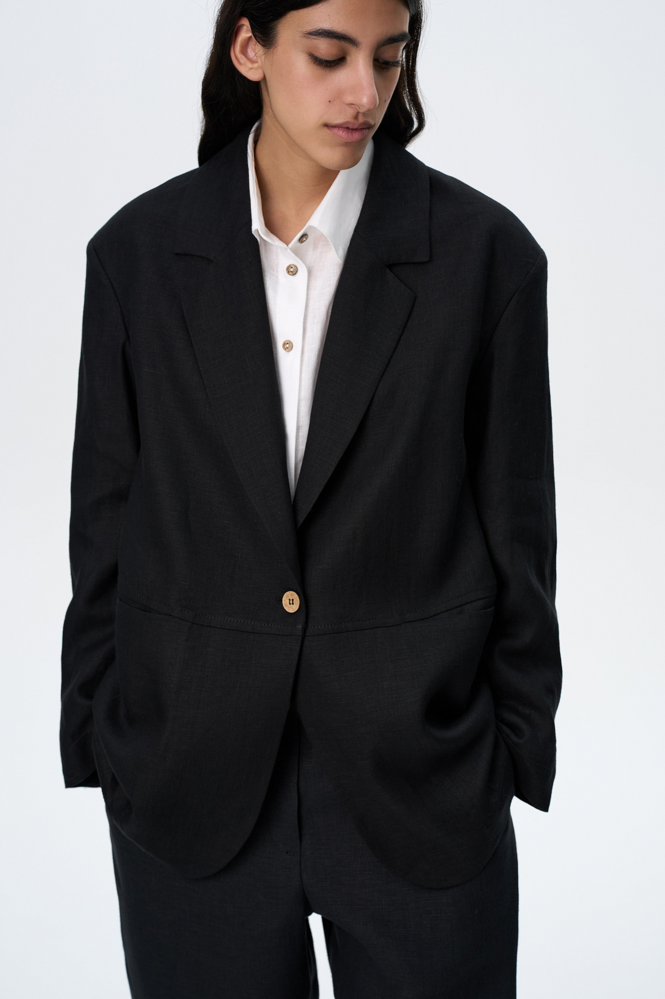 Однобортный жакет из 100% льна. Модель свободного силуэта с англиским воротником и прорезными карманами спереди. Застежка на одну пуговицу. Дополнить образ можно брюками в таком же стиле.