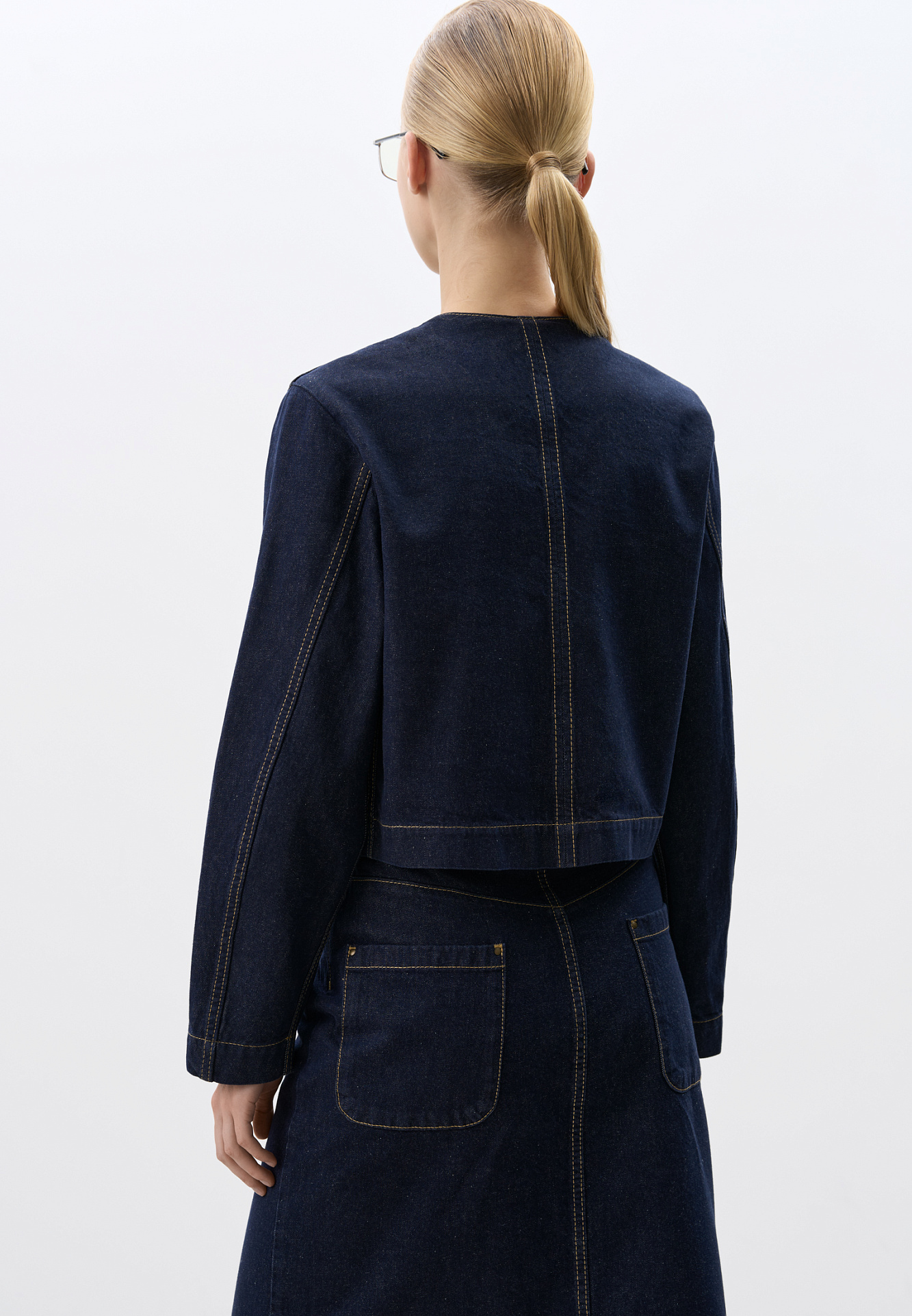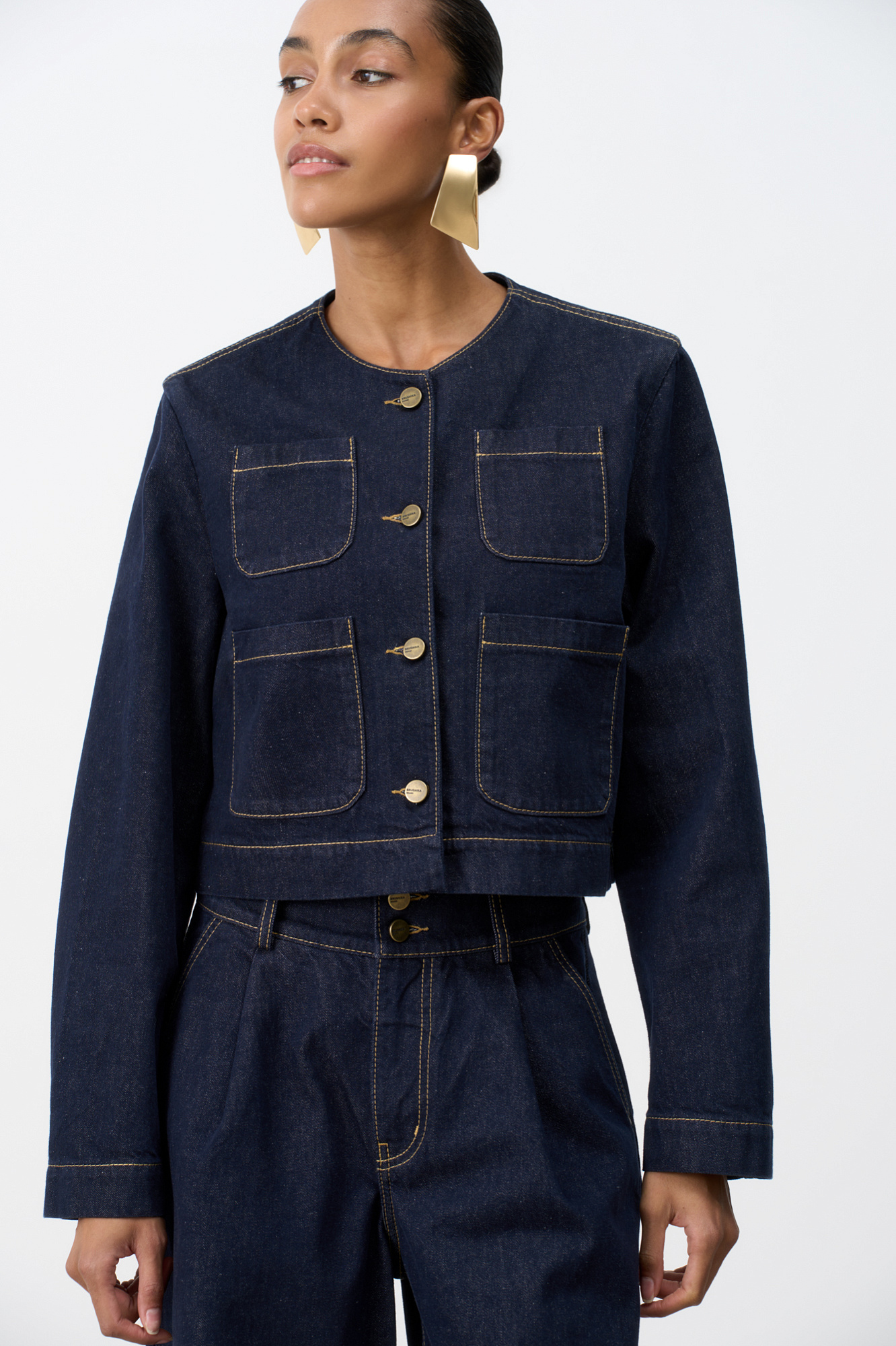 Укороченный джинсовый жакет из 100% хлопка. Модель прямого кроя, с накладными карманами и застежкой на металлические пуговицы. Изделие без подкладки. Дополнить образ можно джинсами.