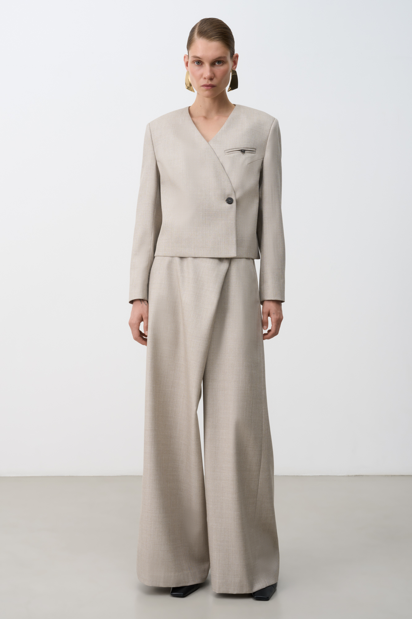 Укороченный жакет на запах. Модель приталенного силуэта с карманом на груди. Застежка на пуговицу. Дополнить образ можно брюками в таком же стиле.