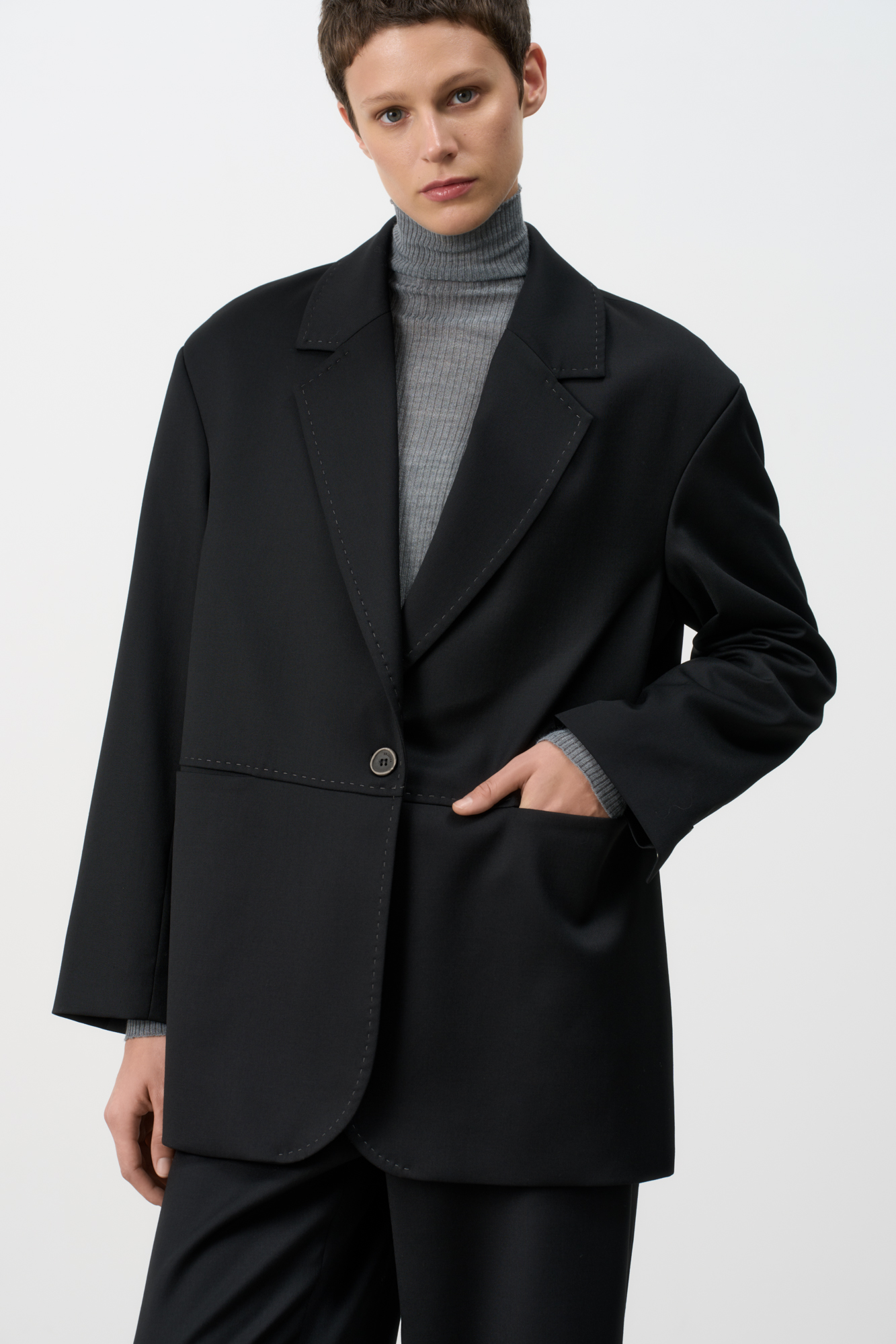 Однобортный жакет с карманами спереди. Модель свободного силуэта со спущенной линией плеча. Дополнить образ можно брюками в таком же стиле.