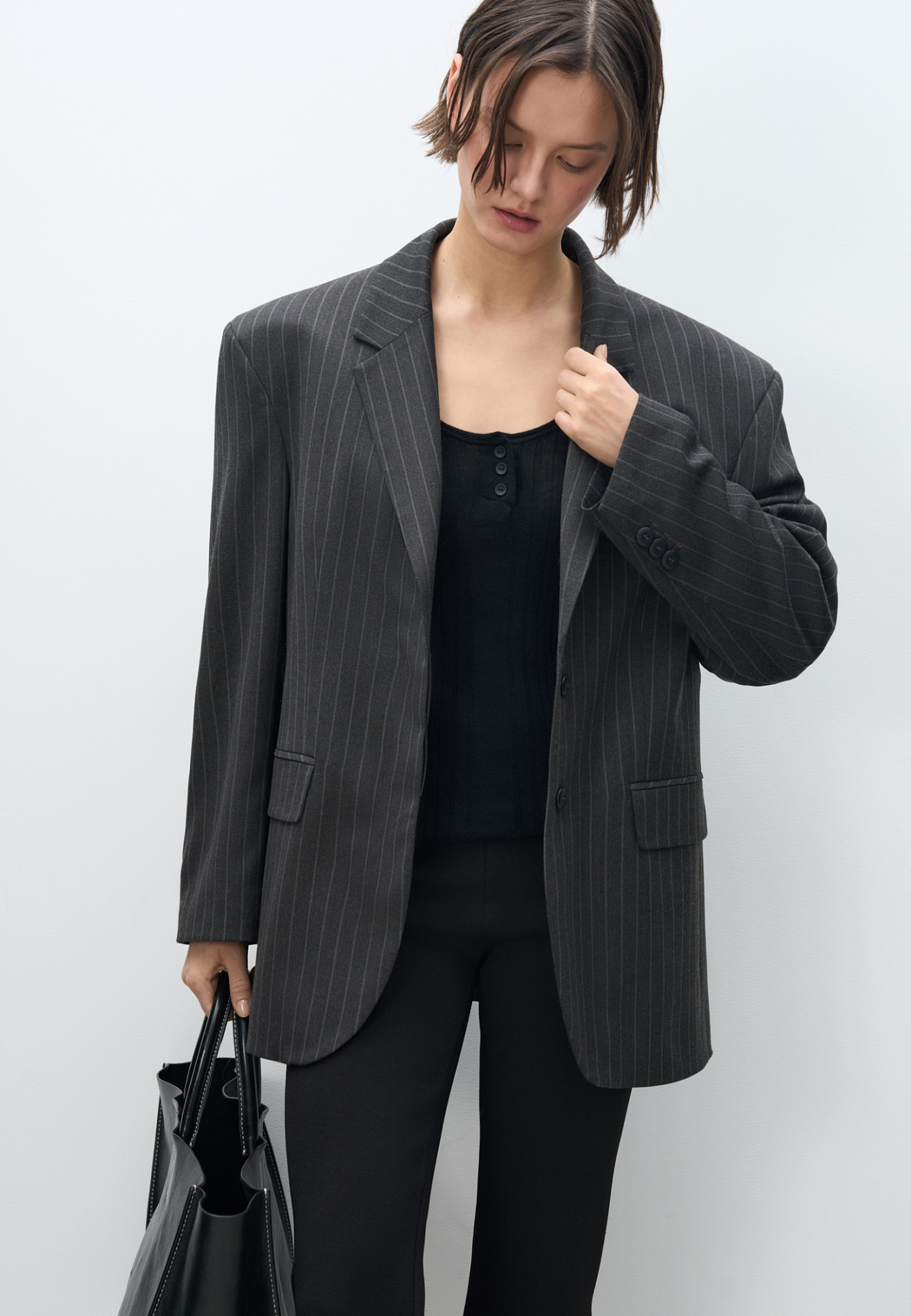 Однобортный жакет в полоску. Модель прямого кроя, с узкими лацканами, нагрудным карманом, боковыми карманами с клапанами и пуговицами на рукавах. Застежка на скрытые пуговицы под планкой. Изделие выполнено на подкладке.