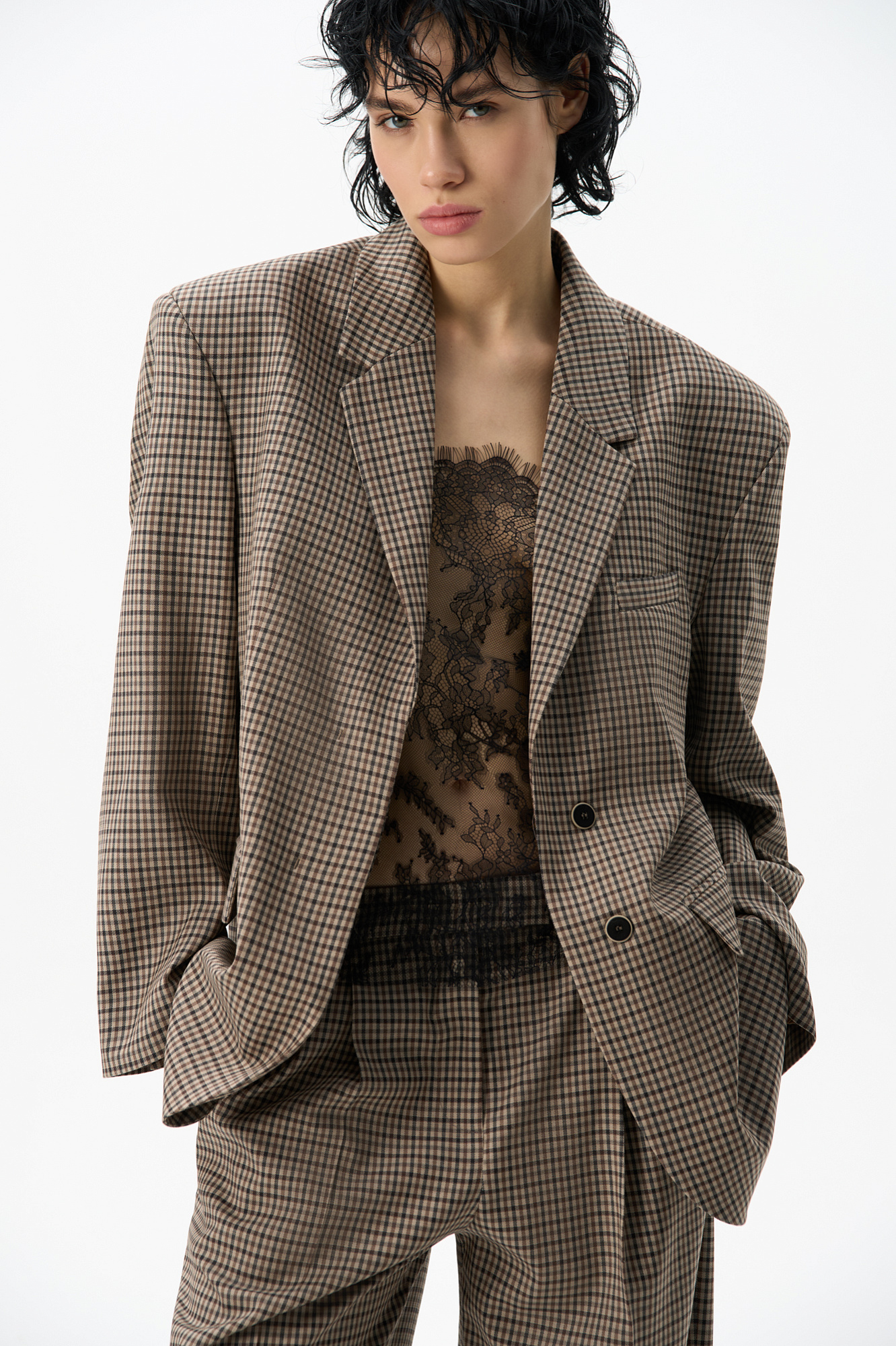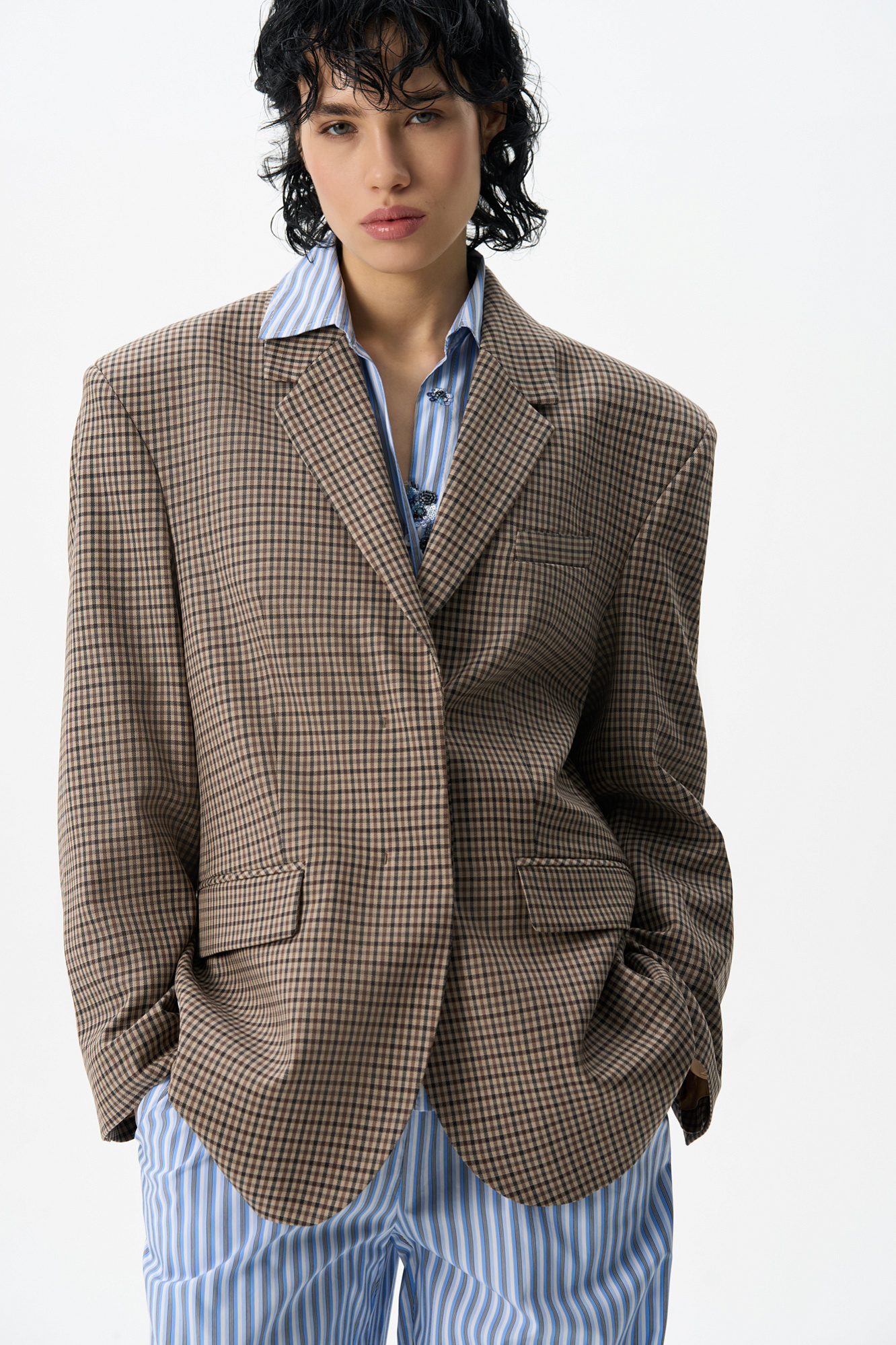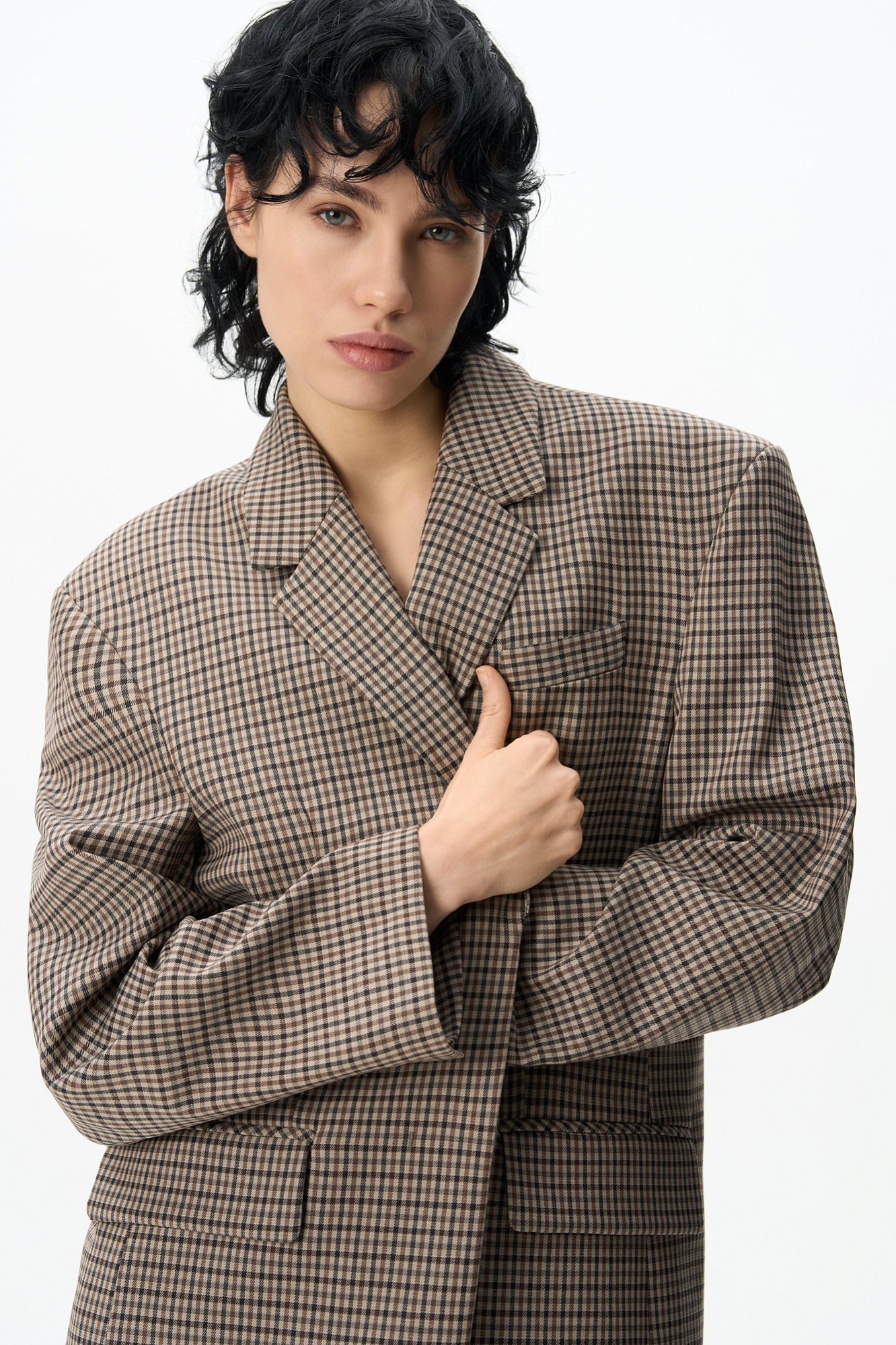 Однобортный жакет в клетку виши из шерсти. Модель прямого кроя с узкими лацканами, подплечниками, боковыми карманами с клапанами и карманом на груди. Изделие выполнено на подкладке. Дополнить образ можно юбкой или брюками.