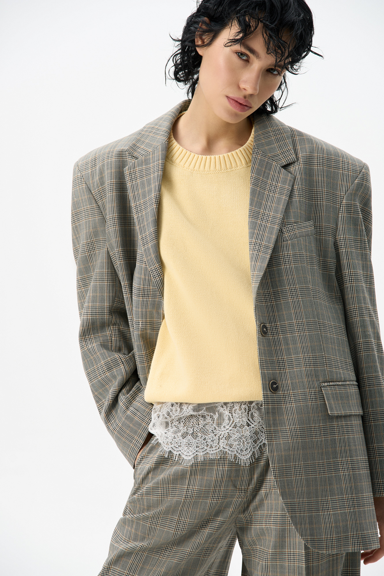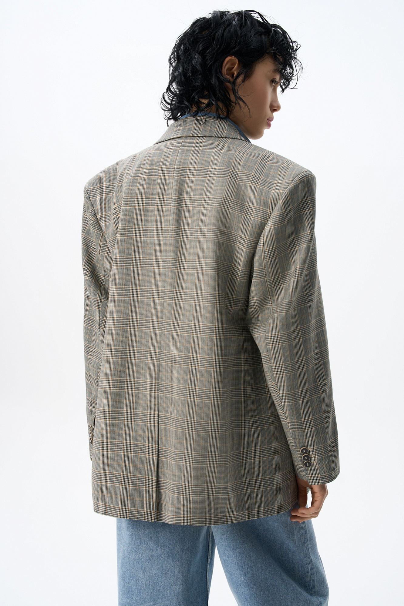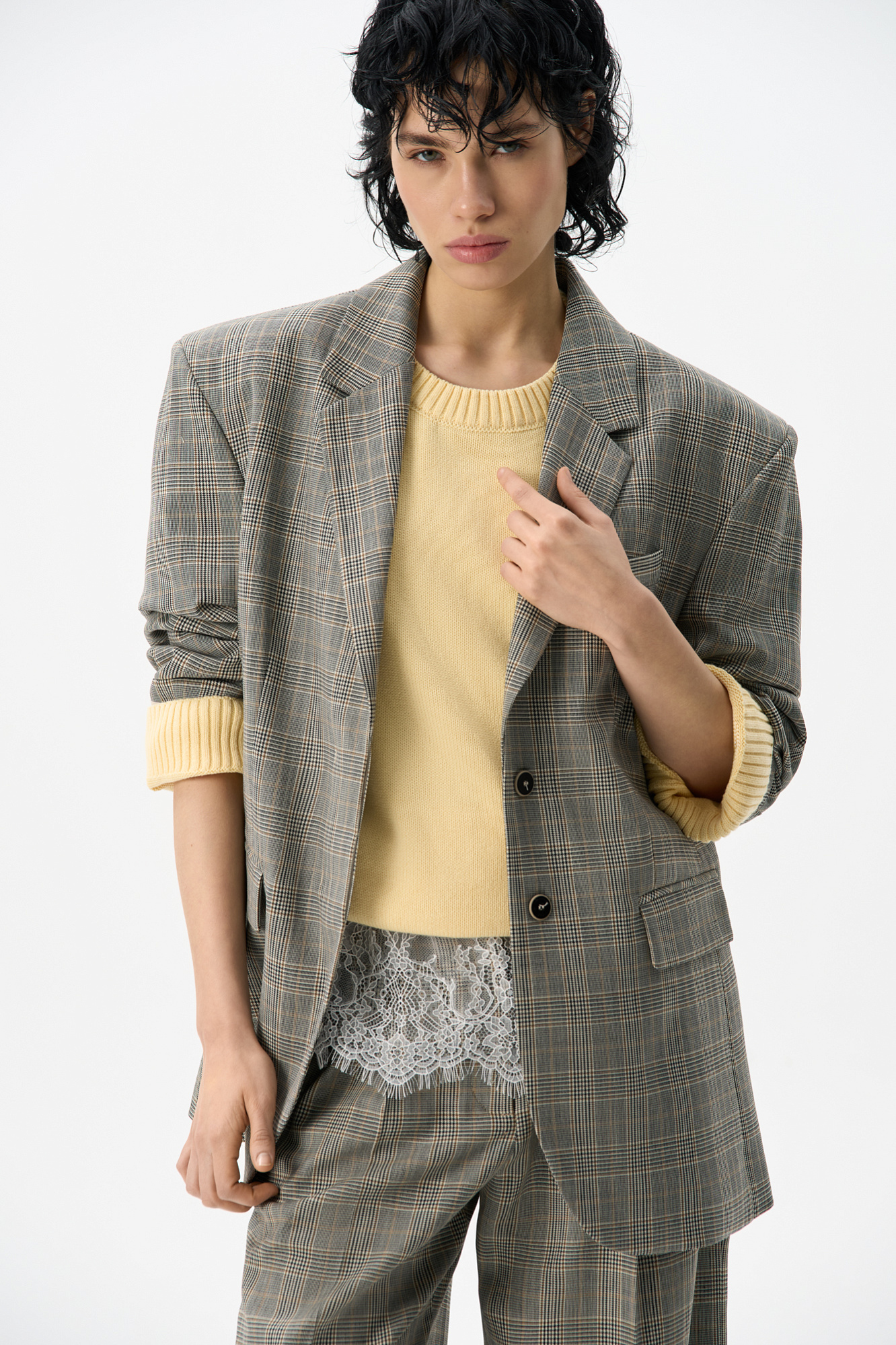 Однобортный жакет в клетку гленчек. Модель прямого кроя с лацканами, боковыми карманами с клапанами и нагрудным карманом. Застежка на две пуговицы. Изделие выполнено на подкладке.