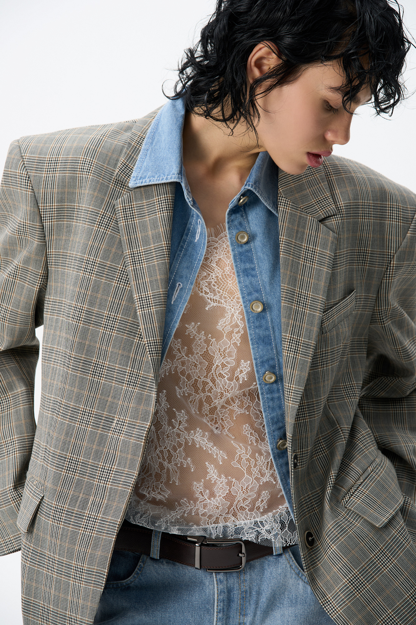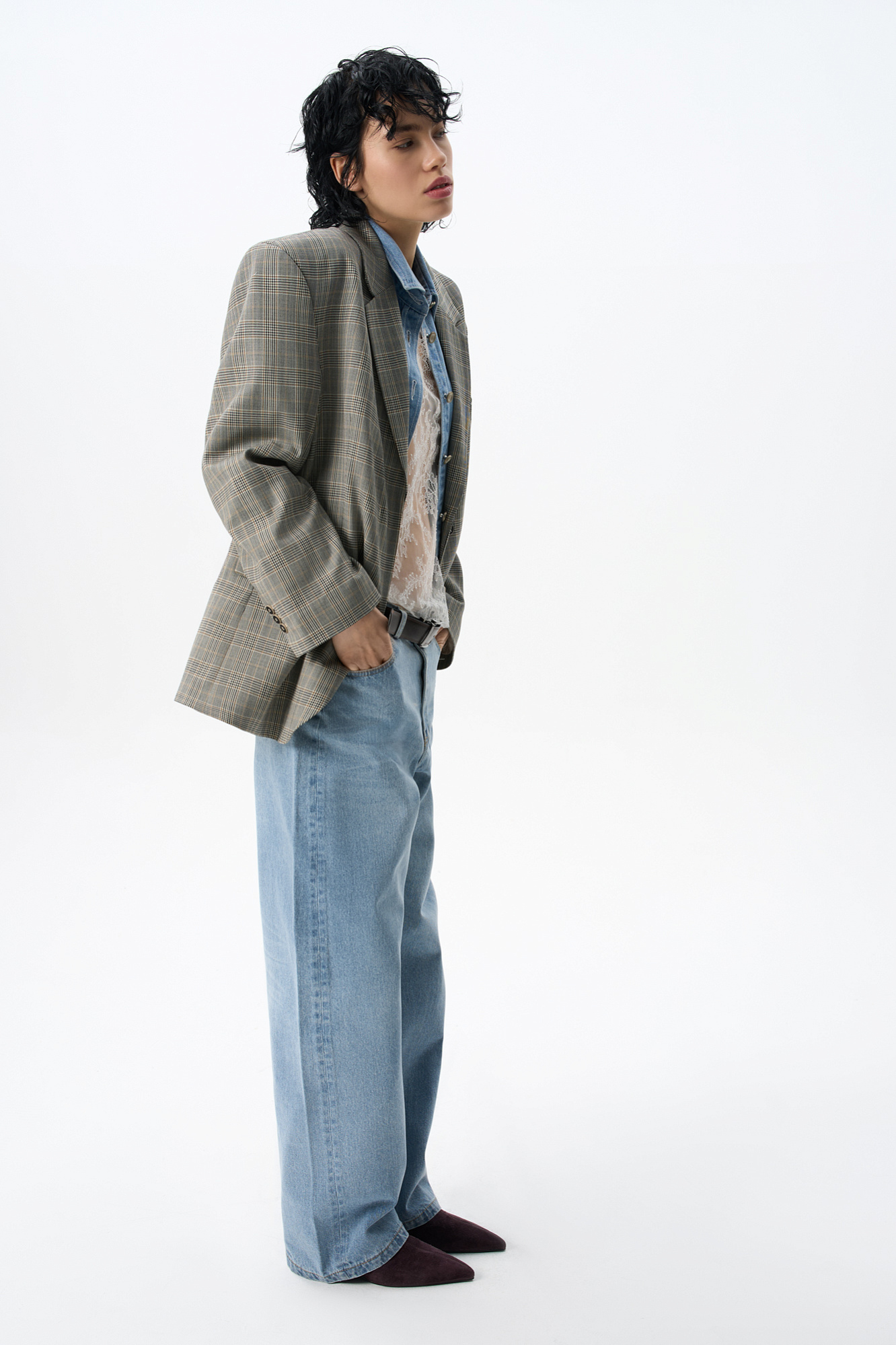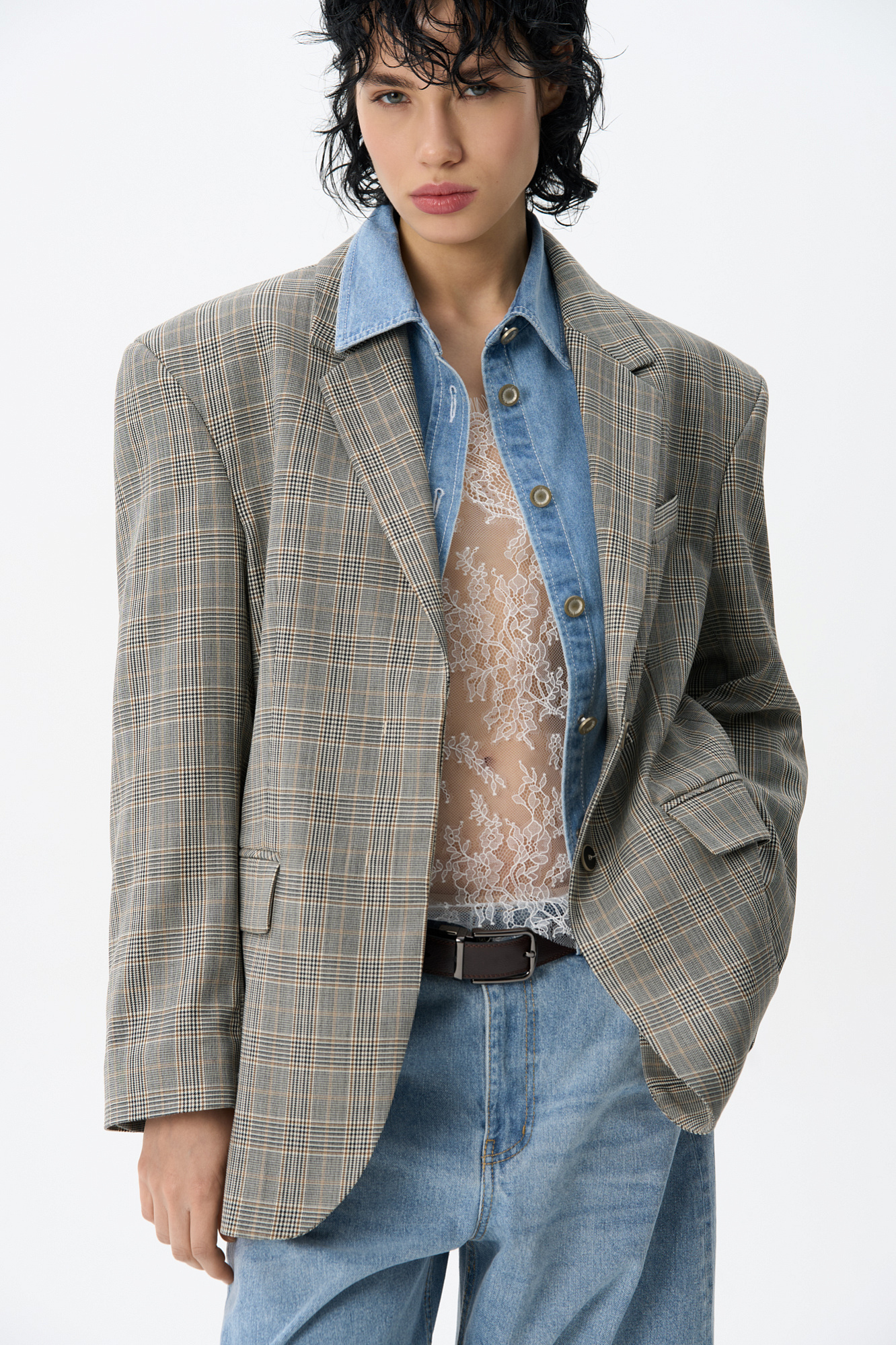 Однобортный жакет в клетку гленчек. Модель прямого кроя с лацканами, боковыми карманами с клапанами и нагрудным карманом. Застежка на две пуговицы. Изделие выполнено на подкладке.