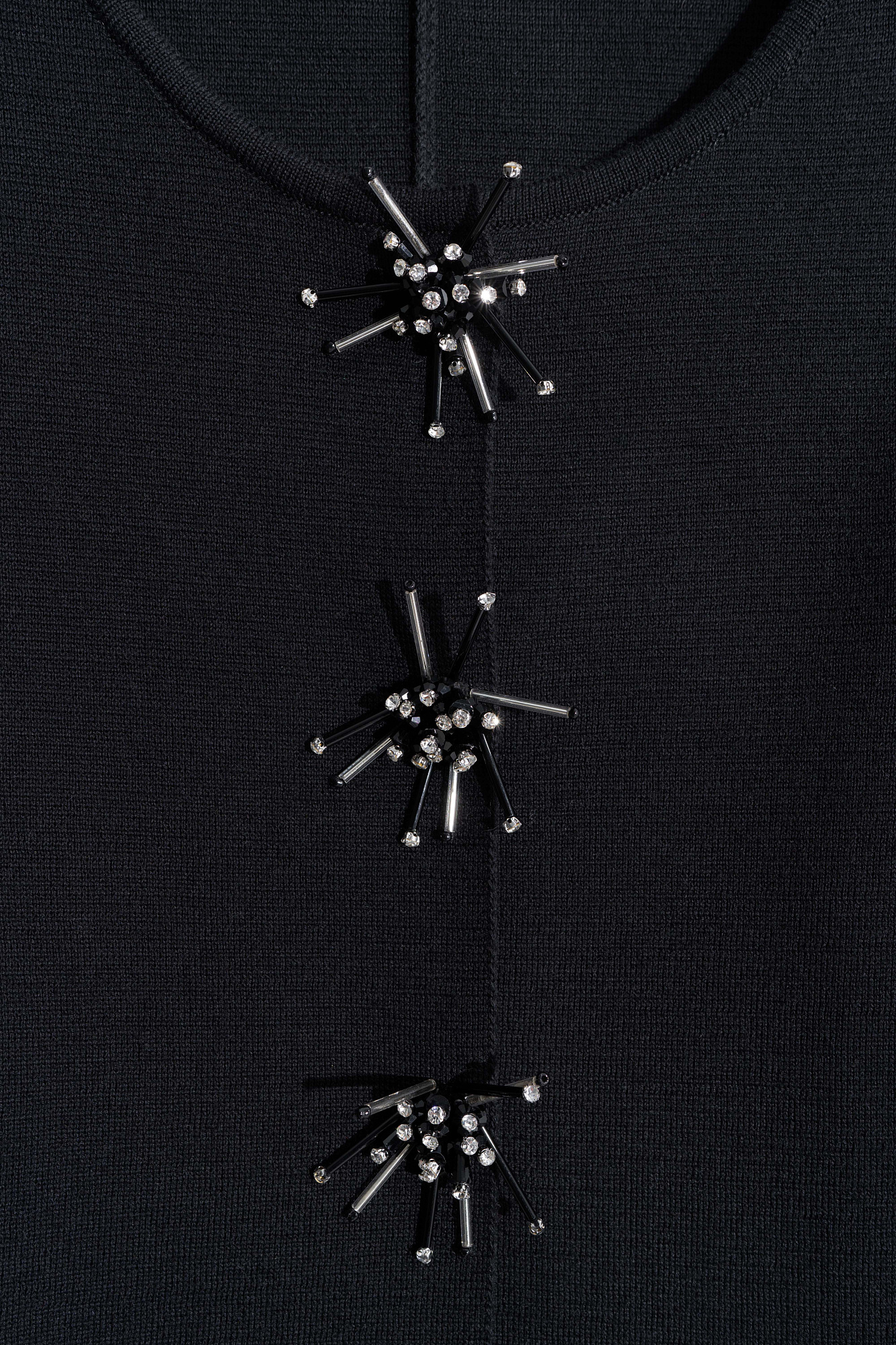 Трикотажный жакет из шерсти. Модель свободного силуэта с широкими рукавами и круглым вырезом горловины без лацканов. Застежка на магнитные кнопки. Изделие декорировано аппликацией из стекляруса и страз.