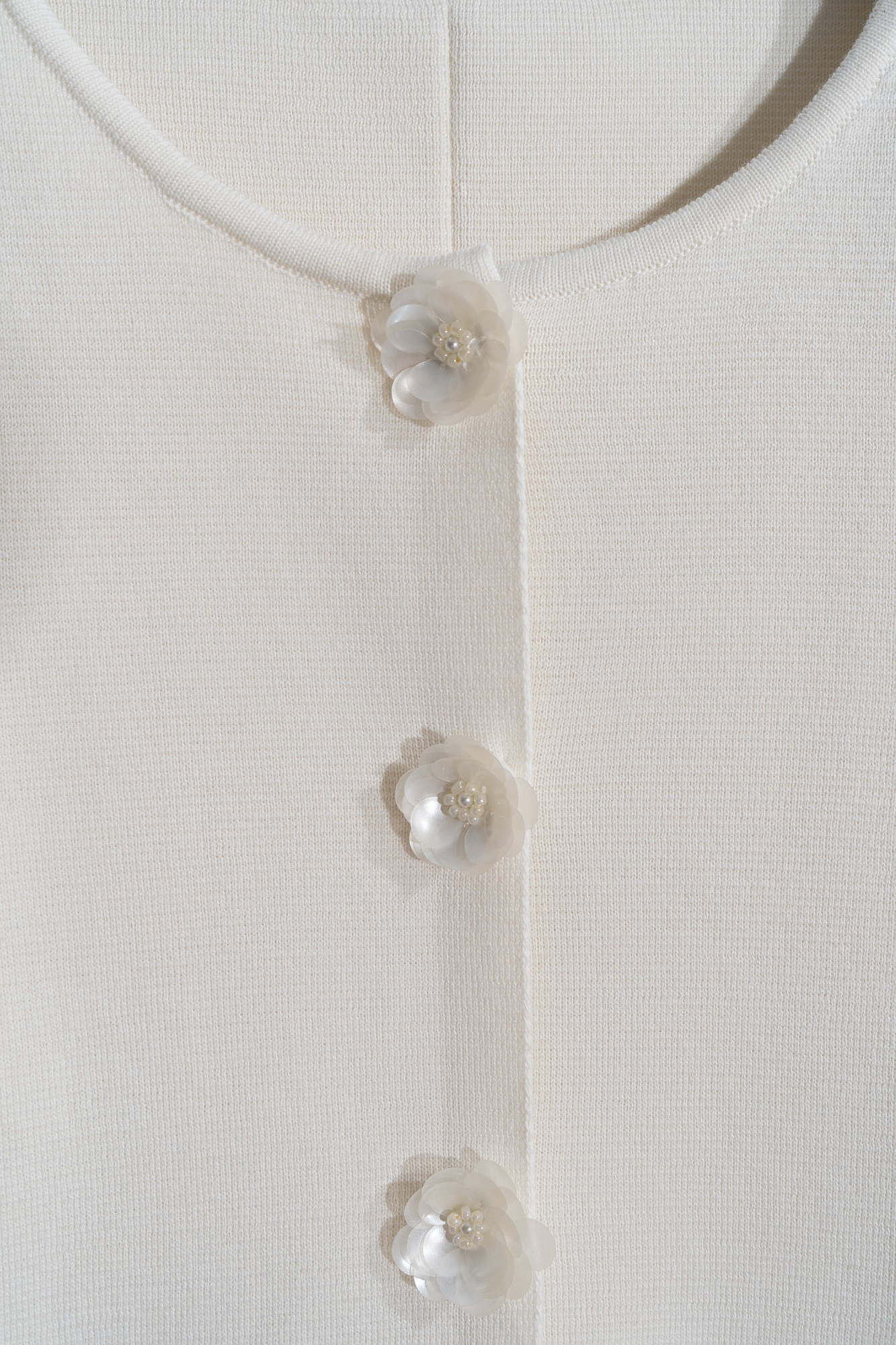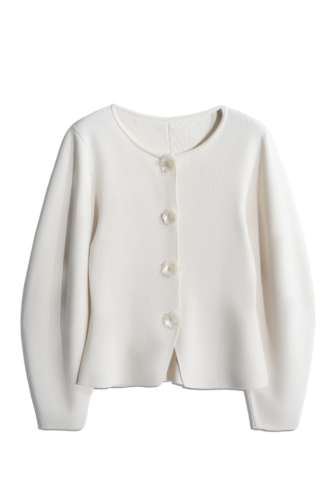 Трикотажный жакет из шерсти. Модель свободного силуэта с широкими рукавами и круглым вырезом горловины без лацканов. Застежка на магнитные кнопки. Изделие декорировано аппликацией из стекляруса и страз.