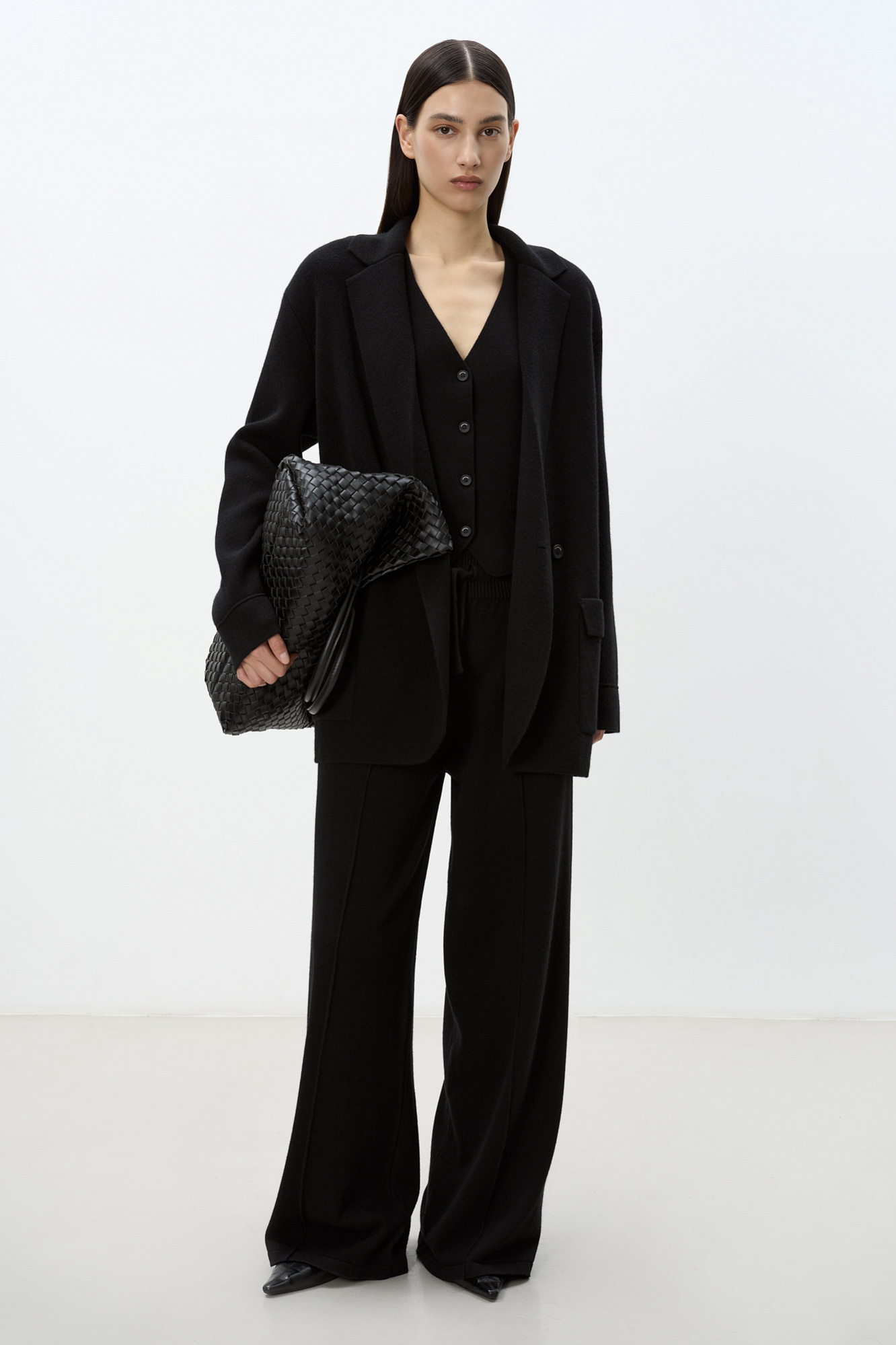 Трикотажный двубортный жакет из смесовой шерсти с добавлением кашемира. Модель прямого кроя, с прямоугольными лацканами и накладными карманами с клапанами спереди. Изделие без подкладки.