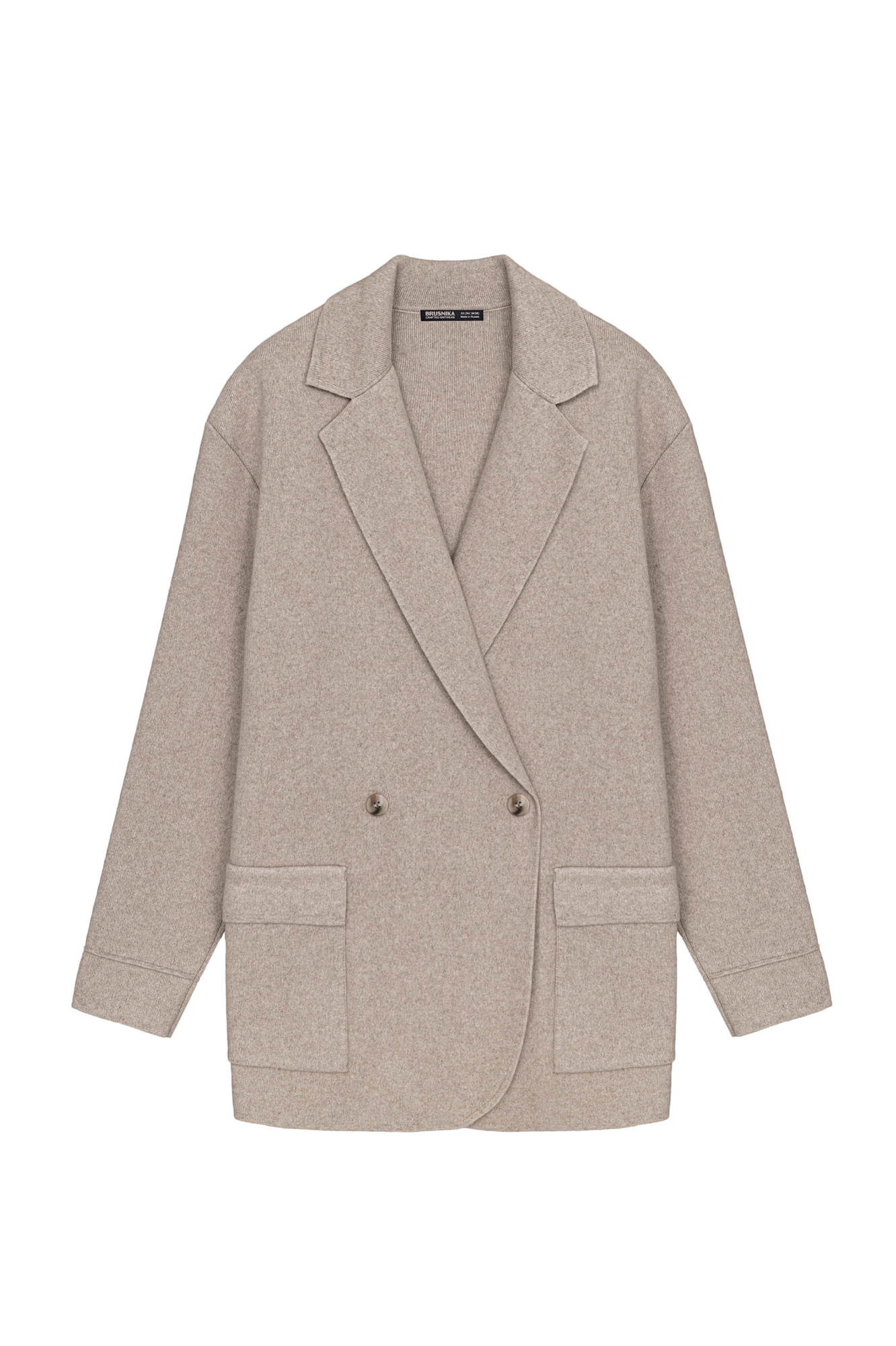 Трикотажный двубортный жакет из смесовой шерсти с добавлением кашемира. Модель прямого кроя, с прямоугольными лацканами и накладными карманами с клапанами спереди. Изделие без подкладки.
